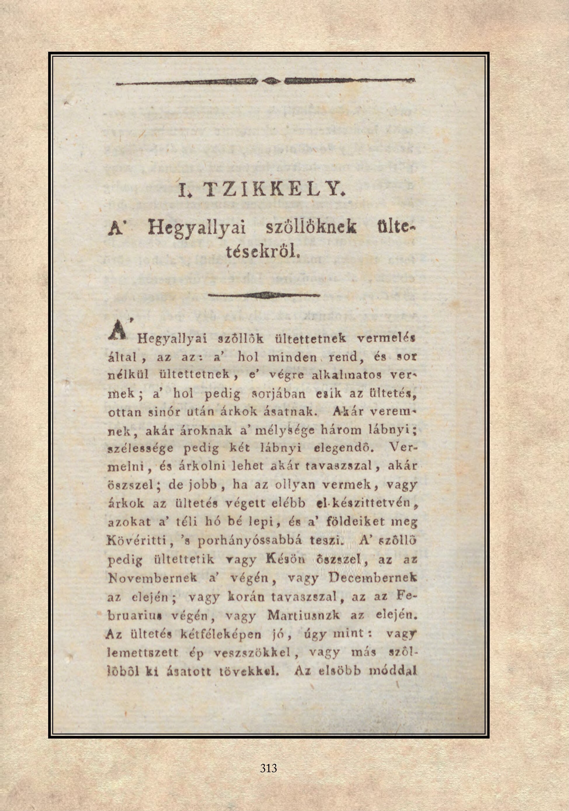 I. TZIKKELY. À Hegyallyai szöllöknek tiltetesekröl, en p A Hegyallyai szöllök ültettetnek vermelés által, az az: a" hol minden. rend, és. sor nélkül ültettetnek, e" végre alkalmatos vers mek; a hol pedig sorjában esik az ültetés, ottan sinór után árkok ásatnak. Akár verem nek, akár ároknak a" mélysége három lábnyi; szélessége pedig két lábnyi elegendő. Vermelni, és árkolni lehet akár tavaszszal, akár öszszel; de jobb, ha az ollyan vermek, vagy árkok az ültetés végett elébb el-készittetvén, azokat a? téli hó bé lepi, és a" földeiket meg Köveritti, "s porhányóssabbá teszi. A" szöllö pedig ültettetik vagy Késön öszszel, az az Novembernek a’ végén, vagy Decembernek az elején; vagy koran tavaszszal, az az Februarius végén, vagy Martiusnzk az elején. Az iiltetés kétféleképen jó, úgy mint: vagy lemettszett ép veszszökkel, vagy más szöllöből ki ásatott tövekkel. Az elsöbb móddal 313