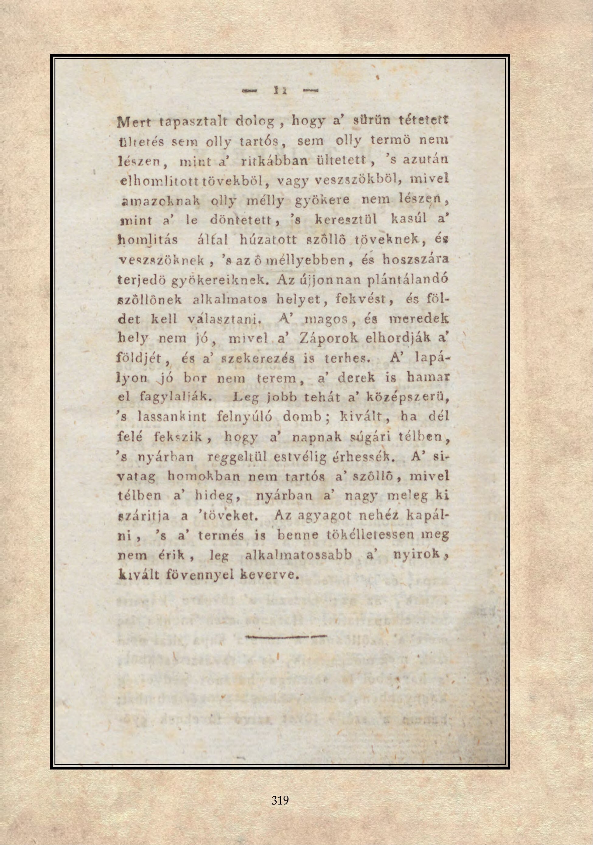 Mert tapasztalt dolog , hogy a? sürün tétetett ültetés sem olly tartós, sem olly termö nemi lészen, minta" ritkábban ültetett, ’s azután elhomlitotttövekböl, vagy veszszökböl, mivel amazoknak ollÿ mélly- gyôkere nem. lészen , mint a’ le döntetett, 7s keresztül kasúl a’ homlitäs älfal hüzatott szöllö töveknek, €s veszaziknek , ’sazéméllyebben, és hoszszara terjedé gyékereiknek, Az djjonnan pläntälandö szöllönek alkalmatos helyet, fekvést, és földet kell választani. A! magos, és meredek hely nem j6, mivel,a’ Zäporok elhordják a földjét, és a’ szekerezes is terhes,. A’ lapalyon, jd bor nem terem, a’ derek is hamar el fagylaliäk. Leg jobb tehät a’ közepszerü, ’s lassankint felnyülö.domb; kivält, ha del felé fekszik, hogy a! napnak súgari télben, "s nyárban reggeltül estvélig érhessék. . A? sic vatag homokban nem tartös a’ szöllö, mivel télben a’ hideg, nyárban a!" nagy meleg ki száritja a "töveket. Az agyagot nehéz kapálni, ’s a’ termes is benne tökelletessen meg nem érik, leg alkalmatossabb a’ nyirok, kivált fövennyel keverve. 319