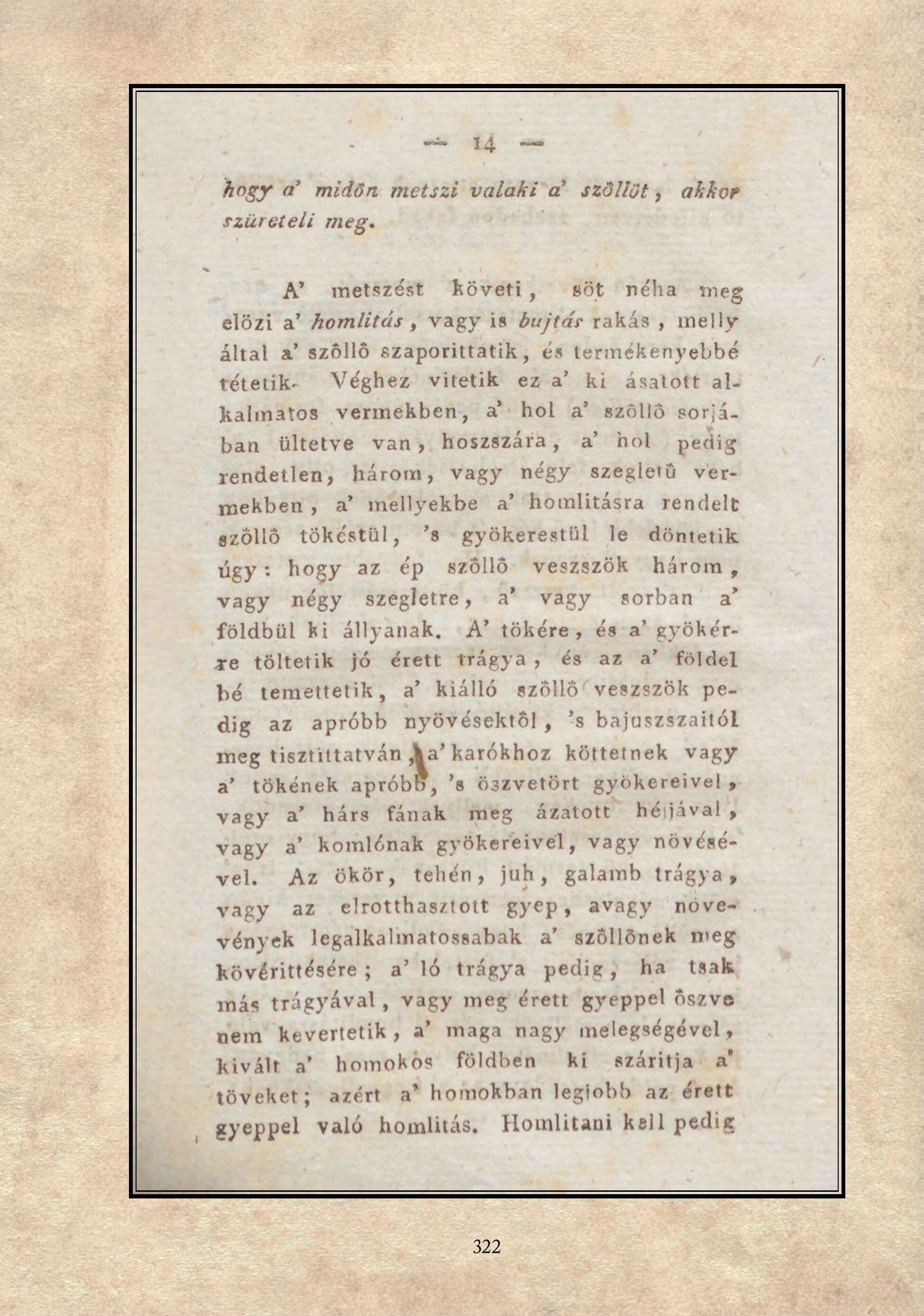 min JA aw hogy G midön metszi valaki°a’ szdllét, akkor szüreteli meg. ; A’ metszest követi, söt néha meg előzi a" Aomlitás , vagy is bujtás rakás , melly ältal a’ szöllö szaporittatik, és termékenyebbé tétetik. Véghez vitetik ez a’ ki äsatott alkalmatos vermekben, a’ hol a’ szöllö sorjäban itiltetve van, hoszszara, a’ hol pedig rendetlen, három, vagy négy szegletü vermekben, a’ mellyekbe a’ homlitásra rendelt szöllő tökéstül, 78 "gyökerestül le déntetik úgy: hogy az ép szöllö veszszök három, vagy négy szegletre, a’ vagy sorban a’ földbül ki ällyanak. ‘A’ tökere, Es a’ gyökerre töltetik jó érett trágya, és az a? földel bé temettetik, a? kiálló szöllő"veszszök pedig az apróbb nyövésektől, -s bajuszszaitól meg tisztittatvan . karökhoz köttetnek vagy a" tökének apróbb, "s öszvetört gyökereivel, vagy a’ härs fanak meg äzatott heijäaval, vagy a’ komlönak gyökereivel, vagy növesevel. Az ökör, tehen, juh, galamb trägya, vagy az . elrotthasztott gyep, avagy nôvevenyek legalkalmatossabak a’ szöllönek meg kôvérittésére ; a” ló trágya pedig, ha tsak mas tragyaval, vagy meg ¢rett gyeppel öszve nem kevertetik, a’ maga nagy melegségével, kivalt a’ homokös földben ki szäritja a’ töveket; azért a?" homokban legjobb az; érett gyeppel valö homlitäs, Homlitani kell pedig 322