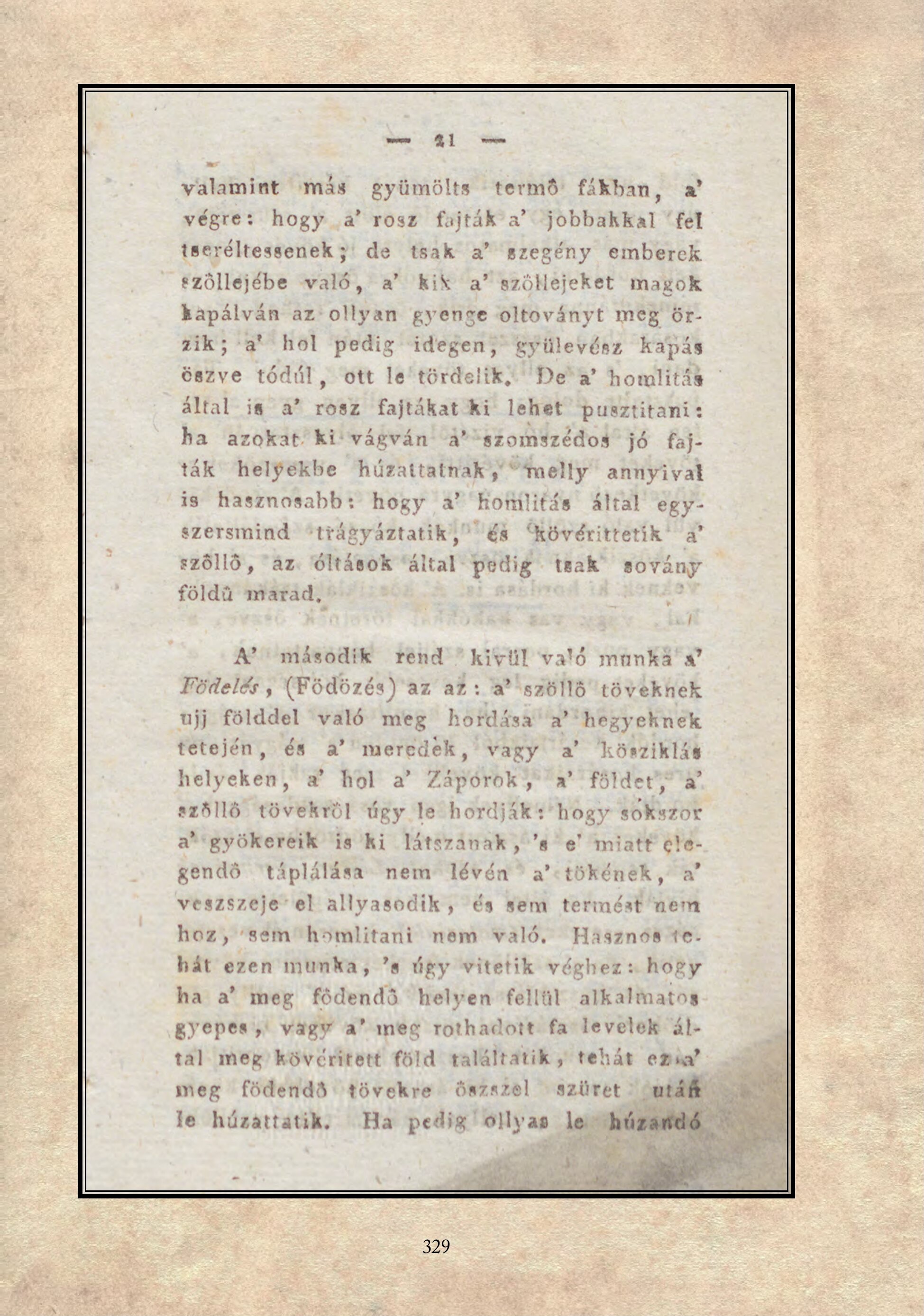 valamint "más gyümölts "termő" fákban, a’ végre: hogy a’ rosz fajtak a’ jobbakkal ‘fel tseréltessenek; de tsak a” szegény emberek ezöllejebe való, a’ kik a" szöllejeket magok kapálván az ollyan gyenge oltoványt meg ör? zik; "a! hol pedig idegen," gyülevész kapás öszve tódúl, ott le'tördelik,. 'De’a homlitäs által is a’ rosz fajtäkat ki lehet pusztitani: ha azokat. ki'vagvan a”"szomszedos jó fajták helyekbe Hhúzattathak, "melly annyivat is hasznosabb: hogy a" hotúlitás által egyszersmind "trágyáztatik," és "kövérittetik" a" szöllö, Az. Öltäsok "által pedig teak” sovany földű marad, / vr A? "második rénd "kivül vató munká 9 Födelés , (Födözés) az a7 : à 526110 tôveknek ujj földdel való meg hordása a "hegyeknek tétején, és a" meredek, vagy a ‘kdsziklas helyeken, a" hol a" Zápórok, "a" földet, a szöllő tövekrül úgy le hordják: "hogy sokszor a""gyökeréik is ki látszának, "a e’ miatt elegéndő "táplálása nem lévén" ar.tökének, a" veszszeje el allyasodik , és sem termést nem hoz, ‘sem homlitani nem valö. Hasznos tehat ezen munka, "s úgy vitetik véghez: hogy ha a’ meg fédendd helyen fellül alkalmatos * mecs rothadott fa levelek álgyepes, vagy a tal meg köveritert föld találtatik, tehát emu meg födendd tövekre öszszel szüret " utah le hüzattatik. Ha pedig óllyas leir húzásdó je ay CRP. 329