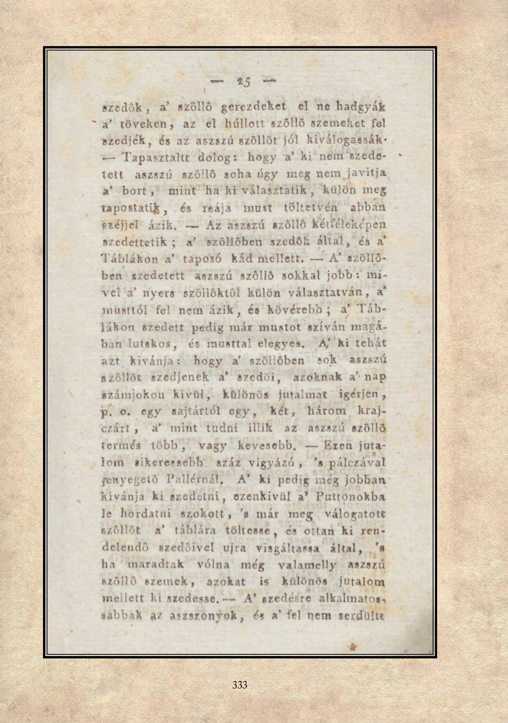 szedök, a’ szöllö gerezdeket el ne hadgyäk a’ töveken, az el hüllott szöllö szemeket fel szedjék, és az aszszü szöllöt jöl kivälogassäk— Tapasztaltt dolog: hogy a’ hi ném szedetett aszszú szöllő soha úgy meg nem javitja a" "bort," mint ha ki választatik, külön meg tapostatik, és reaja must tôltetvén abban széjjel ázik, — Az aszszú szöllő Ketielekepen szedettetik ; a? szöllóben szedök által, és a Táblákon a" taposó kád mellett. — A’ szöllöben szedetett aszazu szöllö sokkal jobb: mivel 4 nyere szöllöktöl külön választatván, a musttöl fel nem äzik, és kövérebb; a Tábläkon szedett pedig már mustot sziväan magaban lutskos, és musttal elegyes. A) ki tehát azt kivánja: hogy a’ szöllöben sok aszszú szöllöt szedjenek a" szedöi, azoknak a’ nap szAinjokon kivül, különös jutalmat igérjen, p. © egy sajtártól egy, két, harom_ krajczárt, "a" mint tudni illik az aszszu szöllö termés több, vagy kevesebb, — Ezen jutaJom aikeressébb "száz vigyázó, "s pálczával fenyegető Pallérnát, A’ ki pedig még jobban kivanja ki szedetni, ezenkivül a’ Puttönokba le hordatni szokott, ’s mar meg válogatott szöllöt a’ tablara téltesse, és ottan ki rendelendö szedöivel ujra visgältassa által, "8 ha maradtak vólna még valamelly aszszü szöllő szemek, azokat is különös jutalom mellett ki szedesse, — A’ szedesre alkalmatog sabbak az aszsronyok, és a" fel nem serdülte ír 333