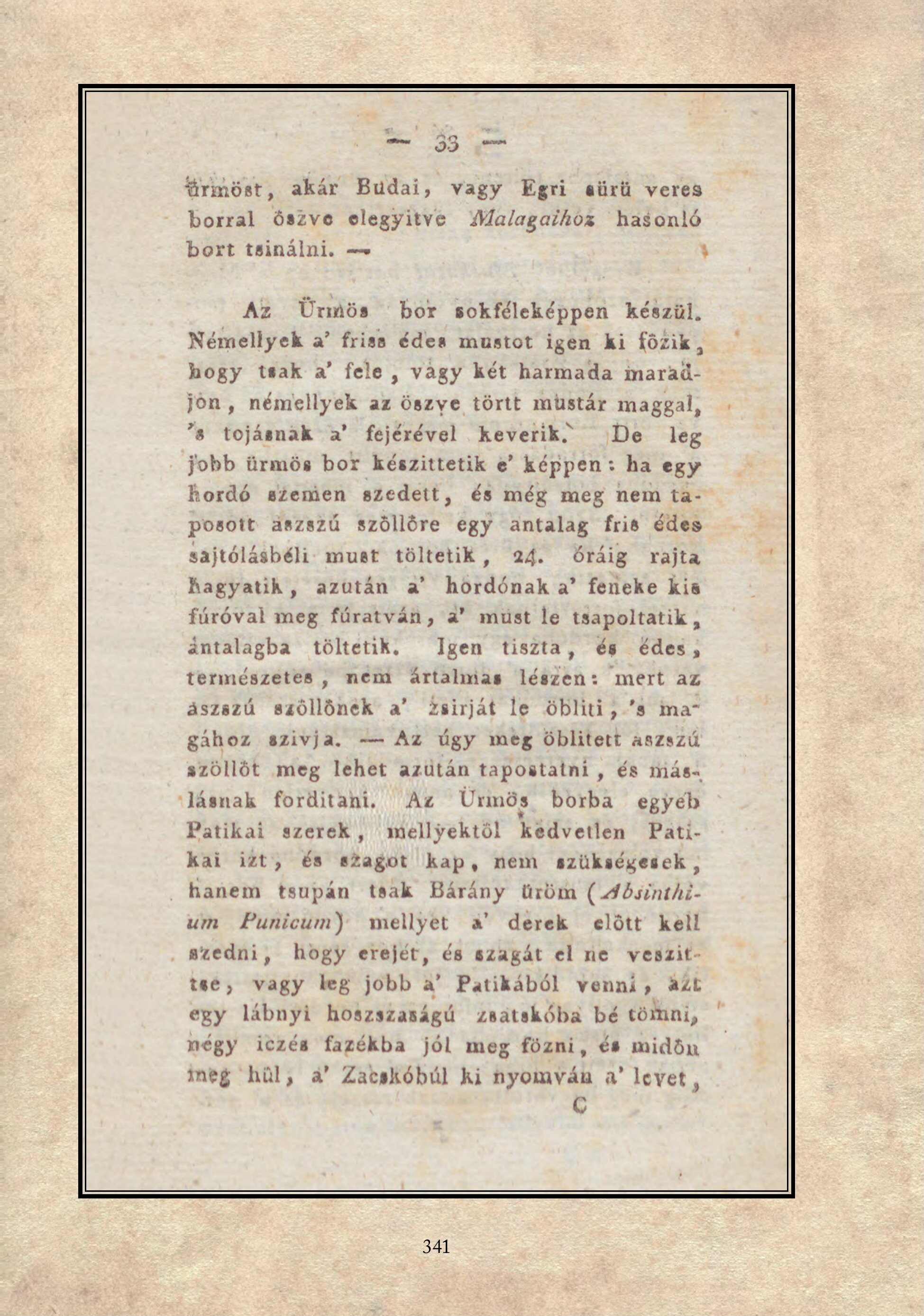 Pome 33 un ürmöst, akär Budai, vagy Egri sürü veres borral öszve elegyitve Malagaihoz hasonlö bort tsinälni. — : Az Ürmös bor sokféleképpen készül. Nemellyek a’ friss édea mustot igen ki fözik, hogy tsak a" fele , vagy két harmada maradjón, némellyek az öszye törtt müstär maggal, "8 tojásnak a" fejerevel keverik. De leg jobb ürmös bor keszittetik e? képpen : ha egy kordó szemen szedett, és még meg nem taposott ászszú szöllöre egy antalag fris édes sájtólásbóli: muat töltetik, 24. óráig rajta Kagyatik, azutân a’ horddnak a’ feneke kis furéval meg firatvan, a’ must le tsapoltatik , ántalagba töltetik. Igen tiszta, és édes, természetes , nem ártalmas lészen: mert az ászszú szôllônek a’ Zsirjat le ôbliti, ’s magához szivja. — Az úgy még öblitett aszszü sz0llôt meg lehet azütän tapostatni, és mäs"lásnak forditani, Az Urmös borba egyéb Patikai szerek, mellyektöl kedvetlen Patikai izt, és szagot kap, nem szükségesek, . hanem tsupán tsak Bárány ürôm ( Absinthium Punicum) mellyet a" derek elött kell szedni, hogy erejét, és szagát el ne veszittee, vagy leg jobb a’ Patikäböl venni, azt egy lábnyi hoszszaságú zsatakóba bé tömni, ‘ négy iczés fazékba jól meg fözni, és midön ineg hül, a’ Zacsköbül ki nyomvan a’ levet, C 341