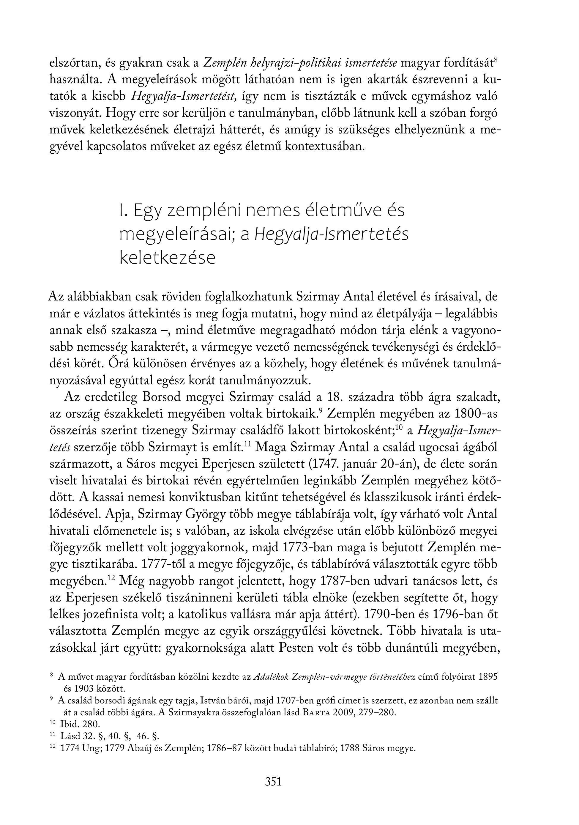 elszórtan, és gyakran csak a Zemplén helyrajzi-politikai ismertetése magyar forditasat® használta. A megyeleírások mögött láthatóan nem is igen akarták észrevenni a kutatók a kisebb Hegya/ja-Ismertetést, így nem is tisztázták e művek egymáshoz való viszonyát. Hogy erre sor kerüljön e tanulmányban, előbb látnunk kell a szóban forgó művek keletkezésének életrajzi hátterét, és amúgy is szükséges elhelyeznünk a megyével kapcsolatos műveket az egész életmű kontextusában. I. Egy zempléni nemes életműve és megyeleírásai; a Hegyalja-Ismertetes keletkezése Az alábbiakban csak röviden foglalkozhatunk Szirmay Antal életével és írásaival, de már e vázlatos áttekintés is meg fogja mutatni, hogy mind az életpályája — legalábbis annak első szakasza —, mind életműve megragadható módon tárja elénk a vagyonosabb nemesség karakterét, a vármegye vezető nemességének tevékenységi és érdeklődési körét. Őrá különösen érvényes az a közhely, hogy életének és művének tanulmányozásával egyúttal egész korát tanulmányozzuk. Az eredetileg Borsod megyei Szirmay család a 18. századra több ágra szakadt, az ország északkeleti megyéiben voltak birtokaik." Zemplén megyében az 1800-as összeírás szerint tizenegy Szirmay családfő lakott birtokosként; a Hegyalja-Ismertetés szerzője több Szirmayt is említ." Maga Szirmay Antal a család ugocsai ágából származott, a Sáros megyei Eperjesen született (1747. január 20-án), de élete során viselt hivatalai és birtokai révén egyértelműen leginkább Zemplén megyéhez kötődött. A kassai nemesi konviktusban kitűnt tehetségével és klasszikusok iránti érdeklődésével. Apja, Szirmay György több megye táblabírája volt, így várható volt Antal hivatali előmenetele is; s valóban, az iskola elvégzése után előbb különböző megyei főjegyzők mellett volt joggyakornok, majd 1773-ban maga is bejutott Zemplén megye tisztikarába. 1777-től a megye főjegyzője, és táblabíróvá választották egyre több megyében." Még nagyobb rangot jelentett, hogy 1787-ben udvari tanácsos lett, és az Eperjesen székelő tiszáninneni kerületi tábla elnöke (ezekben segítette őt, hogy lelkes jozefinista volt; a katolikus vallásra már apja áttért). 1790-ben és 1796-ban őt választotta Zemplén megye az egyik országgyűlési követnek. Több hivatala is utazásokkal járt együtt: gyakornoksága alatt Pesten volt és több dunántúli megyében, § A művet magyar fordításban közölni kezdte az Adalékok Zemplén-vármegye történetéhez című folyóirat 1895 és 1903 között. * A család borsodi ágának egy tagja, István bárói, majd 1707-ben grófi címet is szerzett, ez azonban nem szállt át a család többi ágára. A Szirmayakra összefoglalóan lásd BARTA 2009, 279—280. 10 Tbid. 280. 11 Lasd 32. §, 40. §, 46. §. 2 1774 Ung; 1779 Abaúj és Zemplén; 1786-87 között budai táblabíró; 1788 Sáros megye. 351