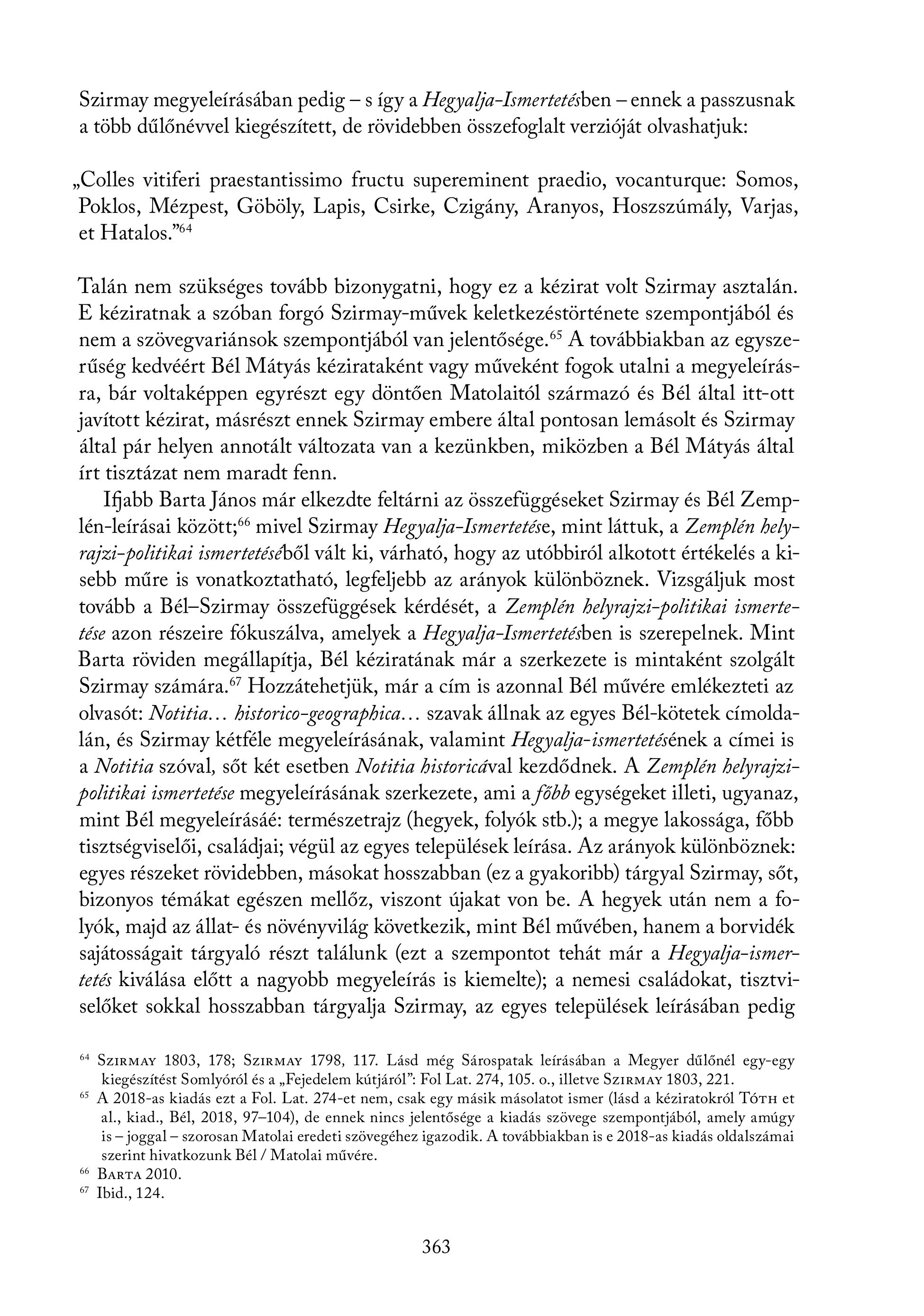 Szirmay megyeleírásában pedig — s így a Hegyalja-Ismertetésben — ennek a passzusnak a több dűlőnévvel kiegészített, de rövidebben összefoglalt verzióját olvashatjuk: „Colles vitiferi praestantissimo fructu supereminent praedio, vocanturque: Somos, Poklos, Mézpest, Göböly, Lapis, Csirke, Czigány, Aranyos, Hoszszúmály, Varjas, et Hatalos."" Talán nem szükséges tovább bizonygatni, hogy ez a kézirat volt Szirmay asztalán. E kéziratnak a szóban forgó Szirmay-művek keletkezéstörténete szempontjából és nem a szövegvariánsok szempontjából van jelentősége." A továbbiakban az egyszerűség kedvéért Bél Mátyás kézirataként vagy műveként fogok utalni a megyeleírásra, bár voltaképpen egyrészt egy döntően Matolaitól származó és Bél által itt-ott javított kézirat, másrészt ennek Szirmay embere által pontosan lemásolt és Szirmay által pár helyen annotált változata van a kezünkben, miközben a Bél Mátyás által írt tisztázat nem maradt fenn. Ifjabb Barta János már elkezdte feltárni az összefüggéseket Szirmay és Bél Zemplén-leirdsai k6zott;°° mivel Szirmay Hegyalja-Ismertetése, mint láttuk, a Zemplén helyrajzi-politikai ismertetéséből vált ki, várható, hogy az utóbbiról alkotott értékelés a kisebb műre is vonatkoztatható, legfeljebb az arányok különböznek. Vizsgáljuk most tovabb a Bél-Szirmay összefüggések kérdését, a Zemplén bhelyrajzi-politikai ismertetése azon részeire fókuszálva, amelyek a Hegyalja-Ismertetésben is szerepelnek. Mint Barta röviden megállapítja, Bél kéziratának már a szerkezete is mintaként szolgált Szirmay számára." Hozzátehetjük, már a cím is azonnal Bél művére emlékezteti az olvasöt: Notitia... historico-geographica... szavak ällnak az egyes Bel-kötetek cimoldalán, és Szirmay kétféle megyeleírásának, valamint Hegyalja-ismertetésének a címei is a Notitia szóval, sőt ket esetben Noritia historicäaval kezdödnek. A Zemplen helyrajzipolitikai ismertetése megyeleírásának szerkezete, ami a főbb egységeket illeti, ugyanaz, mint Bél megyeleírásáé: természetrajz (hegyek, folyók stb.); a megye lakossága, tőbb tisztségviselői, családjai; végül az egyes települések leírása. Az arányok különböznek: egyes részeket rövidebben, másokat hosszabban (ez a gyakoribb) tárgyal Szirmay, sőt, bizonyos témákat egészen mellőz, viszont újakat von be. A hegyek után nem a folyók, majd az állat- és növényvilág következik, mint Bél művében, hanem a borvidék sajátosságait tárgyaló részt találunk (ezt a szempontot tehát már a Hegyalja-ismerZetés kiválása előtt a nagyobb megyeleírás is kiemelte); a nemesi családokat, tisztviselőket sokkal hosszabban tárgyalja Szirmay, az egyes települések leírásában pedig 64 SzirMAy 1803, 178; Szırmay 1798, 117. Lásd még Sárospatak leírásában a Megyer dűlőnél egy-egy kiegeszitest Somlyöröl €s a „Fejedelem kütjäröl”: Fol Lat. 274, 105. o., illetve Szırmay 1803, 221. 55 A 2018-as kiadás ezt a Fol. Lat. 274-et nem, csak egy másik másolatot ismer (lásd a kéziratokról TöTH et al., kiad., Bél, 2018, 97-104), de ennek nincs jelentősége a kiadás szövege szempontjából, amely amúgy is — joggal — szorosan Matolai eredeti szövegéhez igazodik. A továbbiakban is e 2018-as kiadás oldalszámai szerint hivatkozunk Bél / Matolai művére. 66 BARTA 2010. §7 Tbid., 124. 363