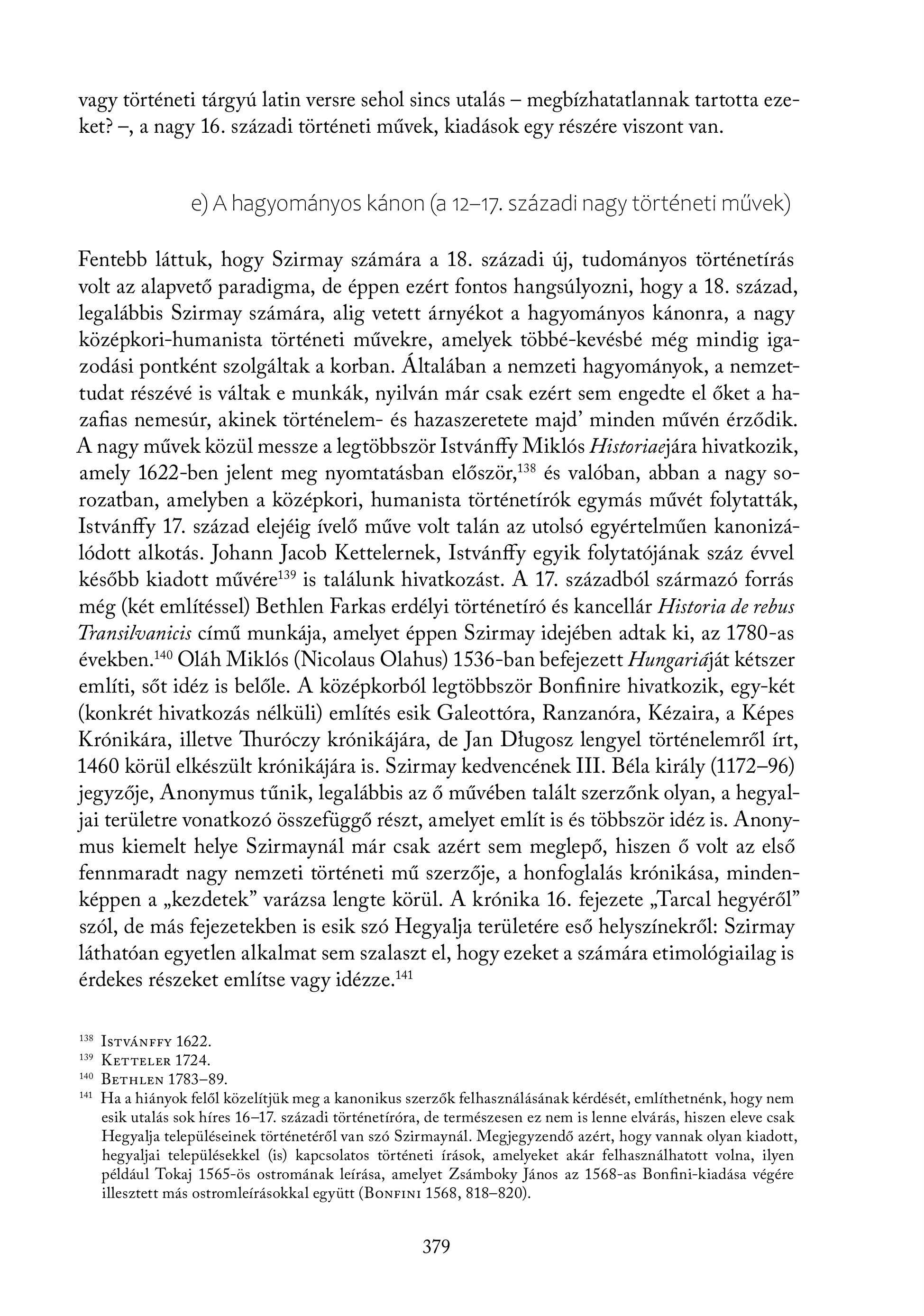 vagy történeti tárgyú latin versre sehol sincs utalás — megbízhatatlannak tartotta ezeket? -, a nagy 16. századi történeti művek, kiadások egy részére viszont van. e) A hagyományos kánon (a 12-17. századi nagy történeti művek) Fentebb láttuk, hogy Szirmay számára a 18. századi új, tudományos történetírás volt az alapvető paradigma, de éppen ezért fontos hangsúlyozni, hogy a 18. század, legalábbis Szirmay számára, alig vetett árnyékot a hagyományos kánonra, a nagy középkori-humanista történeti művekre, amelyek többé-kevésbé még mindig igazodási pontként szolgáltak a korban. Általában a nemzeti hagyományok, a nemzettudat részévé is váltak e munkák, nyilván már csak ezért sem engedte el őket a hazafias nemesúr, akinek történelem- és hazaszeretete majd" minden művén érződik. A nagy művek közül messze a legtöbbször Istvánffy Miklós Hiszoriaejára hivatkozik, amely 1622-ben jelent meg nyomtatásban először, és valóban, abban a nagy sorozatban, amelyben a középkori, humanista történetírók egymás művét folytatták, Istvánffy 17. század elejéig ívelő műve volt talán az utolsó egyértelműen kanonizálódott alkotás. Johann Jacob Kettelernek, Istvanffy egyik folytatójának száz évvel később kiadott művére"? is találunk hivatkozást. A 17. századból származó forrás még (két említéssel) Bethlen Farkas erdélyi történetíró és kancellár Hiszoria de rebus Transilvanicis című munkája, amelyet éppen Szirmay idejében adtak ki, az 1780-as években." Oláh Miklós (Nicolaus Olahus) 1536-ban befejezett Hungaridjat kétszer említi, sőt idéz is belőle. A középkorból legtöbbször Bonfinire hivatkozik, egy-két (konkrét hivatkozás nélküli) említés esik Galeottóra, Ranzanóra, Kézaira, a Képes Krónikára, illetve Ihuróczy krónikájára, de Jan Diugosz lengyel történelemről írt, 1460 körül elkészült krónikájára is. Szirmay kedvencének III. Béla kiräly (1172-96) jegyzője, Anonymus tűnik, legalábbis az ő művében talált szerzőnk olyan, a hegyaljai területre vonatkozó összefüggő részt, amelyet említ is és többször idéz is. Anonymus kiemelt helye Szirmaynál már csak azért sem meglepő, hiszen ő volt az első fennmaradt nagy nemzeti történeti mű szerzője, a honfoglalás krónikása, mindenképpen a , kezdetek" varázsa lengte körül. A krónika 16. fejezete , Tarcal hegyéről" szól, de más fejezetekben is esik szó Hegyalja területére eső helyszínekről: Szirmay láthatóan egyetlen alkalmat sem szalaszt el, hogy ezeket a számára etimológiailag is érdekes részeket említse vagy idézze." 1588 ISTVÁNFFY 1622. 139 KETTELER 1724. 40 BETHLEN 1783-89. Ha a hiányok felől közelítjük meg a kanonikus szerzők felhasználásának kérdését, említhetnénk, hogy nem esik utalás sok híres 16-17. századi történetíróra, de természesen ez nem is lenne elvárás, hiszen eleve csak Hegyalja településeinek történetéről van szó Szirmaynál. Megjegyzendő azért, hogy vannak olyan kiadott, hegyaljai településekkel (is) kapcsolatos történeti írások, amelyeket akár felhasználhatott volna, ilyen például Tokaj 1565-ös ostromának leírása, amelyet Zsámboky János az 1568-as Bonfini-kiadása végére illesztett más ostromleírásokkal együtt (BONFINI 1568, 818-820). 379