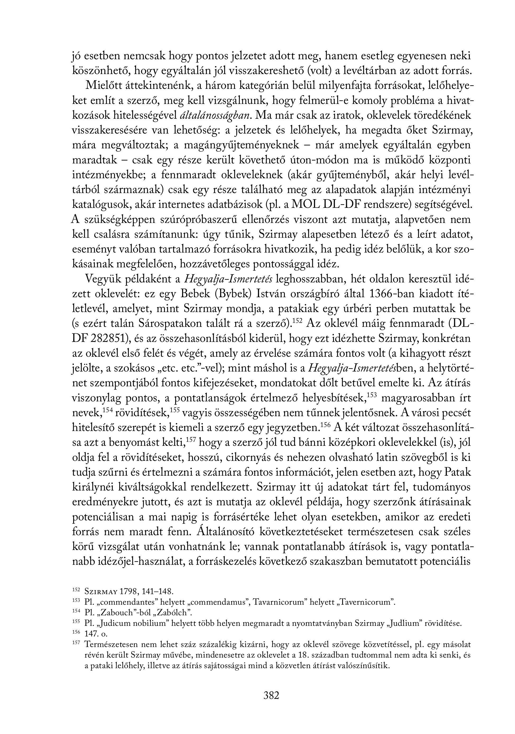 jó esetben nemcsak hogy pontos jelzetet adott meg, hanem esetleg egyenesen neki köszönhető, hogy egyáltalán jól visszakereshető (volt) a levéltárban az adott forrás. Mielőtt áttekintenénk, a három kategórián belül milyenfajta forrásokat, lelőhelyeket említ a szerző, meg kell vizsgálnunk, hogy felmerül-e komoly probléma a hivatkozások hitelességével általánosságban. Ma már csak az iratok, oklevelek töredékének visszakeresésére van lehetőség: a jelzetek és lelőhelyek, ha megadta őket Szirmay, mára megváltoztak; a magángyűjteményeknek — már amelyek egyáltalán egyben maradtak — csak egy része került követhető úton-módon ma is működő központi intézményekbe; a fennmaradt okleveleknek (akár gyűjteményből, akár helyi levéltárból származnak) csak egy része található meg az alapadatok alapján intézményi katalógusok, akár internetes adatbázisok (pl. a MOL DL-DF rendszere) segítségével. A szükségképpen szúrópróbaszerű ellenőrzés viszont azt mutatja, alapvetően nem kell csalásra számítanunk: úgy tűnik, Szirmay alapesetben létező és a leírt adatot, eseményt valóban tartalmazó forrásokra hivatkozik, ha pedig idéz belőlük, a kor szokásainak megfelelően, hozzávetőleges pontossággal idéz. Vegyük példaként a Hegyalja-Ismertetés leghosszabban, hét oldalon keresztül idézett oklevelét: ez egy Bebek (Bybek) István országbíró által 1366-ban kiadott ítéletlevél, amelyet, mint Szirmay mondja, a patakiak egy úrbéri perben mutattak be (s ezért talán Sárospatakon talált rá a szerző)."? Az oklevél máig fennmaradt (DLDF 282851), és az összehasonlításból kiderül, hogy ezt idézhette Szirmay, konkrétan az oklevél első felét és végét, amely az érvelése számára fontos volt (a kihagyott részt jelölte, a szokásos , etc. etc.-vel); mint máshol is a Hegyalja-Ismertetésben, a helytörténet szempontjából fontos kifejezéseket, mondatokat dőlt betűvel emelte ki. Az átírás viszonylag pontos, a pontatlanságok értelmező helyesbítések," magyarosabban írt nevek," rövidítések, 55 vagyis összességében nem tűnnek jelentősnek. A városi pecsét hitelesítő szerepét is kiemeli a szerző egy jegyzetben."" A két változat összehasonlítása azt a benyomást kelti," hogy a szerző jól tud bánni középkori oklevelekkel (is), jól oldja fel a rövidítéseket, hosszú, cikornyás és nehezen olvasható latin szövegből is ki tudja szűrni és értelmezni a számára fontos információt, jelen esetben azt, hogy Patak királynéi kiváltságokkal rendelkezett. Szirmay itt új adatokat tárt fel, tudományos eredményekre jutott, és azt is mutatja az oklevél példája, hogy szerzőnk átírásainak potenciálisan a mai napig is forrásértéke lehet olyan esetekben, amikor az eredeti forrás nem maradt fenn. Általánosító következtetéseket természetesen csak széles körű vizsgálat után vonhatnánk le; vannak pontatlanabb átírások is, vagy pontatlanabb idézőjel-használat, a forráskezelés következő szakaszban bemutatott potenciális 152 SZIRMAY 1798, 141-148. 13 PL ,commendantes” helyett ,\commendamus”, Tavarnicorum” helyett ,Tavernicorum”. 154 PI. ,Zabouch”-bél ,Zabélch”. 155 Pl. , Judicum nobilium" helyett több helyen megmaradt a nyomtatványban Szirmay , Judlium" rövidítése. 156 147. o. 157 Természetesen nem lehet száz százalékig kizárni, hogy az oklevél szövege közvetítéssel, pl. egy másolat révén került Szirmay művébe, mindenesetre az oklevelet a 18. században tudtommal nem adta ki senki, és a pataki lelőhely, illetve az átírás sajátosságai mind a közvetlen átírást valószínűsítik. 382