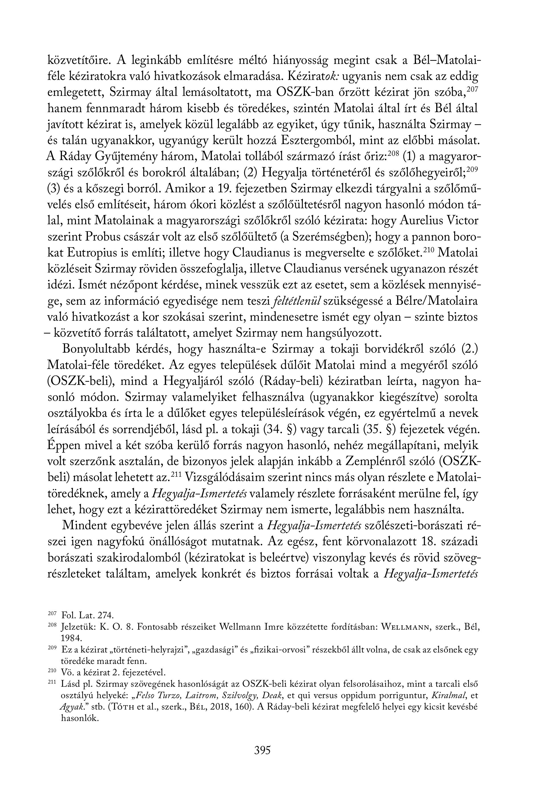 közvetítőire. A leginkább említésre méltó hiányosság megint csak a Bél-Matolaiféle kéziratokra való hivatkozások elmaradása. Kéziratok: ugyanis nem csak az eddig emlegetett, Szirmay által lemásoltatott, ma OSZK-ban őrzött kézirat jön szóba," hanem fennmaradt három kisebb és töredékes, szintén Matolai által írt és Bél által javított kézirat is, amelyek közül legalább az egyiket, úgy tűnik, használta Szirmay — és talán ugyanakkor, ugyanúgy került hozzá Esztergomból, mint az előbbi másolat. A Ráday Gyűjtemény három, Matolai tollából származó írást őriz:?" (1) a magyarországi szőlőkről és borokról általában; (2) Hegyalja történetéről és szőlőhegyeiről;?"" (3) és a kőszegi borról. Amikor a 19. fejezetben Szirmay elkezdi tárgyalni a szőlőművelés első említéseit, három ókori közlést a szőlőültetésről nagyon hasonló módon tálal, mint Matolainak a magyarországi szőlőkről szóló kézirata: hogy Aurelius Victor szerint Probus császár volt az első szőlőültető (a Szerémségben); hogy a pannon borokat Eutropius is említi; illetve hogy Claudianus is megverselte e szőlőket." Matolai közléseit Szirmay röviden összefoglalja, illetve Claudianus versének ugyanazon részét idézi. Ismét nézőpont kérdése, minek vesszük ezt az esetet, sem a közlések mennyisége, sem az információ egyedisége nem teszi feltétlenül szükségessé a Bélre/ Matolaira való hivatkozást a kor szokásai szerint, mindenesetre ismét egy olyan — szinte biztos — közvetítő forrás találtatott, amelyet Szirmay nem hangsúlyozott. Bonyolultabb kérdés, hogy használta-e Szirmay a tokaji borvidékről szóló (2.) Matolai-féle töredéket. Az egyes települések dűlőit Matolai mind a megyéről szóló (OSZK-beli), mind a Hegyaljáról szóló (Ráday-beli) kéziratban leírta, nagyon hasonló módon. Szirmay valamelyiket felhasználva (ugyanakkor kiegészítve) sorolta osztályokba és írta le a dűlőket egyes településleírások végén, ez egyértelmű a nevek leírásából és sorrendjéből, lásd pl. a tokaji (34. §) vagy tarcali (35. §) fejezetek végén. Éppen mivel a két szóba kerülő forrás nagyon hasonló, nehéz megállapítani, melyik volt szerzőnk asztalán, de bizonyos jelek alapján inkább a Zemplénről szóló (OSZKbeli) másolat lehetett az." Vizsgálódásaim szerint nincs más olyan részlete e Matolaitöredéknek, amely a Hegyalja-Ismertetés valamely részlete forrásaként merülne fel, így lehet, hogy ezt a kézirattöredéket Szirmay nem ismerte, legalábbis nem használta. Mindent egybevéve jelen állás szerint a Hegyalja-Ismertetés szőlészeti-borászati részei igen nagyfokú önállóságot mutatnak. Az egész, fent körvonalazott 18. századi borászati szakirodalomból (kéziratokat is beleértve) viszonylag kevés és rövid szövegrészleteket találtam, amelyek konkrét és biztos forrásai voltak a Hegyalja-Ismertetés 207 Fol. Lat. 274. 208 Jelzetük: K. O. 8. Fontosabb részeiket Wellmann Imre közzétette forditasban: WELLMANN, szerk., Bél, 1984. 209 Ez a kézirat , történeti-helyrajzi", , gazdasági" és , fizikai-orvosi" részekből állt volna, de csak az elsőnek egy töredéke maradt fenn. 210 Vö. a kézirat 2. fejezetével. 2 Lásd pl. Szirmay szövegének hasonlóságát az OSZK-beli kézirat olyan felsorolásaihoz, mint a tarcali első osztályú helyeké: , Felso Turzo, Laitrom, Szilvolgy, Deak, et gui versus oppidum porriguntur, Kiralmal, et dAgyak. stb. (Tórn et al., szerk., BÉL, 2018, 160). A Ráday-beli kézirat megfelelő helyei egy kicsit kevésbé hasonlók. 395