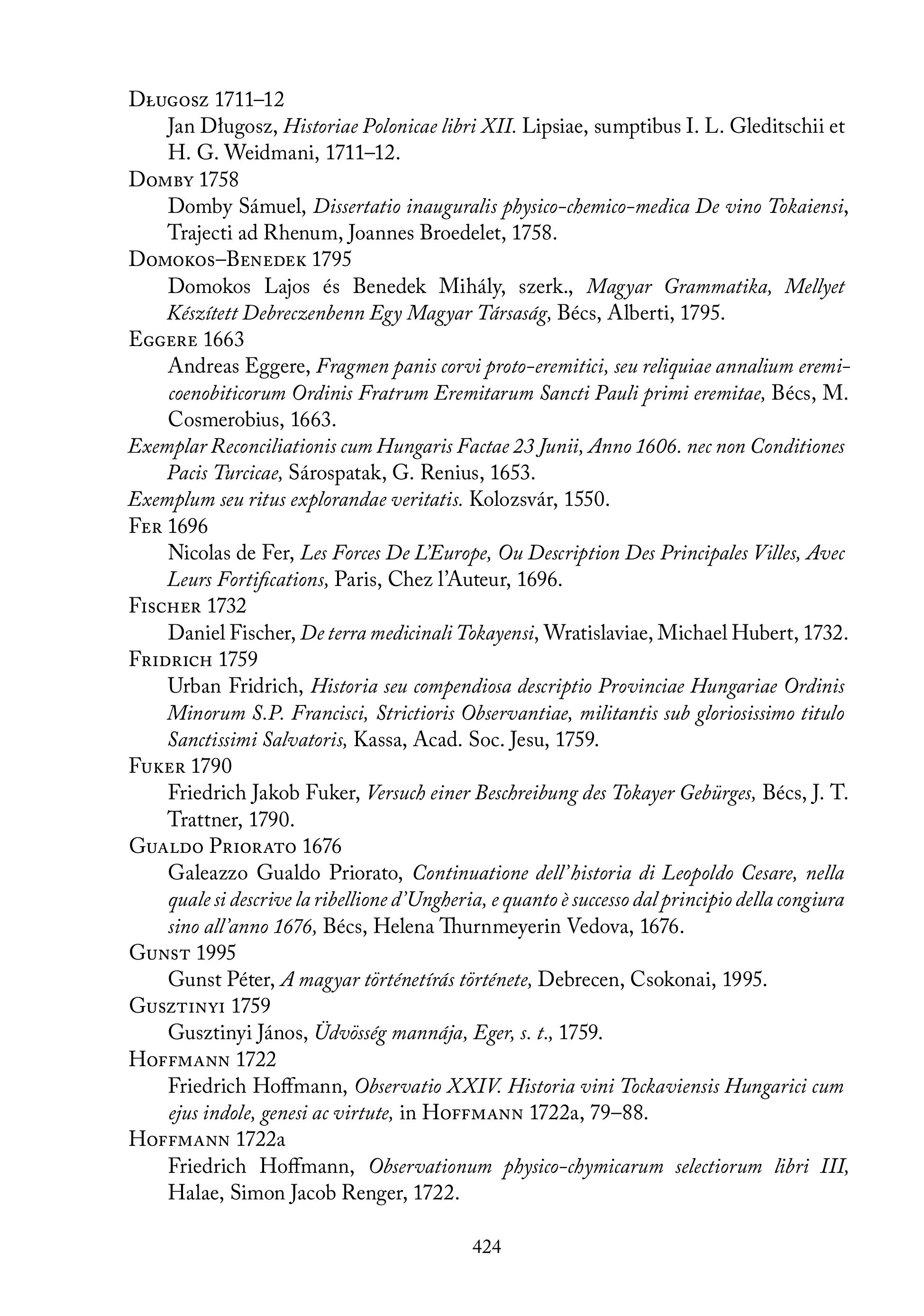Deucosz 1711-12 Jan Diugosz, Historiae Polonicae libri XII. Lipsiae, sumptibus I. L. Gleditschii et H. G. Weidmani, 1711-12. Dompy 1758 Domby Samuel, Dissertatio inauguralis physico-chemico-medica De vino Tokaiensi, Trajecti ad Rhenum, Joannes Broedelet, 1758. Domokos-BENEDEK 1795 Domokos Lajos és Benedek Mihály, szerk., Magyar Grammatika, Mellyet Készített Debreczenbenn Egy Magyar Társaság, Bécs, Alberti, 1795. EGGERE 1663 Andreas Eggere, Fragmen panis corvi proto-eremitict, seu reliquiae annalium eremicoenobiticorum Ordinis Fratrum Eremitarum Sancti Pauli primi eremitae, Bécs, M. Cosmerobius, 1663. Exemplar Reconciliationis cum Hungaris Factae 23 Junii, Anno 1606. nec non Conditiones Pacis Turcicae, Sárospatak, G. Renius, 1653. Exemplum seu ritus explorandae veritatis. Kolozsvär, 1550. FER 1696 Nicolas de Fer, Les Forces De L'Europe, Ou Description Des Principales Villes, Avec Leurs Fortifications, Paris, Chez l’Auteur, 1696. FIscHER 1732 Daniel Fischer, De terra medicinali Tokayensi, Wratislaviae, Michael Hubert, 1732. FripricH 1759 Urban Fridrich, Historia seu compendiosa descriptio Provinciae Hungariae Ordinis Minorum S.P. Francisci, Strictioris Observantiae, militantis sub gloriosissimo titulo Sanctissimi Salvatoris, Kassa, Acad. Soc. Jesu, 1759. FUKER 1790 Friedrich Jakob Fuker, Versuch einer Beschreibung des Tokayer Gebürges, Bécs, J. T. Trattner, 1790. GuALDo PRIORATO 1676 Galeazzo Gualdo Priorato, Continuatione dell’historia di Leopoldo Cesare, nella quale si descrive la ribellione d’Ungheria, e quanto é successo dal principio della congiura sino all anno 1676, Bécs, Helena Ihurnmeyerin Vedova, 1676. Gunst 1995 Gunst Peter, A magyar törtenetiräs története, Debrecen, Csokonai, 1995. Guszrtınyı 1759 Gusztinyi János, Üdvösség manndja, Eger, s. t., 1759. Horrmann 1722 Friedrich Hoffmann, Observatio XXIV. Historia vini Tockaviensis Hungarici cum ejus indole, genesi ac virtute, in HOFFMANN 1722a, 79-88. HOFFMANN 1722a Friedrich Hoffmann, Odservationum physico-chymicarum selectiorum libri III, Halae, Simon Jacob Renger, 1722. 424