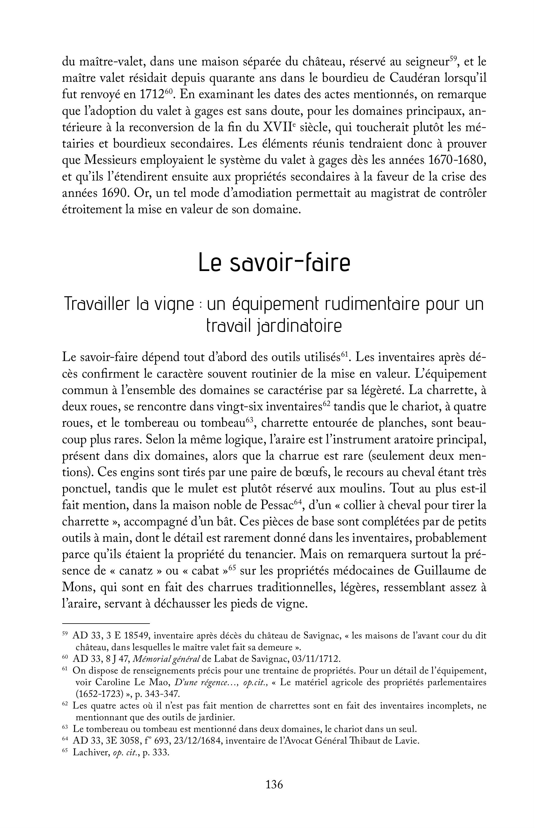 du maitre-valet, dans une maison séparée du chateau, réservé au seigneur”, et le maitre valet résidait depuis quarante ans dans le bourdieu de Caudéran lorsqu il fut renvoyé en 1712*°. En examinant les dates des actes mentionnés, on remarque que l’adoption du valet a gages est sans doute, pour les domaines principaux, antérieure à la reconversion de la fin du XVII* siécle, qui toucherait plutôt les métairies et bourdieux secondaires. Les éléments réunis tendraient donc à prouver que Messieurs employaient le système du valet à gages dès les années 1670-1680, et qu'ils l’étendirent ensuite aux propriétés secondaires à la faveur de la crise des années 1690. Or, un tel mode d’amodiation permettait au magistrat de contrôler étroitement la mise en valeur de son domaine. Le Savoir-faire Travailler la vigne : un équipement rudimentaire pour un travail jardinatoire Le savoir-faire dépend tout d’abord des outils utilisés®!. Les inventaires après décès confirment le caractère souvent routinier de la mise en valeur. L'équipement commun à l’ensemble des domaines se caractérise par sa légèreté. La charrette, à deux roues, se rencontre dans vingt-six inventaires? tandis que le chariot, à quatre roues, et le tombereau ou tombeau‘, charrette entourée de planches, sont beaucoup plus rares. Selon la même logique, l’araire est l’instrument aratoire principal, présent dans dix domaines, alors que la charrue est rare (seulement deux mentions). Ces engins sont tirés par une paire de bœufs, le recours au cheval étant très ponctuel, tandis que le mulet est plutôt réservé aux moulins. Tout au plus est-il fait mention, dans la maison noble de Pessac**, d’un « collier à cheval pour tirer la charrette », accompagné d’un bât. Ces pièces de base sont complétées par de petits outils à main, dont le détail est rarement donné dans les inventaires, probablement parce qu’ils étaient la propriété du tenancier. Mais on remarquera surtout la présence de « canatz » ou « cabat »°° sur les propriétés médocaines de Guillaume de Mons, qui sont en fait des charrues traditionnelles, légères, ressemblant assez à l’araire, servant à déchausser les pieds de vigne. » AD 33, 3 E 18549, inventaire après décès du château de Savignac, « les maisons de l’avant cour du dit château, dans lesquelles le maître valet fait sa demeure ». 6 AD 33, 8 J 47, Mémorial général de Labat de Savignac, 03/11/1712. On dispose de renseignements précis pour une trentaine de propriétés. Pour un détail de l’équipement, voir Caroline Le Mao, D'une régence.…., op.cit., « Le matériel agricole des propriétés parlementaires (1652-1723) », p. 343-347. Les quatre actes où il n’est pas fait mention de charrettes sont en fait des inventaires incomplets, ne mentionnant que des outils de jardinier. Le tombereau ou tombeau est mentionné dans deux domaines, le chariot dans un seul. 64 AD 33, 3E 3058, f° 693, 23/12/1684, inventaire de l’Avocat Général Thibaut de Lavie. 5 Lachiver, op. cit., p. 333. 63 136