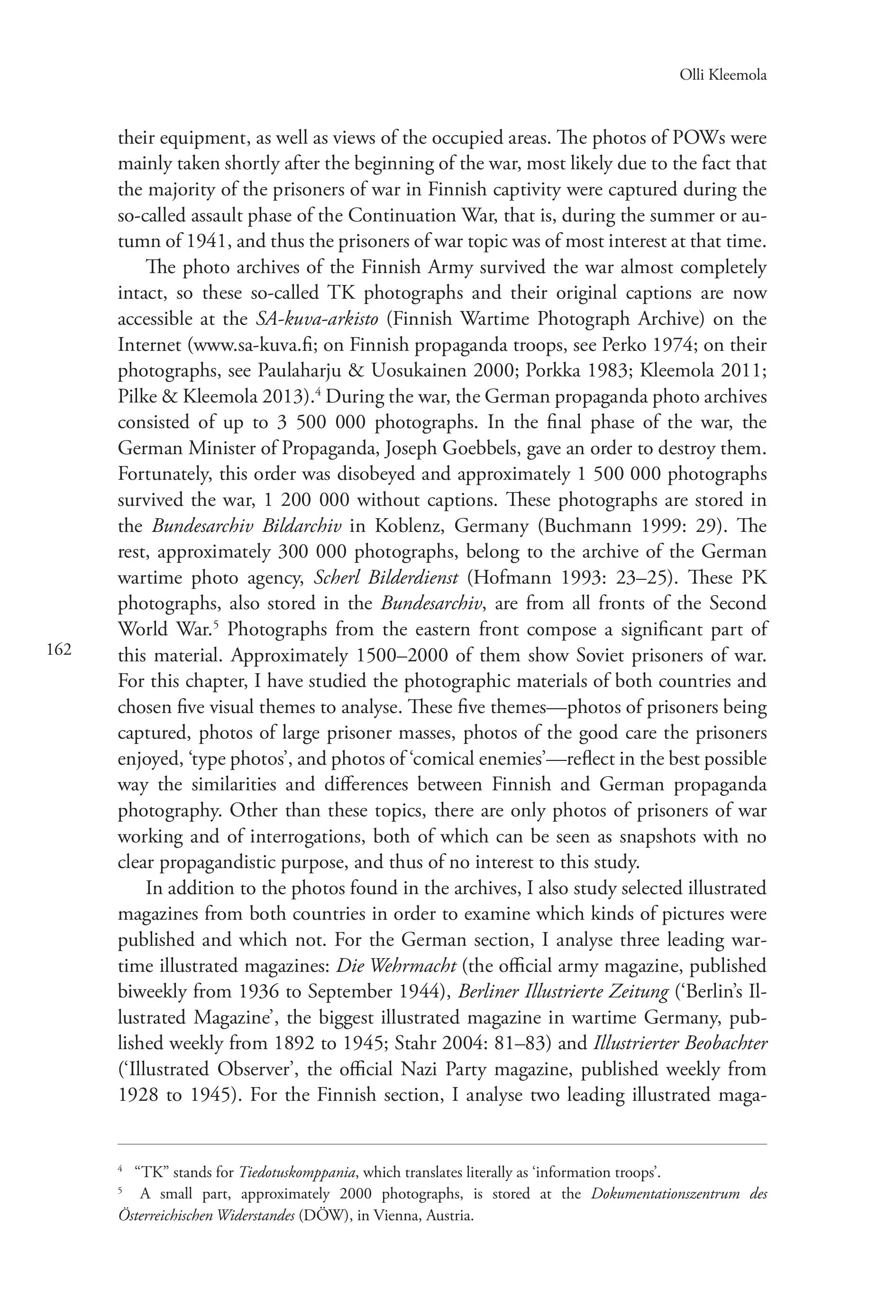 162 Olli Kleemola their equipment, as well as views of the occupied areas. The photos of POWs were mainly taken shortly after the beginning of the war, most likely due to the fact that the majority of the prisoners of war in Finnish captivity were captured during the so-called assault phase of the Continuation War, that is, during the summer or autumn of 1941, and thus the prisoners of war topic was of most interest at that time. The photo archives of the Finnish Army survived the war almost completely intact, so these so-called TK photographs and their original captions are now accessible at the SA-kuva-arkisto (Finnish Wartime Photograph Archive) on the Internet (www.sa-kuva.fi; on Finnish propaganda troops, see Perko 1974; on their photographs, see Paulaharju & Uosukainen 2000; Porkka 1983; Kleemola 2011; Pilke & Kleemola 2013). During the war, the German propaganda photo archives consisted of up to 3 500 000 photographs. In the final phase of the war, the German Minister of Propaganda, Joseph Goebbels, gave an order to destroy them. Fortunately, this order was disobeyed and approximately 1 500 000 photographs survived the war, 1 200 000 without captions. These photographs are stored in the Bundesarchiv Bildarchiv in Koblenz, Germany (Buchmann 1999: 29). The rest, approximately 300 000 photographs, belong to the archive of the German wartime photo agency, Scherl Bilderdienst (Hofmann 1993: 23-25). These PK photographs, also stored in the Bundesarchiv, are from all fronts of the Second World War.” Photographs from the eastern front compose a significant part of this material. Approximately 1500-2000 of them show Soviet prisoners of war. For this chapter, I have studied the photographic materials of both countries and chosen five visual themes to analyse. These five themes—photos of prisoners being captured, photos of large prisoner masses, photos of the good care the prisoners enjoyed, ‘type photos’, and photos of ‘comical enemies’ —reflect in the best possible way the similarities and differences between Finnish and German propaganda photography. Other than these topics, there are only photos of prisoners of war working and of interrogations, both of which can be seen as snapshots with no clear propagandistic purpose, and thus of no interest to this study. In addition to the photos found in the archives, I also study selected illustrated magazines from both countries in order to examine which kinds of pictures were published and which not. For the German section, I analyse three leading wartime illustrated magazines: Die Wehrmacht (the official army magazine, published biweekly from 1936 to September 1944), Berliner Illustrierte Zeitung ("Berlin's Illustrated Magazine’, the biggest illustrated magazine in wartime Germany, published weekly from 1892 to 1945; Stahr 2004: 81-83) and Zlustrierter Beobachter (‘Illustrated Observer’, the official Nazi Party magazine, published weekly from 1928 to 1945). For the Finnish section, I analyse two leading illustrated maga # TK? stands for Tiedotuskomppania, which translates literally as ‘information troops’. > A small part, approximately 2000 photographs, is stored at the Dokumentationszentrum des P PP y photograp Osterreichischen Widerstandes (DOW), in Vienna, Austria.