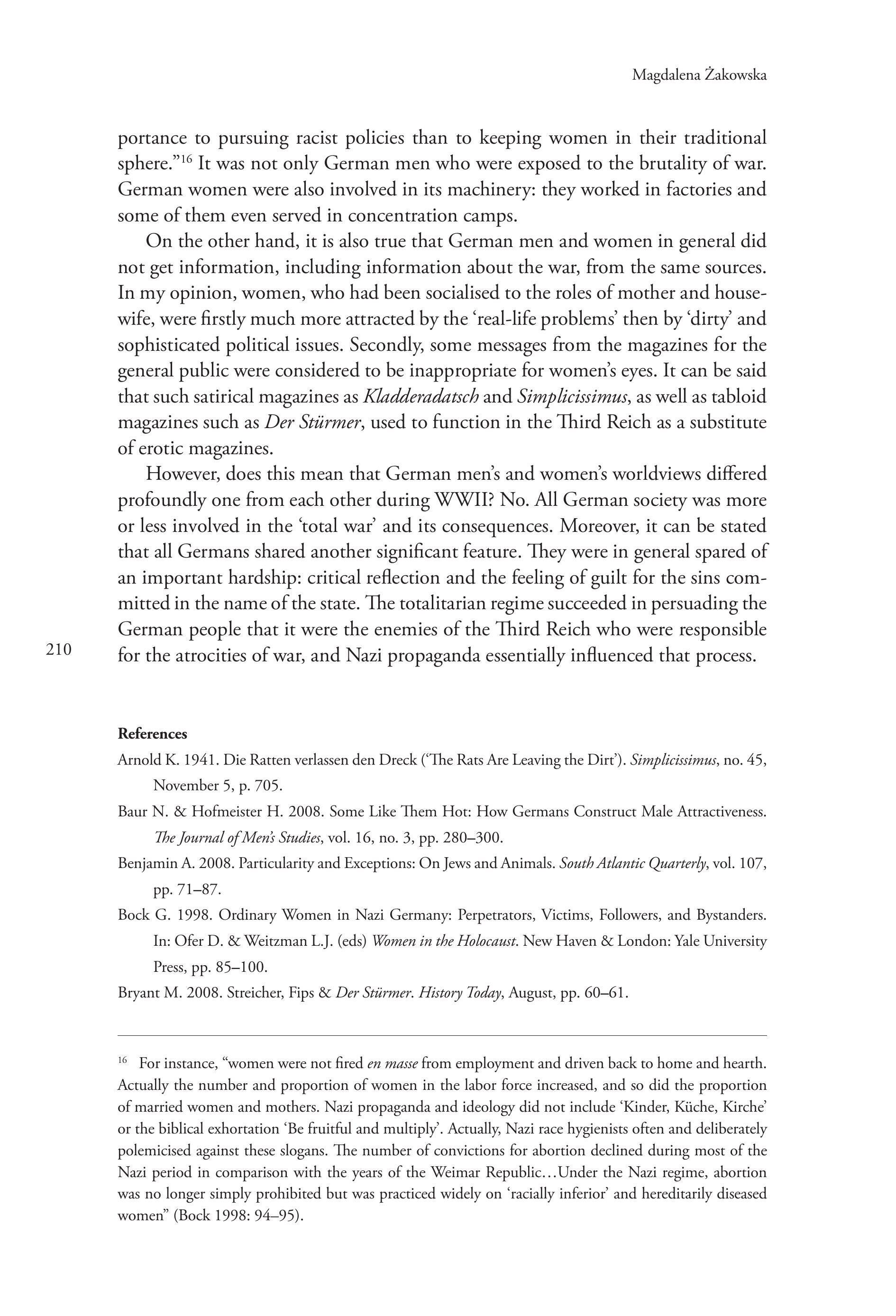 210 Magdalena Zakowska portance to pursuing racist policies than to keeping women in their traditional sphere”! It was not only German men who were exposed to the brutality of war. German women were also involved in its machinery: they worked in factories and some of them even served in concentration camps. On the other hand, it is also true that German men and women in general did not get information, including information about the war, from the same sources. In my opinion, women, who had been socialised to the roles of mother and housewife, were firstly much more attracted by the ‘real-life problems’ then by ‘dirty and sophisticated political issues. Secondly, some messages from the magazines for the general public were considered to be inappropriate for women’s eyes. It can be said that such satirical magazines as Kladderadatsch and Simplicissimus, as well as tabloid magazines such as Der Stürmer, used to function in the Third Reich as a substitute of erotic magazines. However, does this mean that German men’s and women’s worldviews differed profoundly one from each other during WWII? No. All German society was more or less involved in the ‘total war’ and its consequences. Moreover, it can be stated that all Germans shared another significant feature. They were in general spared of an important hardship: critical reflection and the feeling of guilt for the sins committed in the name of the state. The totalitarian regime succeeded in persuading the German people that it were the enemies of the Third Reich who were responsible for the atrocities of war, and Nazi propaganda essentially influenced that process. References Arnold K. 1941. Die Ratten verlassen den Dreck (“The Rats Are Leaving the Dirt’). Simplicissimus, no. 45, November 5, p. 705. Baur N. & Hofmeister H. 2008. Some Like Them Hot: How Germans Construct Male Attractiveness. The Journal of Men’ Studies, vol. 16, no. 3, pp. 280-300. Benjamin A. 2008. Particularity and Exceptions: On Jews and Animals. South Atlantic Quarterly, vol. 107, pp. 71-87. Bock G. 1998. Ordinary Women in Nazi Germany: Perpetrators, Victims, Followers, and Bystanders. In: Ofer D. & Weitzman L.J. (eds) Women in the Holocaust. New Haven & London: Yale University Press, pp. 85-100. Bryant M. 2008. Streicher, Fips & Der Stürmer. History Today, August, pp. 60-61. ‘© For instance, “women were not fired en masse from employment and driven back to home and hearth. Actually the number and proportion of women in the labor force increased, and so did the proportion of married women and mothers. Nazi propaganda and ideology did not include ‘Kinder, Kiiche, Kirche’ or the biblical exhortation ‘Be fruitful and multiply’. Actually, Nazi race hygienists often and deliberately polemicised against these slogans. The number of convictions for abortion declined during most of the Nazi period in comparison with the years of the Weimar Republic...Under the Nazi regime, abortion was no longer simply prohibited but was practiced widely on ‘racially inferior’ and hereditarily diseased women” (Bock 1998: 94-95).