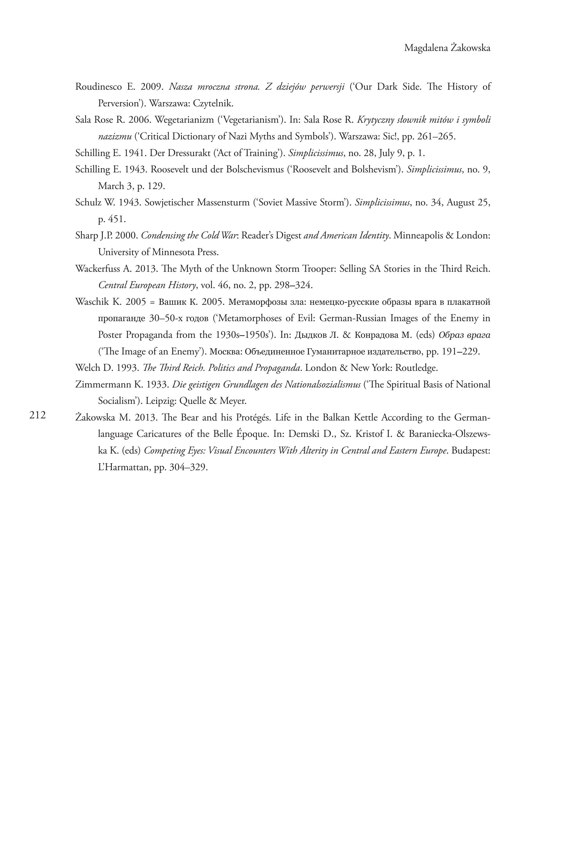 212 Magdalena Zakowska Roudinesco E. 2009. Nasza mroczna strona. Z dziejéw perwersji (Our Dark Side. The History of Perversion’). Warszawa: Czytelnik. Sala Rose R. 2006. Wegetarianizm (‘Vegetarianism). In: Sala Rose R. Krytyczny slownik mitéw i symboli nazizmu (‘Critical Dictionary of Nazi Myths and Symbols’). Warszawa: Sic!, pp. 261-265. Schilling E. 1941. Der Dressurakt (‘Act of Training’). Simplicissimus, no. 28, July 9, p. 1. Schilling E. 1943. Roosevelt und der Bolschevismus (‘Roosevelt and Bolshevism). Simplicissimus, no. 9, March 3, p. 129. Schulz W. 1943. Sowjetischer Massensturm (‘Soviet Massive Storm’). Simplicissimus, no. 34, August 25, p. 451. Sharp J.P. 2000. Condensing the Cold War: Reader’s Digest and American Identity. Minneapolis & London: University of Minnesota Press. Wackerfuss A. 2013. The Myth of the Unknown Storm Trooper: Selling SA Stories in the Third Reich. Central European History, vol. 46, no. 2, pp. 298-324. Waschik K. 2005 = Bammx K. 2005. Meramopbossı 31a: HeMelKo-pyccKue 06pa3bI Bpara B ILIAKATHOU upomarane 30—50-x rogos (‘Metamorphoses of Evil: German-Russian Images of the Enemy in Poster Propaganda from the 1930s—1950s’). In: Asınkos JI. & Kompanosa M. (cds) O6pas spasa (‘The Image of an Enemy’). Mocksa: O6beXuHeHHOe [yMmaHHTapHoe usnarerscerBo, pp. 191-229. Welch D. 1993. The Third Reich. Politics and Propaganda. London & New York: Routledge. Zimmermann K. 1933. Die geistigen Grundlagen des Nationalsozialismus (“The Spiritual Basis of National Socialism’). Leipzig: Quelle & Meyer. Zakowska M. 2013. The Bear and his Protégés. Life in the Balkan Kettle According to the Germanlanguage Caricatures of the Belle Epoque. In: Demski D., Sz. Kristof I. & Baraniecka-Olszewska K. (eds) Competing Eyes: Visual Encounters With Alterity in Central and Eastern Europe. Budapest: L'Harmattan, pp. 304-329.