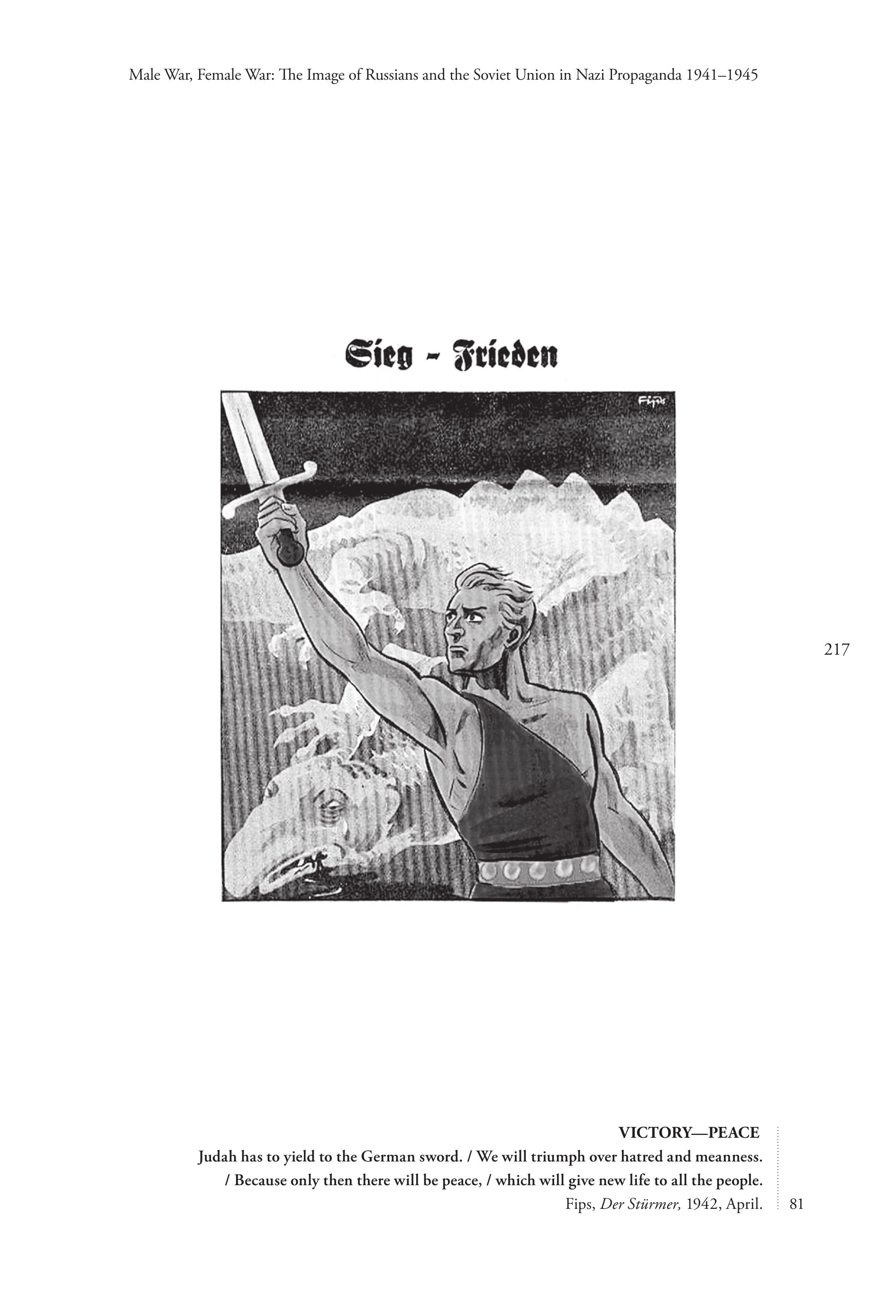 Male War, Female War: The Image of Russians and the Soviet Union in Nazi Propaganda 1941-1945 217 VICTORY—PEACE Judah has to yield to the German sword. / We will triumph over hatred and meanness. | / Because only then there will be peace, / which will give new life to all the people. : Fips, Der Stürmer, 1942, April. : 81