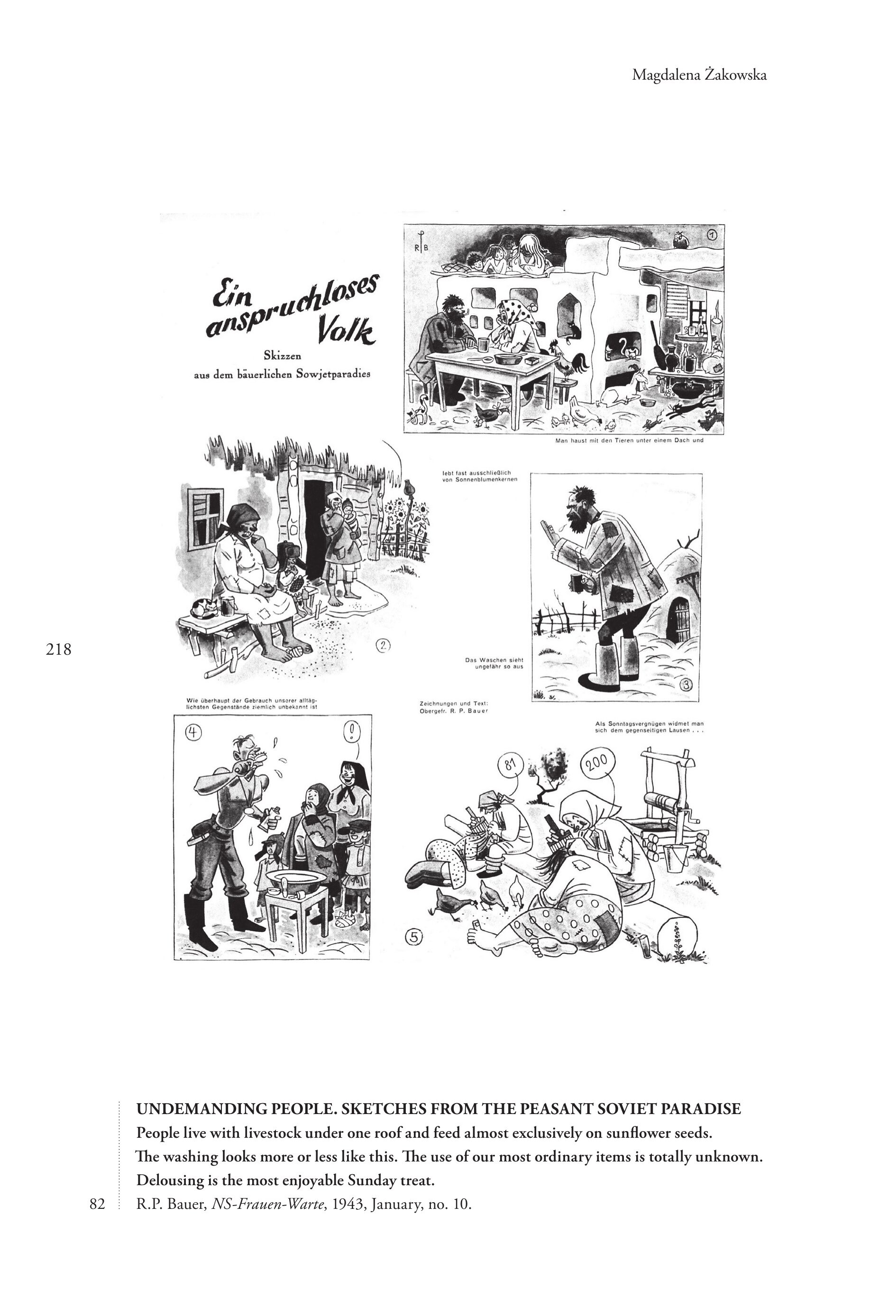 218 Magdalena Zakowska őn a hlos® anspr" a VA Skizzen aus dem bäuerlichen Sowjetparadies let fast ausschiegieh nenblumenkernen | Das Weschen sieht fähr s0 aus HE nungen und Tex sabe kal Zeichnungen und Text wi Mehsten Gegenstánde zlemlleh u a ieee, Als Sonntagsveronügen widmet man Sich dem gegenseitigen Lau UNDEMANDING PEOPLE. SKETCHES FROM THE PEASANT SOVIET PARADISE People live with livestock under one roof and feed almost exclusively on sunflower seeds. The washing looks more or less like this. The use of our most ordinary items is totally unknown. Delousing is the most enjoyable Sunday treat. R.P. Bauer, NS-Frauen-Warte, 1943, January, no. 10.