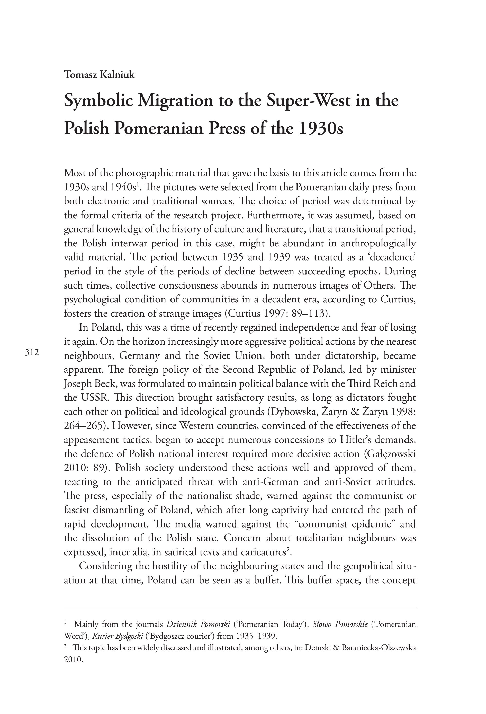 312 Tomasz Kalniuk Symbolic Migration to the Super-West in the Polish Pomeranian Press of the 1930s Most of the photographic material that gave the basis to this article comes from the 1930s and 1940s'. The pictures were selected from the Pomeranian daily press from both electronic and traditional sources. The choice of period was determined by the formal criteria of the research project. Furthermore, it was assumed, based on general knowledge of the history of culture and literature, that a transitional period, the Polish interwar period in this case, might be abundant in anthropologically valid material. The period between 1935 and 1939 was treated as a ‘decadence’ period in the style of the periods of decline between succeeding epochs. During such times, collective consciousness abounds in numerous images of Others. The psychological condition of communities in a decadent era, according to Curtius, fosters the creation of strange images (Curtius 1997: 89-113). In Poland, this was a time of recently regained independence and fear of losing it again. On the horizon increasingly more aggressive political actions by the nearest neighbours, Germany and the Soviet Union, both under dictatorship, became apparent. Ihe foreign policy of the Second Republic of Poland, led by minister Joseph Beck, was formulated to maintain political balance with the Third Reich and the USSR. This direction brought satisfactory results, as long as dictators fought each other on political and ideological grounds (Dybowska, Zaryn & Zaryn 1998: 264—265). However, since Western countries, convinced of the effectiveness of the appeasement tactics, began to accept numerous concessions to Hitler's demands, the defence of Polish national interest required more decisive action (Gatezowski 2010: 89). Polish society understood these actions well and approved of them, reacting to the anticipated threat with anti-German and anti-Soviet attitudes. ‘The press, especially of the nationalist shade, warned against the communist or fascist dismantling of Poland, which after long captivity had entered the path of rapid development. The media warned against the “communist epidemic” and the dissolution of the Polish state. Concern about totalitarian neighbours was expressed, inter alia, in satirical texts and caricatures’. Considering the hostility of the neighbouring states and the geopolitical situation at that time, Poland can be seen as a buffer. This buffer space, the concept ' Mainly from the journals Dziennik Pomorski (‘Pomeranian Today’), Stowo Pomorskie (‘Pomeranian Word’), Kurier Bydgoski (“Bydgoszcz courier’) from 1935-1939. ? "This topic has been widely discussed and illustrated, among others, in: Demski & Baraniecka-Olszewska 2010.