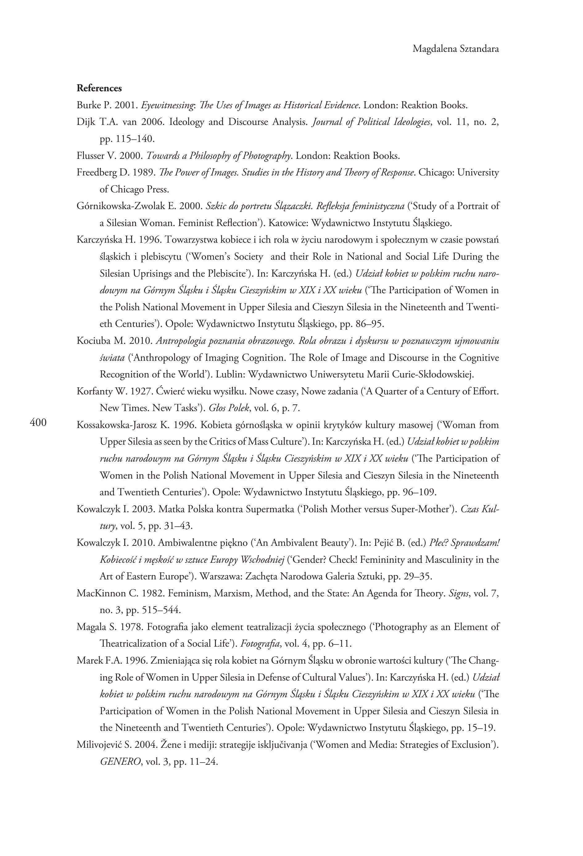 400 Magdalena Sztandara References Burke P. 2001. Eyewitnessing: The Uses of Images as Historical Evidence. London: Reaktion Books. Dijk T.A. van 2006. Ideology and Discourse Analysis. Journal of Political Ideologies, vol. 11, no. 2, pp. 115-140. Flusser V. 2000. Towards a Philosophy of Photography. London: Reaktion Books. Freedberg D. 1989. The Power of Images. Studies in the History and Theory of Response. Chicago: University of Chicago Press. Gornikowska-Zwolak E. 2000. Szkic do portretu Slazaczki. Refleksja feministyczna (‘Study of a Portrait of a Silesian Woman. Feminist Reflection’). Katowice: Wydawnictwo Instytutu Slaskiego. Karczyñska H. 1996. Towarzystwa kobiece i ich rola w zyciu narodowym i spotecznym w czasie powstan Slaskich i plebiscytu (“Women’s Society and their Role in National and Social Life During the Silesian Uprisings and the Plebiscite’). In: Karczyriska H. (ed.) Udziat kobiet w polskim ruchu narodowym na Gérnym Slasku i Slasku Cieszynskim w XIX i XX wieku (‘The Participation of Women in the Polish National Movement in Upper Silesia and Cieszyn Silesia in the Nineteenth and Twentieth Centuries’). Opole: Wydawnictwo Instytutu Slaskiego, pp. 86-95. Kociuba M. 2010. Antropologia poznania obrazowego. Rola obrazu i dyskursu w poznawczym ujmowaniu $wiata (Anthropology of Imaging Cognition. The Role of Image and Discourse in the Cognitive Recognition of the World’). Lublin: Wydawnictwo Uniwersytetu Marii Curie-Sktodowskiej. Korfanty W. 1927. Cwieré wieku wysilku. Nowe czasy, Nowe zadania (‘A Quarter of a Century of Effort. New Times. New Tasks’). Gtos Polek, vol. 6, p. 7. Kossakowska-Jarosz K. 1996. Kobieta görnoslaska w opinii krytyköw kultury masowej (“Woman from Upper Silesia as seen by the Critics of Mass Culture’). In: Karczyriska H. (ed.) Udziat kobiet w polskim ruchu narodowym na Görnym Slasku i Slasku Cieszynskim w XIX i XX wieku (The Participation of Women in the Polish National Movement in Upper Silesia and Cieszyn Silesia in the Nineteenth and Twentieth Centuries’). Opole: Wydawnictwo Instytutu Slaskiego, pp. 96-109. Kowalczyk I. 2003. Matka Polska kontra Supermatka (‘Polish Mother versus Super-Mother’). Czas Kultury, vol. 5, pp. 31-43. Kowalczyk I. 2010. Ambiwalentne pickno (‘An Ambivalent Beauty’). In: Peji¢ B. (ed.) Plec? Sprawdzam! Kobiecos¢ i mesko$é w sztuce Europy Wschodniej (‘Gender? Check! Femininity and Masculinity in the Art of Eastern Europe’). Warszawa: Zacheta Narodowa Galeria Sztuki, pp. 29-35. MacKinnon C. 1982. Feminism, Marxism, Method, and the State: An Agenda for Theory. Signs, vol. 7, no. 3, pp. 515-544. Magala S. 1978. Fotografia jako element teatralizacji zycia spotecznego (‘Photography as an Element of Theatricalization of a Social Life’). Fotografia, vol. 4, pp. 6-11. Marek F.A. 1996. Zmieniajaca sie rola kobiet na Gornym Slasku w obronie wartosci kultury (‘The Changing Role of Women in Upper Silesia in Defense of Cultural Values’). In: Karczyriska H. (ed.) Udziat kobiet w polskim ruchu narodowym na Gérnym Slgsku à Slasku Cieszynskim w XIX i XX wieku (‘The Participation of Women in the Polish National Movement in Upper Silesia and Cieszyn Silesia in the Nineteenth and Twentieth Centuries’). Opole: Wydawnictwo Instytutu Slaskiego, pp. 15-19. Milivojevié S. 2004. Zene i mediji: strategije iskljucivanja (“Women and Media: Strategies of Exclusion’). GENERO, vol. 3, pp. 11-24.