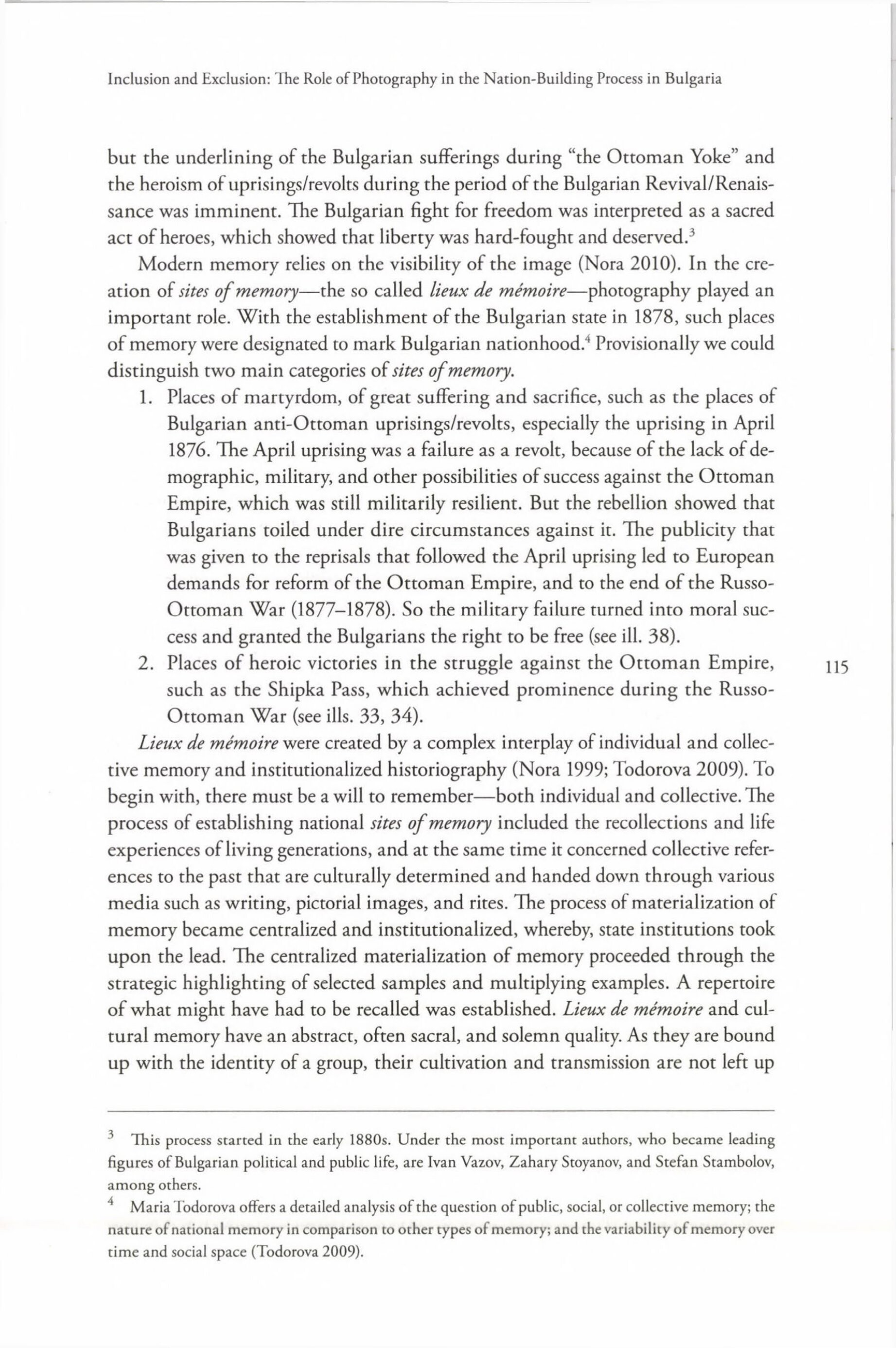 Inclusion and Exclusion: Ihe Role of Photography in the Nation-Building Process in Bulgaria but the underlining of the Bulgarian sufferings during "the Ottoman Yoke" and the heroism of uprisings/revolts during the period of the Bulgarian Revival/Renaissance was imminent. The Bulgarian fight for freedom was interpreted as a sacred act of heroes, which showed that liberty was hard-fought and deserved.’ Modern memory relies on the visibility of the image (Nora 2010). In the creation of sites of memory—the so called lieux de mémoire—photography played an important role. With the establishment of the Bulgarian state in 1878, such places of memory were designated to mark Bulgarian nationhood.‘ Provisionally we could distinguish two main categories of sites of memory. 1. Places of martyrdom, of great suffering and sacrifice, such as the places of Bulgarian anti-Ottoman uprisings/revolts, especially the uprising in April 1876. The April uprising was a failure as a revolt, because of the lack of demographic, military, and other possibilities of success against the Ottoman Empire, which was still militarily resilient. But the rebellion showed that Bulgarians toiled under dire circumstances against it. The publicity that was given to the reprisals that followed the April uprising led to European demands for reform of the Ottoman Empire, and to the end of the RussoOttoman War (1877-1878). So the military failure turned into moral success and granted the Bulgarians the right to be free (see ill. 38). 2. Places of heroic victories in the struggle against the Ottoman Empire, such as the Shipka Pass, which achieved prominence during the RussoOttoman War (see ills. 33, 34). Lieux de mémoire were created by a complex interplay of individual and collective memory and institutionalized historiography (Nora 1999; Todorova 2009). To begin with, there must be a will to remember—both individual and collective. The process of establishing national sites of memory included the recollections and life experiences of living generations, and at the same time it concerned collective references to the past that are culturally determined and handed down through various media such as writing, pictorial images, and rites. The process of materialization of memory became centralized and institutionalized, whereby, state institutions took upon the lead. The centralized materialization of memory proceeded through the strategic highlighting of selected samples and multiplying examples. A repertoire of what might have had to be recalled was established. Liewx de mémoire and cultural memory have an abstract, often sacral, and solemn quality. As they are bound up with the identity of a group, their cultivation and transmission are not left up 3 This process started in the early 1880s. Under the most important authors, who became leading figures of Bulgarian political and public life, are Ivan Vazov, Zahary Stoyanov, and Stefan Stambolov, among others. 4 Maria Todorova offers a detailed analysis of the question of public, social, or collective memory; the nature of national memory in comparison to other types of memory; and the variability of memory over time and social space (Todorova 2009). 115