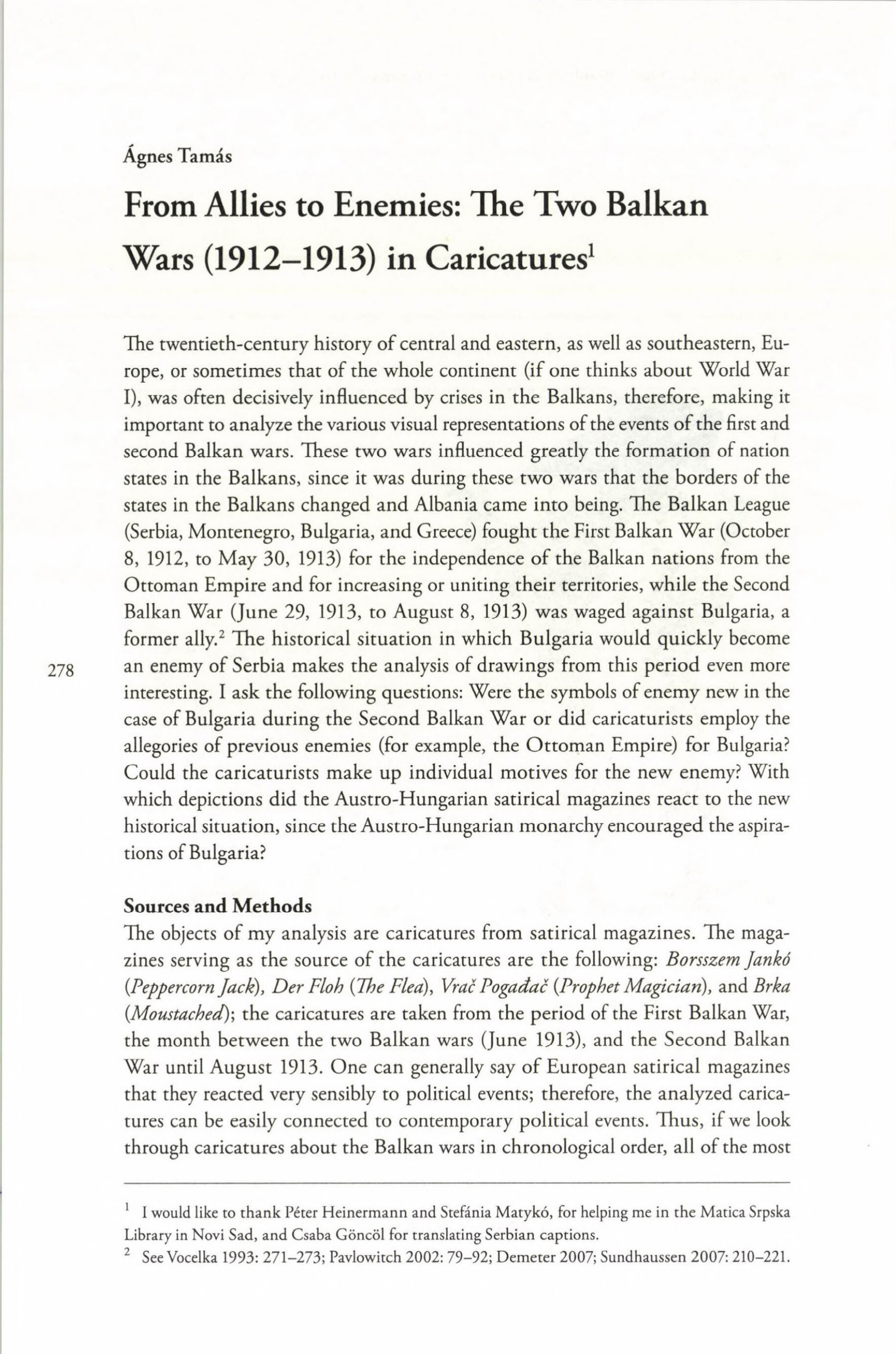 278 Ágnes Tamás From Allies to Enemies: Ihe Two Balkan Wars (1912—1913) in Caricatures! The twentieth-century history of central and eastern, as well as southeastern, Europe, or sometimes that of the whole continent (if one thinks about World War I), was often decisively influenced by crises in the Balkans, therefore, making it important to analyze the various visual representations of the events of the first and second Balkan wars. These two wars influenced greatly the formation of nation states in the Balkans, since it was during these two wars that the borders of the states in the Balkans changed and Albania came into being. The Balkan League (Serbia, Montenegro, Bulgaria, and Greece) fought the First Balkan War (October 8, 1912, to May 30, 1913) for the independence of the Balkan nations from the Ottoman Empire and for increasing or uniting their territories, while the Second Balkan War (June 29, 1913, to August 8, 1913) was waged against Bulgaria, a former ally.? The historical situation in which Bulgaria would quickly become an enemy of Serbia makes the analysis of drawings from this period even more interesting. I ask the following questions: Were the symbols of enemy new in the case of Bulgaria during the Second Balkan War or did caricaturists employ the allegories of previous enemies (for example, the Ottoman Empire) for Bulgaria? Could the caricaturists make up individual motives for the new enemy? With which depictions did the Austro-Hungarian satirical magazines react to the new historical situation, since the Austro-Hungarian monarchy encouraged the aspirations of Bulgaria? Sources and Methods The objects of my analysis are caricatures from satirical magazines. The magazines serving as the source of the caricatures are the following: Borsszem Jankó (Peppercorn Jack), Der Floh (The Flea), Vrac Pogadac (Prophet Magician), and Brka (Moustached); the caricatures are taken from the period of the First Balkan War, the month between the two Balkan wars (June 1913), and the Second Balkan War until August 1913. One can generally say of European satirical magazines that they reacted very sensibly to political events; therefore, the analyzed caricatures can be easily connected to contemporary political events. Thus, if we look through caricatures about the Balkan wars in chronological order, all of the most ! I would like to thank Péter Heinermann and Stefania Matyko, for helping me in the Matica Srpska Library in Novi Sad, and Csaba Göncöl for translating Serbian captions. ? See Vocelka 1993: 271-273; Pavlowitch 2002: 79-92; Demeter 2007; Sundhaussen 2007: 210-221.