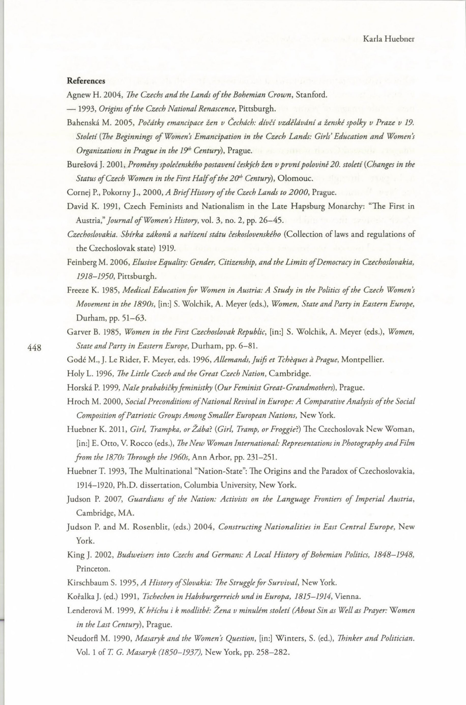 448 Karla Huebner References Agnew H. 2004, The Czechs and the Lands of the Bohemian Crown, Stanford. — 1993, Origins of the Czech National Renascence, Pittsburgh. Bahenska M. 2005, Pocdtky emancipace Zen v Cechäch: divei vzdeläväni a Zenske spolky v Praze v 19. Stoleti (The Beginnings of Women’s Emancipation in the Czech Lands: Girls’ Education and Women’s Organizations in Prague in the 19° Century), Prague. Buresovä J. 2001, Promény spolecenského postaveni ceskych Zen v prunt polovine 20. stoleti (Changes in the Status of Czech Women in the First Half of the 20” Century), Olomouc. Cornej P., Pokorny J., 2000, A Brief History of the Czech Lands to 2000, Prague. David K. 1991, Czech Feminists and Nationalism in the Late Hapsburg Monarchy: “The First in Austria,” Journal of Women’s History, vol. 3, no. 2, pp. 26-45. Czechoslovakia. Sbirka zakonü a narizeni stätu ceskoslovenského (Collection of laws and regulations of the Czechoslovak state) 1919. Feinberg M. 2006, Elusive Equality: Gender, Citizenship, and the Limits of Democracy in Czechoslovakia, 1918-1950, Pittsburgh. Freeze K. 1985, Medical Education for Women in Austria: A Study in the Politics of the Czech Women's Movement in the 1890s, {in:] S. Wolchik, A. Meyer (eds.), Women, State and Party in Eastern Europe, Durham, pp. 51-63. Garver B. 1985, Women in the First Czechoslovak Republic, |in:] S. Wolchik, A. Meyer (eds.), Women, State and Party in Eastern Europe, Durham, pp. 6-81. Godé M, J. Le Rider, F. Meyer, eds. 1996, Allemands, Juifs et Tchèques à Prague, Montpellier. Holy L. 1996, The Little Czech and the Great Czech Nation, Cambridge. Horskä P. 1999, Nase prababicky feministky (Our Feminist Great-Grandmothers), Prague. Hroch M. 2000, Social Preconditions of National Revival in Europe: A Comparative Analysis of the Social Composition of Patriotic Groups Among Smaller European Nations, New York. Huebner K. 2011, Girl, Trampka, or Zaba? (Girl, Tramp, or Froggie?) The Czechoslovak New Woman, [in:] E. Otto, V. Rocco (eds.), The New Woman International: Representations in Photography and Film from the 1870s Through the 1960s, Ann Arbor, pp. 231-251. Huebner T. 1993, The Multinational “Nation-State”: The Origins and the Paradox of Czechoslovakia, 1914-1920, Ph.D. dissertation, Columbia University, New York. Judson P. 2007, Guardians of the Nation: Activists on the Language Frontiers of Imperial Austria, Cambridge, MA. Judson P. and M. Rosenblit, (eds.) 2004, Constructing Nationalities in East Central Europe, New York. King J. 2002, Budweisers into Czechs and Germans: A Local History of Bohemian Politics, 1848-1948, Princeton. Kirschbaum S. 1995, A History of Slovakia: The Struggle for Survival, New York. Kofalka J. (ed.) 1991, Tschechen in Habsburgerreich und in Europa, 1815-1914, Vienna. Lenderovä M. 1999, K hrichu i k modlitbe: Zena v minulém stoleti (About Sin as Well as Prayer: Women in the Last Century), Prague. Neudorfl M. 1990, Masaryk and the Women's Question, [in:] Winters, S. (ed.), Thinker and Politician. Vol. 1 of T: G. Masaryk (1850-1937), New York, pp. 258-282.