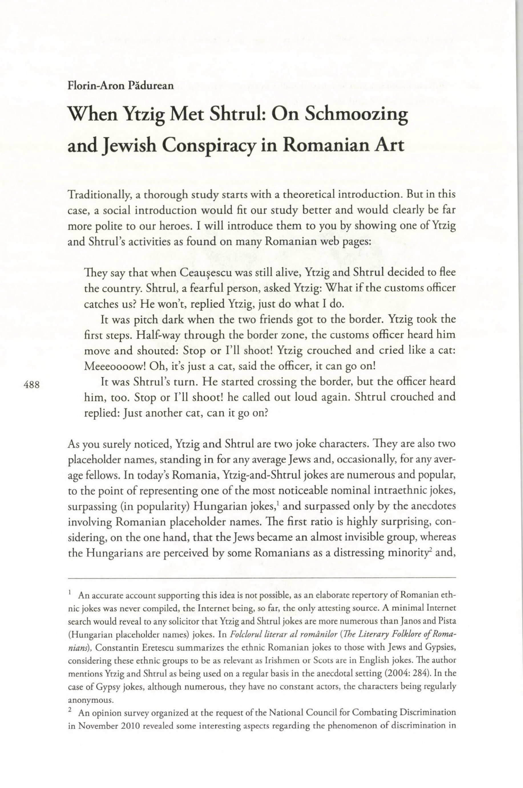 488 Florin-Aron Pádurean When Ytzig Met Shtrul: On Schmoozing and Jewish Conspiracy in Romanian Art Traditionally, a thorough study starts with a theoretical introduction. But in this case, a social introduction would fit our study better and would clearly be far more polite to our heroes. I will introduce them to you by showing one of Ytzig and Shtrul’s activities as found on many Romanian web pages: They say that when Ceausescu was still alive, Ytzig and Shtrul decided to flee the country. Shtrul, a fearful person, asked Ytzig: What if the customs officer catches us? He won't, replied Ytzig, just do what I do. It was pitch dark when the two friends got to the border. Ytzig took the first steps. Halfway through the border zone, the customs officer heard him move and shouted: Stop or I'll shoot! Ytzig crouched and cried like a cat: Meeeoooow! Oh, it’s just a cat, said the officer, it can go on! It was Shtrul’s turn. He started crossing the border, but the officer heard him, too. Stop or DII shoot! he called out loud again. Shtrul crouched and replied: Just another cat, can it go on? As you surely noticed, Ytzig and Shtrul are two joke characters. They are also two placeholder names, standing in for any average Jews and, occasionally, for any average fellows. In today’s Romania, Ytzig-and-Shtrul jokes are numerous and popular, to the point of representing one of the most noticeable nominal intraethnic jokes, surpassing (in popularity) Hungarian jokes,’ and surpassed only by the anecdotes involving Romanian placeholder names. The first ratio is highly surprising, considering, on the one hand, that the Jews became an almost invisible group, whereas the Hungarians are perceived by some Romanians as a distressing minority’ and, ! An accurate account supporting this idea is not possible, as an elaborate repertory of Romanian ethnic jokes was never compiled, the Internet being, so far, the only attesting source. A minimal Internet search would reveal to any solicitor that Ytzig and Shtrul jokes are more numerous than Janos and Pista (Hungarian placeholder names) jokes. In Folclorul literar al romanilor (The Literary Folklore of Romanians), Constantin Eretescu summarizes the ethnic Romanian jokes to those with Jews and Gypsies, considering these ethnic groups to be as relevant as Irishmen or Scots are in English jokes. The author mentions Ytzig and Shtrul as being used on a regular basis in the anecdotal setting (2004: 284). In the case of Gypsy jokes, although numerous, they have no constant actors, the characters being regularly anonymous. > An opinion survey organized at the request of the National Council for Combating Discrimination in November 2010 revealed some interesting aspects regarding the phenomenon of discrimination in
