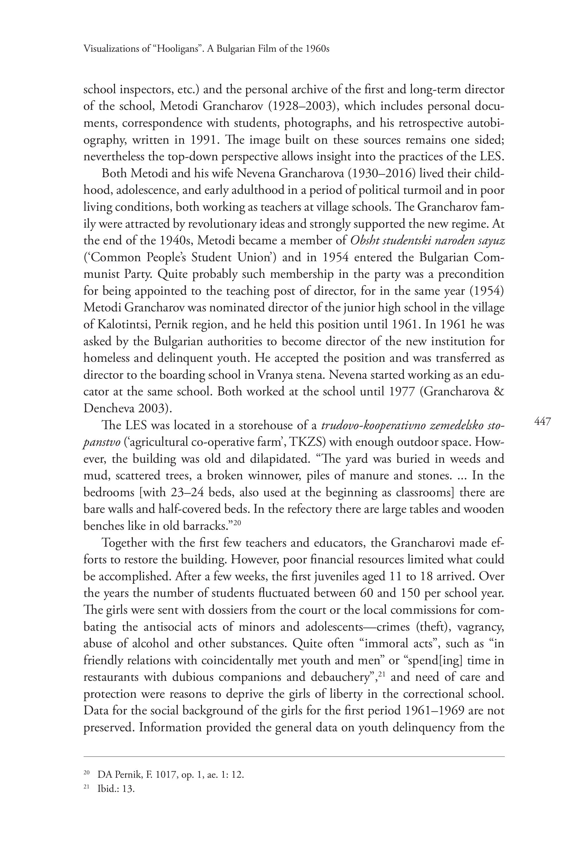 Visualizations of “Hooligans”. A Bulgarian Film of the 1960s school inspectors, etc.) and the personal archive of the first and long-term director of the school, Metodi Grancharov (1928-2003), which includes personal documents, correspondence with students, photographs, and his retrospective autobiography, written in 1991. The image built on these sources remains one sided; nevertheless the top-down perspective allows insight into the practices of the LES. Both Metodi and his wife Nevena Grancharova (1930-2016) lived their childhood, adolescence, and early adulthood in a period of political turmoil and in poor living conditions, both working as teachers at village schools. The Grancharov family were attracted by revolutionary ideas and strongly supported the new regime. At the end of the 1940s, Metodi became a member of Obsht studentski naroden sayuz (‘Common People’s Student Union’) and in 1954 entered the Bulgarian Communist Party. Quite probably such membership in the party was a precondition for being appointed to the teaching post of director, for in the same year (1954) Metodi Grancharov was nominated director of the junior high school in the village of Kalotintsi, Pernik region, and he held this position until 1961. In 1961 he was asked by the Bulgarian authorities to become director of the new institution for homeless and delinquent youth. He accepted the position and was transferred as director to the boarding school in Vranya stena. Nevena started working as an educator at the same school. Both worked at the school until 1977 (Grancharova & Dencheva 2003). The LES was located in a storehouse of a trudovo-kooperativno zemedelsko stopanstvo (‘agricultural co-operative farm’, TKZS) with enough outdoor space. However, the building was old and dilapidated. “The yard was buried in weeds and mud, scattered trees, a broken winnower, piles of manure and stones. ... In the bedrooms [with 23-24 beds, also used at the beginning as classrooms] there are bare walls and half-covered beds. In the refectory there are large tables and wooden benches like in old barracks.””° Together with the first few teachers and educators, the Grancharovi made ef forts to restore the building. However, poor financial resources limited what could be accomplished. After a few weeks, the first juveniles aged 11 to 18 arrived. Over the years the number of students fluctuated between 60 and 150 per school year. ‘The girls were sent with dossiers from the court or the local commissions for combating the antisocial acts of minors and adolescents—crimes (theft), vagrancy, abuse of alcohol and other substances. Quite often “immoral acts”, such as “in friendly relations with coincidentally met youth and men” or “spend[ing] time in 21 and need of care and restaurants with dubious companions and debauchery”, protection were reasons to deprive the girls of liberty in the correctional school. Data for the social background of the girls for the first period 1961-1969 are not preserved. Information provided the general data on youth delinquency from the 2% DA Pernik, F. 1017, op. 1, ae. 1: 12. 21 Ibid.: 13. 447