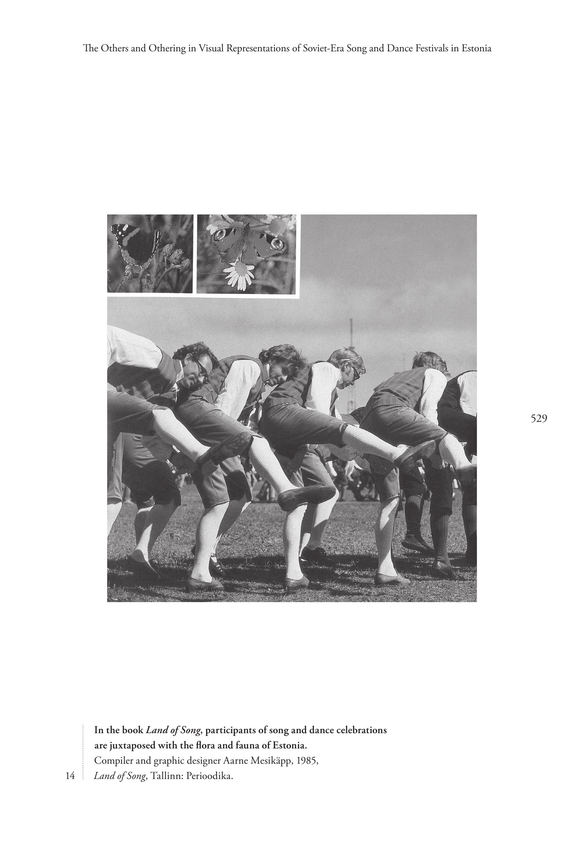 14 The Others and Othering in Visual Representations of Soviet-Era Song and Dance Festivals in Estonia In the book Land of Song, participants of song and dance celebrations are juxtaposed with the flora and fauna of Estonia. Compiler and graphic designer Aarne Mesikapp, 1985, Land of Song, Tallinn: Perioodika. 529
