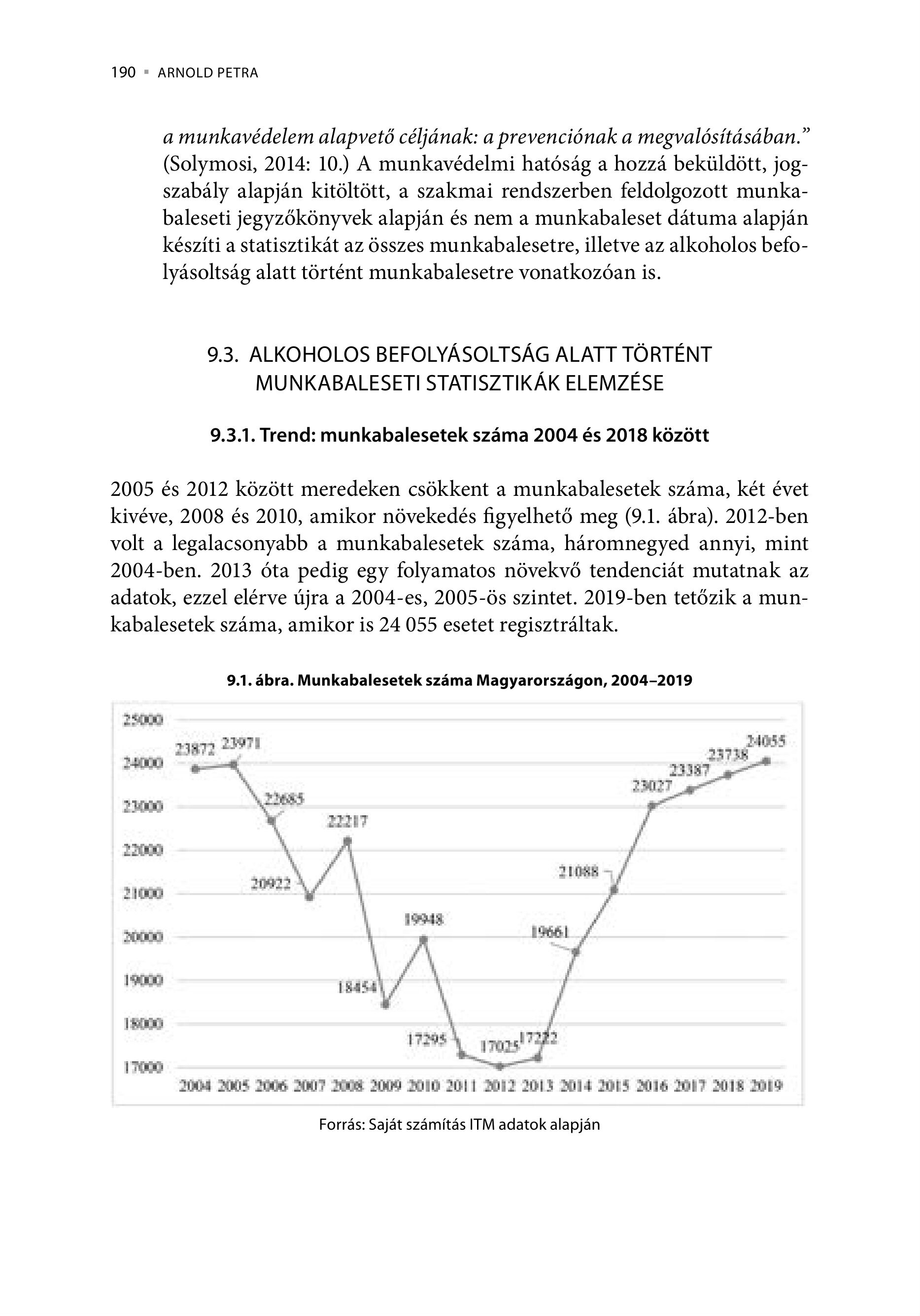 190 = ARNOLD PETRA a munkavédelem alapvető céljának: a prevenciónak a megvalósításában." (Solymosi, 2014: 10.) A munkavédelmi hatóság a hozzá beküldött, jogszabály alapján kitöltött, a szakmai rendszerben feldolgozott munkabaleseti jegyzőkönyvek alapján és nem a munkabaleset dátuma alapján készíti a statisztikát az összes munkabalesetre, illetve az alkoholos befolyásoltság alatt történt munkabalesetre vonatkozóan is. 9.3. ALKOHOLOS BEFOLYÁSOLTSÁG ALATT TÖRTÉNT MUNKABALESETI STATISZTIKÁK ELEMZÉSE 9.3.1. Trend: munkabalesetek száma 2004 és 2018 között 2005 és 2012 között meredeken csökkent a munkabalesetek száma, két évet kivéve, 2008 és 2010, amikor növekedés figyelhető meg (9.1. ábra). 2012-ben volt a legalacsonyabb a munkabalesetek száma, háromnegyed annyi, mint 2004-ben. 2013 óta pedig egy folyamatos növekvő tendenciát mutatnak az adatok, ezzel elérve újra a 2004-es, 2005-ös szintet. 2019-ben tetőzik a munkabalesetek száma, amikor is 24 055 esetet regisztráltak. 9.1. ábra. Munkabalesetek száma Magyarországon, 2004-2019 24000 ZET SU MERE a 22000 A 4 7 | 21088 | / 21000 a! | a | jaja FA Donon | a / 1000 sal by EC 4 i aidé à ro! 7222 & | [Tü ge TM SE Di ST Fe SM a BE SO HIS 016 DONT ME AD Forrás: Saját számítás ITM adatok alapján