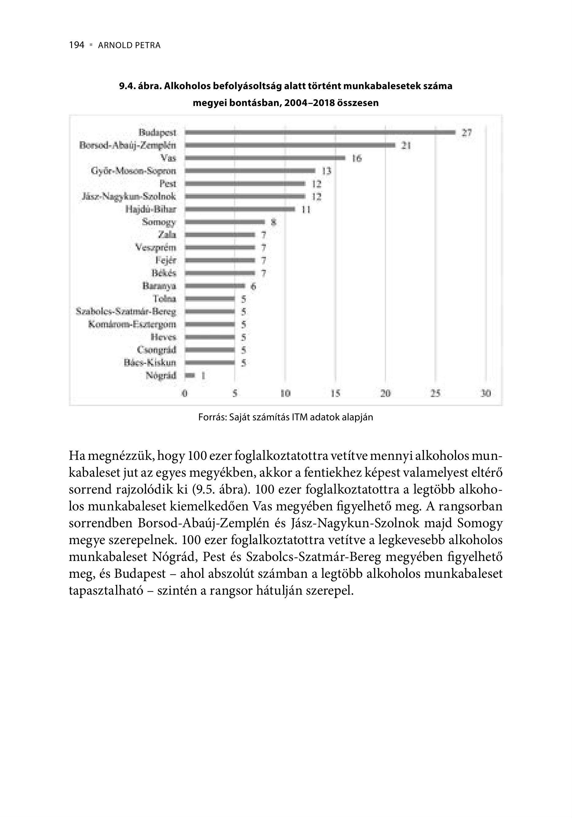 194 = ARNOLD PETRA 9.4. ábra. Alkoholos befolyásoltság alatt történt munkabalesetek száma megyei bontásban, 2004-2018 összesen Budapest = = ur — Borsul- Abauj-Zempkin | Was lé Cr Monon hogan Pest Ji’ Nagykum-S2olnok Hajdi-IBihar Somogy fala Vessprem Fehr Bid Baranya late. Sraboles-Sraimdr-Hereg Köomkror- Eterpom Has Caongrad Hace-K kin Kbgräil te I u al) ze a (LAIT = = ia 15 20 25 kü Forrás: Saját számítás ITM adatok alapján Ha megnézzük, hogy 100 ezer foglalkoztatottra vetítve mennyi alkoholos munkabaleset jut az egyes megyékben, akkor a fentiekhez képest valamelyest eltérő sorrend rajzolódik ki (9.5. ábra). 100 ezer foglalkoztatottra a legtöbb alkoholos munkabaleset kiemelkedően Vas megyében figyelhető meg. A rangsorban sorrendben Borsod-Abaúj-Zemplén és Jász-Nagykun-Szolnok majd Somogy megye szerepelnek. 100 ezer foglalkoztatottra vetítve a legkevesebb alkoholos munkabaleset Nógrád, Pest és Szabolcs-Szatmár-Bereg megyében figyelhető meg, és Budapest - ahol abszolút számban a legtöbb alkoholos munkabaleset tapasztalható - szintén a rangsor hátulján szerepel.