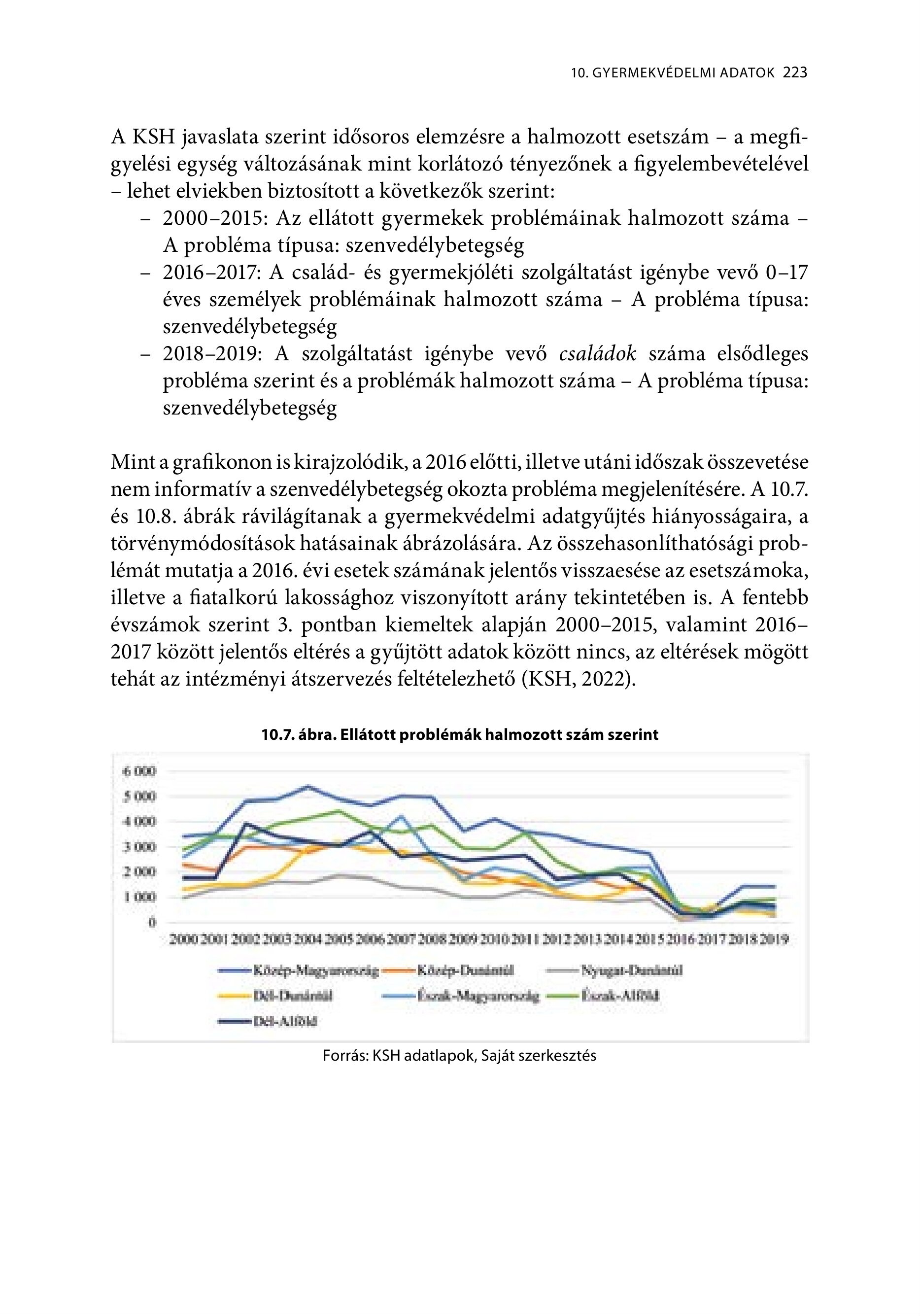 10. GYERMEKVÉDELMI ADATOK 223 A KSH javaslata szerint idősoros elemzésre a halmozott esetszám - a megfigyelési egység változásának mint korlátozó tényezőnek a figyelembevételével - lehet elviekben biztosított a következők szerint: - 2000-2015: Az ellátott gyermekek problémáinak halmozott száma A probléma típusa: szenvedélybetegség - 2016-2017: A család- és gyermekjóléti szolgáltatást igénybe vevő 0-17 éves személyek problémáinak halmozott száma - A probléma típusa: szenvedélybetegség - 2018-2019: A szolgáltatást igénybe vevő családok száma elsődleges probléma szerint és a problémák halmozott száma - A probléma típusa: szenvedélybetegség Mint a grafikonon is kirajzolódik, a 2016 előtti, illetve utáni időszak összevetése nem informatív a szenvedélybetegség okozta probléma megjelenítésére. A 10.7. és 10.8. ábrák rávilágítanak a gyermekvédelmi adatgyűjtés hiányosságaira, a törvénymódosítások hatásainak ábrázolására. Az összehasonlíthatósági problémát mutatja a 2016. évi esetek számának jelentős visszaesése az esetszámoka, illetve a fiatalkorú lakossághoz viszonyított arány tekintetében is. A fentebb évszámok szerint 3. pontban kiemeltek alapján 2000-2015, valamint 20162017 között jelentős eltérés a gyűjtött adatok között nincs, az eltérések mögött tehát az intézményi átszervezés feltételezhető (KSH, 2022). 6000 © (ta) 4 TN] 3000 2000 1 ia) 2000 2001 SOOT TG TM DS Dea OT SS SOM ON OP LE DIX AOL 202 205 2016207 DE ma Bite pS laggy errr —— Bed Dede Pépin eared ——- DH |S rel —— farak-Mayy ang —boal- Alk] oe AE Forras: KSH adatlapok, Sajat szerkesztés
