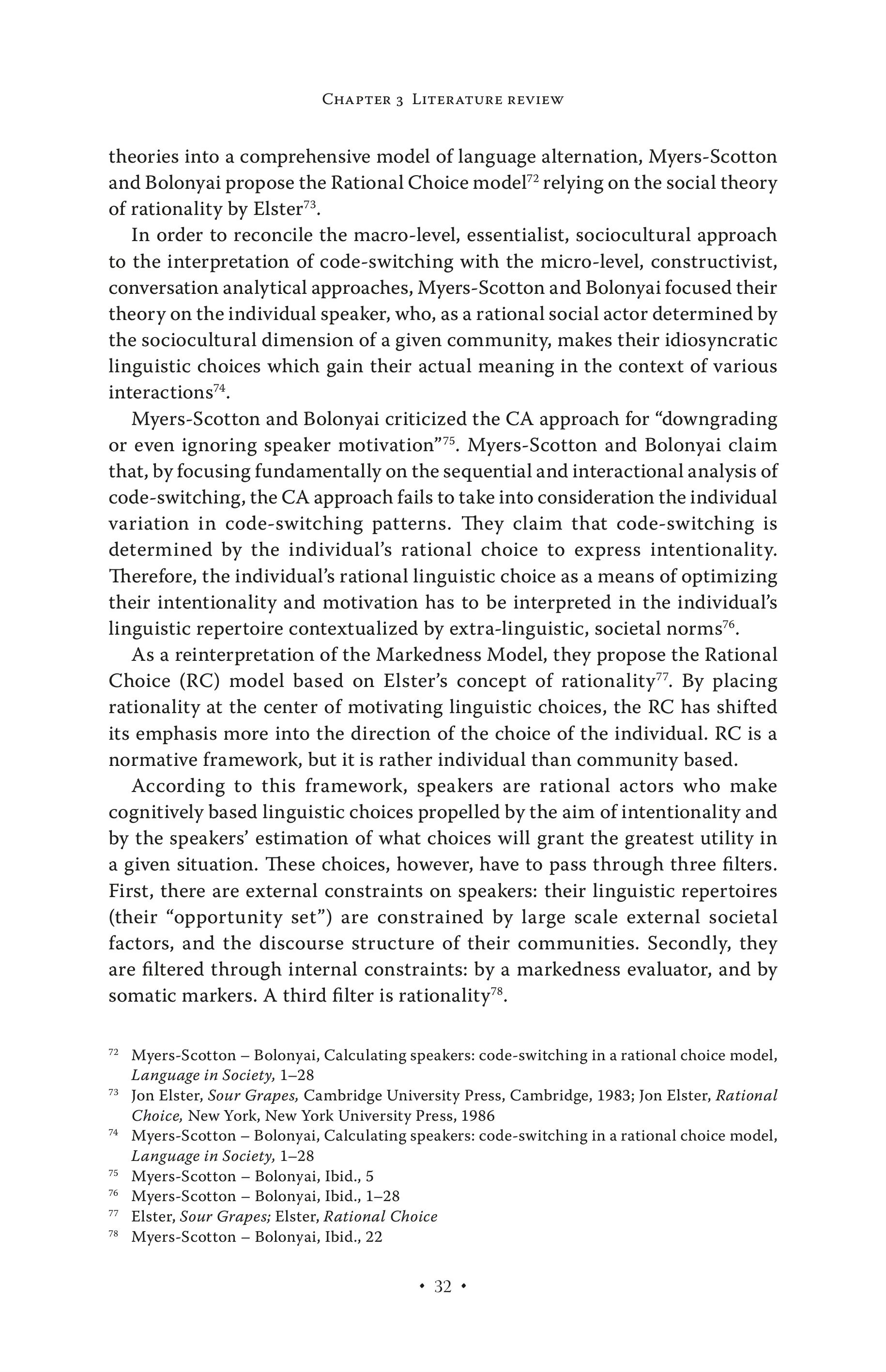 CHAPTER 3 LITERATURE REVIEW theories into a comprehensive model of language alternation, Myers-Scotton and Bolonyai propose the Rational Choice model? relying on the social theory of rationality by Elster". In order to reconcile the macro-level, essentialist, sociocultural approach to the interpretation of code-switching with the micro-level, constructivist, conversation analytical approaches, Myers-Scotton and Bolonyai focused their theory on the individual speaker, who, as a rational social actor determined by the sociocultural dimension of a given community, makes their idiosyncratic linguistic choices which gain their actual meaning in the context of various interactions”. Myers-Scotton and Bolonyai criticized the CA approach for “downgrading or even ignoring speaker motivation”. Myers-Scotton and Bolonyai claim that, by focusing fundamentally on the sequential and interactional analysis of code-switching, the CA approach fails to take into consideration the individual variation in code-switching patterns. They claim that code-switching is determined by the individual’s rational choice to express intentionality. Therefore, the individual’s rational linguistic choice as a means of optimizing their intentionality and motivation has to be interpreted in the individual’s linguistic repertoire contextualized by extra-linguistic, societal norms”. As a reinterpretation of the Markedness Model, they propose the Rational Choice (RC) model based on Elster’s concept of rationality’’. By placing rationality at the center of motivating linguistic choices, the RC has shifted its emphasis more into the direction of the choice of the individual. RC is a normative framework, but it is rather individual than community based. According to this framework, speakers are rational actors who make cognitively based linguistic choices propelled by the aim of intentionality and by the speakers’ estimation of what choices will grant the greatest utility in a given situation. These choices, however, have to pass through three filters. First, there are external constraints on speakers: their linguistic repertoires (their “opportunity set”) are constrained by large scale external societal factors, and the discourse structure of their communities. Secondly, they are filtered through internal constraints: by a markedness evaluator, and by somatic markers. A third filter is rationality”. Myers-Scotton — Bolonyai, Calculating speakers: code-switching in a rational choice model, Language in Society, 1-28 Jon Elster, Sour Grapes, Cambridge University Press, Cambridge, 1983; Jon Elster, Rational Choice, New York, New York University Press, 1986 Myers-Scotton — Bolonyai, Calculating speakers: code-switching in a rational choice model, Language in Society, 1-28 Myers-Scotton — Bolonyai, Ibid., 5 76 Myers-Scotton — Bolonyai, Ibid., 1-28 Elster, Sour Grapes; Elster, Rational Choice 78 Myers-Scotton — Bolonyai, Ibid., 22 + 32 +