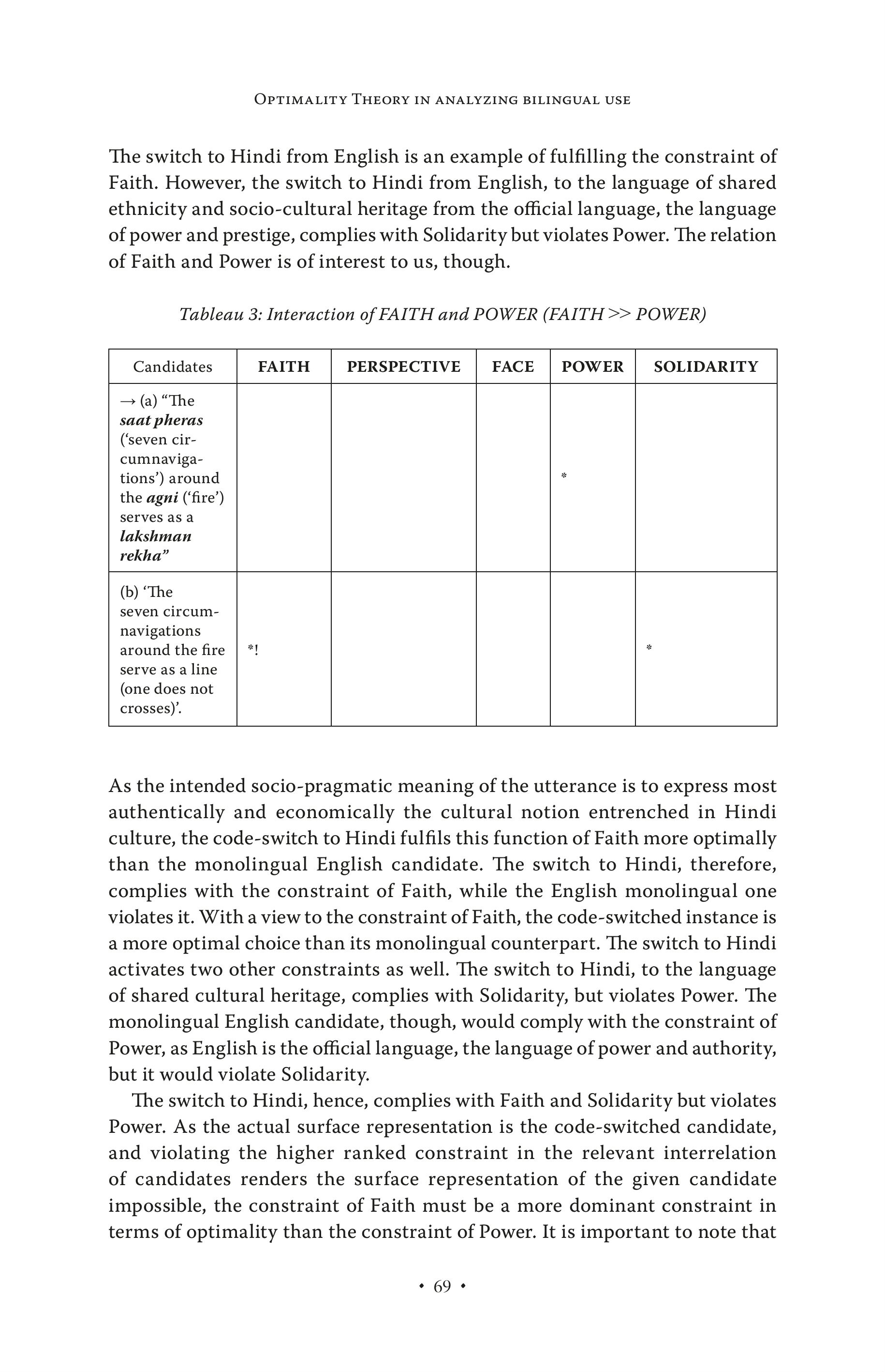 OPTIMALITY THEORY IN ANALYZING BILINGUAL USE The switch to Hindi from English is an example of fulfilling the constraint of Faith. However, the switch to Hindi from English, to the language of shared ethnicity and socio-cultural heritage from the official language, the language of power and prestige, complies with Solidarity but violates Power. The relation of Faith and Power is of interest to us, though. Tableau 3: Interaction of FAITH and POWER (FAITH >> POWER) Candidates FAITH PERSPECTIVE FACE | POWER SOLIDARITY — (a) “The saat pheras (‘seven circumnavigations’) around * the agni (‘fire’) serves asa lakshman rekha” (b) ‘The seven circumnavigations around the fire | *! * serve as a line (one does not crosses)’. As the intended socio-pragmatic meaning of the utterance is to express most authentically and economically the cultural notion entrenched in Hindi culture, the code-switch to Hindi fulfils this function of Faith more optimally than the monolingual English candidate. The switch to Hindi, therefore, complies with the constraint of Faith, while the English monolingual one violates it. With a view to the constraint of Faith, the code-switched instance is a more optimal choice than its monolingual counterpart. The switch to Hindi activates two other constraints as well. The switch to Hindi, to the language of shared cultural heritage, complies with Solidarity, but violates Power. The monolingual English candidate, though, would comply with the constraint of Power, as English is the official language, the language of power and authority, but it would violate Solidarity. The switch to Hindi, hence, complies with Faith and Solidarity but violates Power. As the actual surface representation is the code-switched candidate, and violating the higher ranked constraint in the relevant interrelation of candidates renders the surface representation of the given candidate impossible, the constraint of Faith must be a more dominant constraint in terms of optimality than the constraint of Power. It is important to note that + 69 +