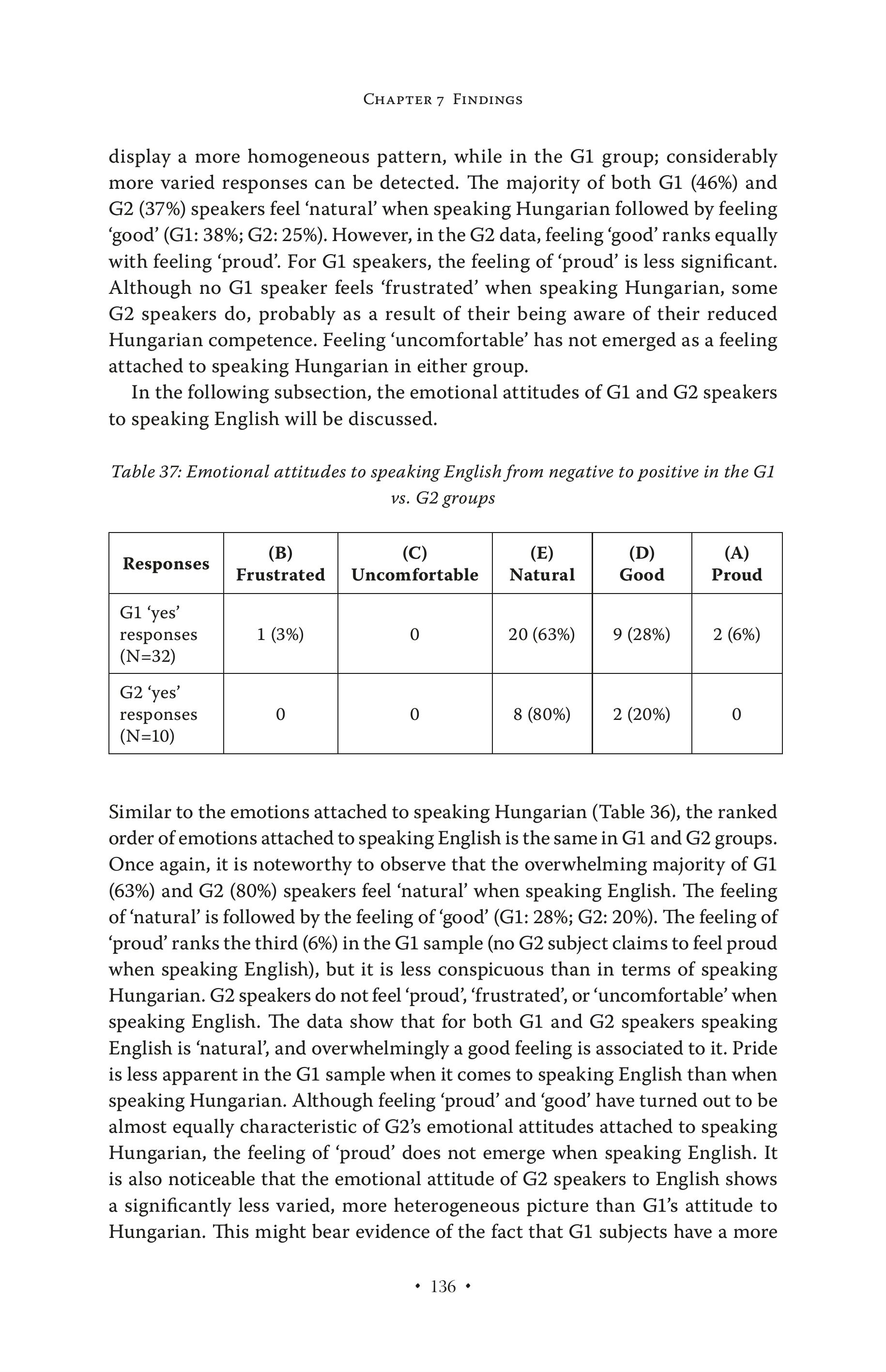CHAPTER 7 FINDINGS display a more homogeneous pattern, while in the G1 group; considerably more varied responses can be detected. Ihe majority of both G1 (4696) and G2 (37%) speakers feel ‘natural’ when speaking Hungarian followed by feeling ‘good’ (G1: 38%; G2: 25%). However, in the G2 data, feeling ‘good’ ranks equally with feeling ‘proud’. For G1 speakers, the feeling of ‘proud’ is less significant. Although no G1 speaker feels ‘frustrated’ when speaking Hungarian, some G2 speakers do, probably as a result of their being aware of their reduced Hungarian competence. Feeling ‘uncomfortable’ has not emerged as a feeling attached to speaking Hungarian in either group. In the following subsection, the emotional attitudes of G1 and G2 speakers to speaking English will be discussed. Table 37: Emotional attitudes to speaking English from negative to positive in the Gl vs. G2 groups (B) (C) (E) (D) (A) Responses Frustrated | Uncomfortable Natural Good Proud Gl ‘yes’ responses 1 (3%) 0 20 (63%) 9 (28%) 2 (6%) (N=32) G2 ‘yes’ responses 0 0 8 (80%) 2 (20%) 0 (N=10) Similar to the emotions attached to speaking Hungarian (Table 36), the ranked order of emotions attached to speaking English is the same in G1 and G2 groups. Once again, it is noteworthy to observe that the overwhelming majority of Gl (63%) and G2 (80%) speakers feel ‘natural’ when speaking English. The feeling of ‘natural’ is followed by the feeling of ‘good’ (G1: 28%; G2: 20%). The feeling of ‘proud’ ranks the third (6%) in the G1 sample (no G2 subject claims to feel proud when speaking English), but it is less conspicuous than in terms of speaking Hungarian. G2 speakers do not feel ‘proud’, ‘frustrated’, or ‘uncomfortable’ when speaking English. The data show that for both G1 and G2 speakers speaking English is ‘natural’, and overwhelmingly a good feeling is associated to it. Pride is less apparent in the Gl sample when it comes to speaking English than when speaking Hungarian. Although feeling ‘proud’ and ‘good’ have turned out to be almost equally characteristic of G2’s emotional attitudes attached to speaking Hungarian, the feeling of ‘proud’ does not emerge when speaking English. It is also noticeable that the emotional attitude of G2 speakers to English shows a significantly less varied, more heterogeneous picture than Gl’s attitude to Hungarian. This might bear evidence of the fact that G1 subjects have a more * 136 +