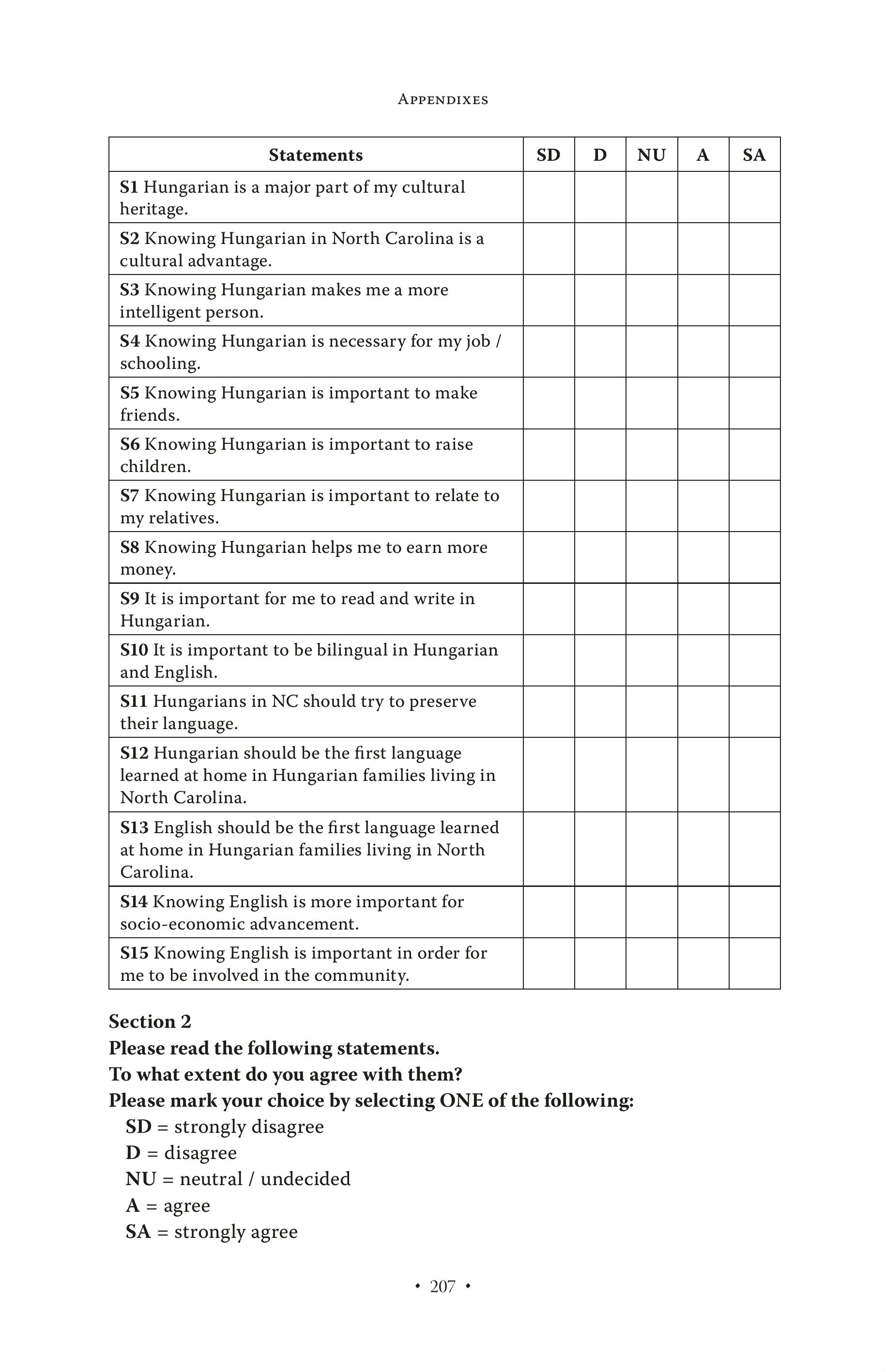 APPENDIXES Statements SD NU SA S1 Hungarian is a major part of my cultural heritage. S2 Knowing Hungarian in North Carolina is a cultural advantage. S3 Knowing Hungarian makes me a more intelligent person. S4 Knowing Hungarian is necessary for my job / schooling. S5 Knowing Hungarian is important to make friends. S6 Knowing Hungarian is important to raise children. S7 Knowing Hungarian is important to relate to my relatives. S8 Knowing Hungarian helps me to earn more money. S9 It is important for me to read and write in Hungarian. $10 It is important to be bilingual in Hungarian and English. $11 Hungarians in NC should try to preserve their language. $12 Hungarian should be the first language learned at home in Hungarian families living in North Carolina. $13 English should be the first language learned at home in Hungarian families living in North Carolina. $14 Knowing English is more important for socio-economic advancement. $15 Knowing English is important in order for me to be involved in the community. Section 2 Please read the following statements. To what extent do you agree with them? SD = strongly disagree D = disagree NU = neutral / undecided A = agree SA = strongly agree * 207 +