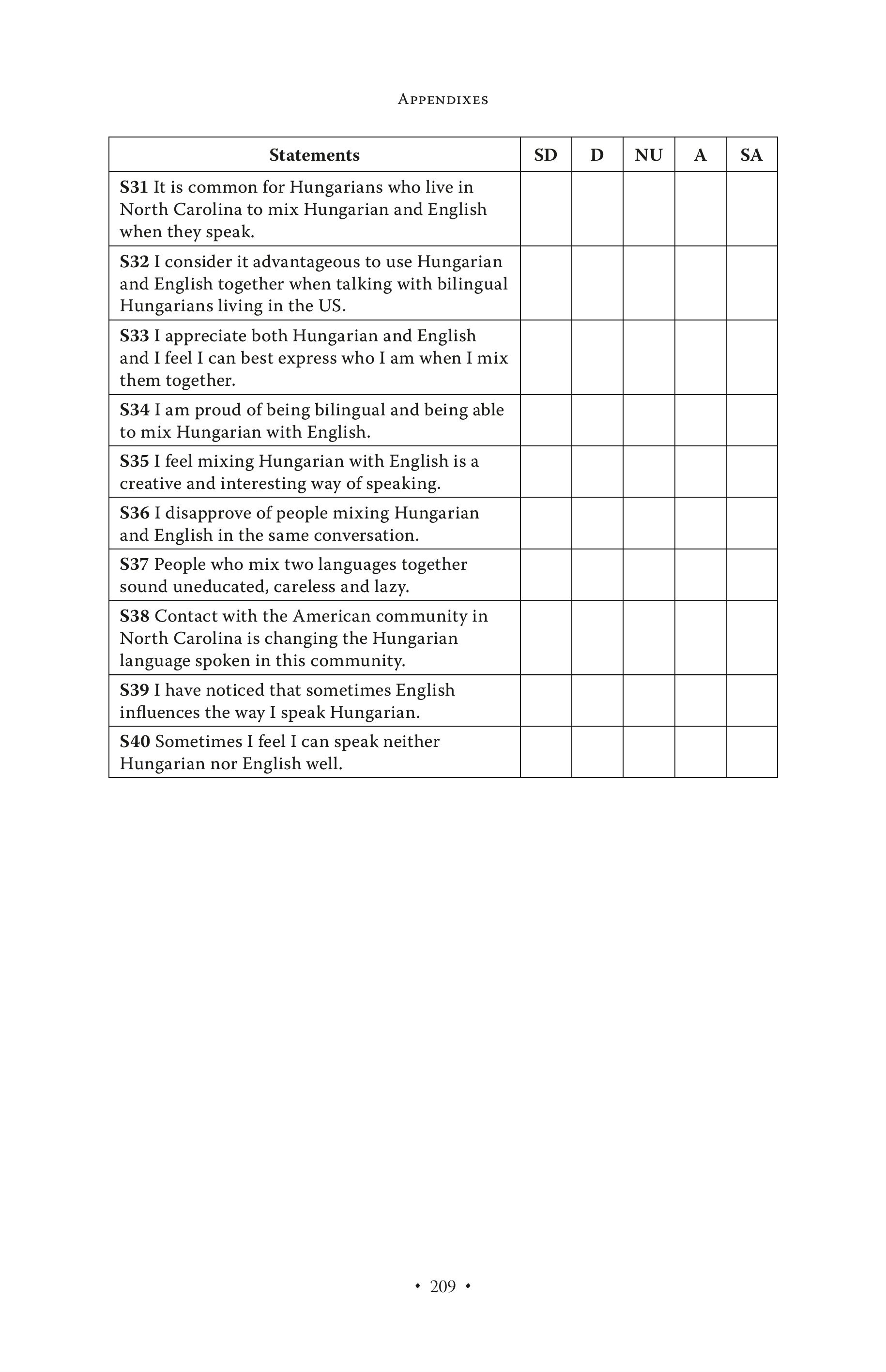 APPENDIXES Statements SD NU SA $31 It is common for Hungarians who live in North Carolina to mix Hungarian and English when they speak. $32 I consider it advantageous to use Hungarian and English together when talking with bilingual Hungarians living in the US. $33 I appreciate both Hungarian and English and I feel I can best express who I am when I mix them together. $34 Iam proud of being bilingual and being able to mix Hungarian with English. $35 I feel mixing Hungarian with English is a creative and interesting way of speaking. $36 I disapprove of people mixing Hungarian and English in the same conversation. $37 People who mix two languages together sound uneducated, careless and lazy. $38 Contact with the American community in North Carolina is changing the Hungarian language spoken in this community. $39 I have noticed that sometimes English influences the way I speak Hungarian. $40 Sometimes I feel I can speak neither Hungarian nor English well. * 209 ¢
