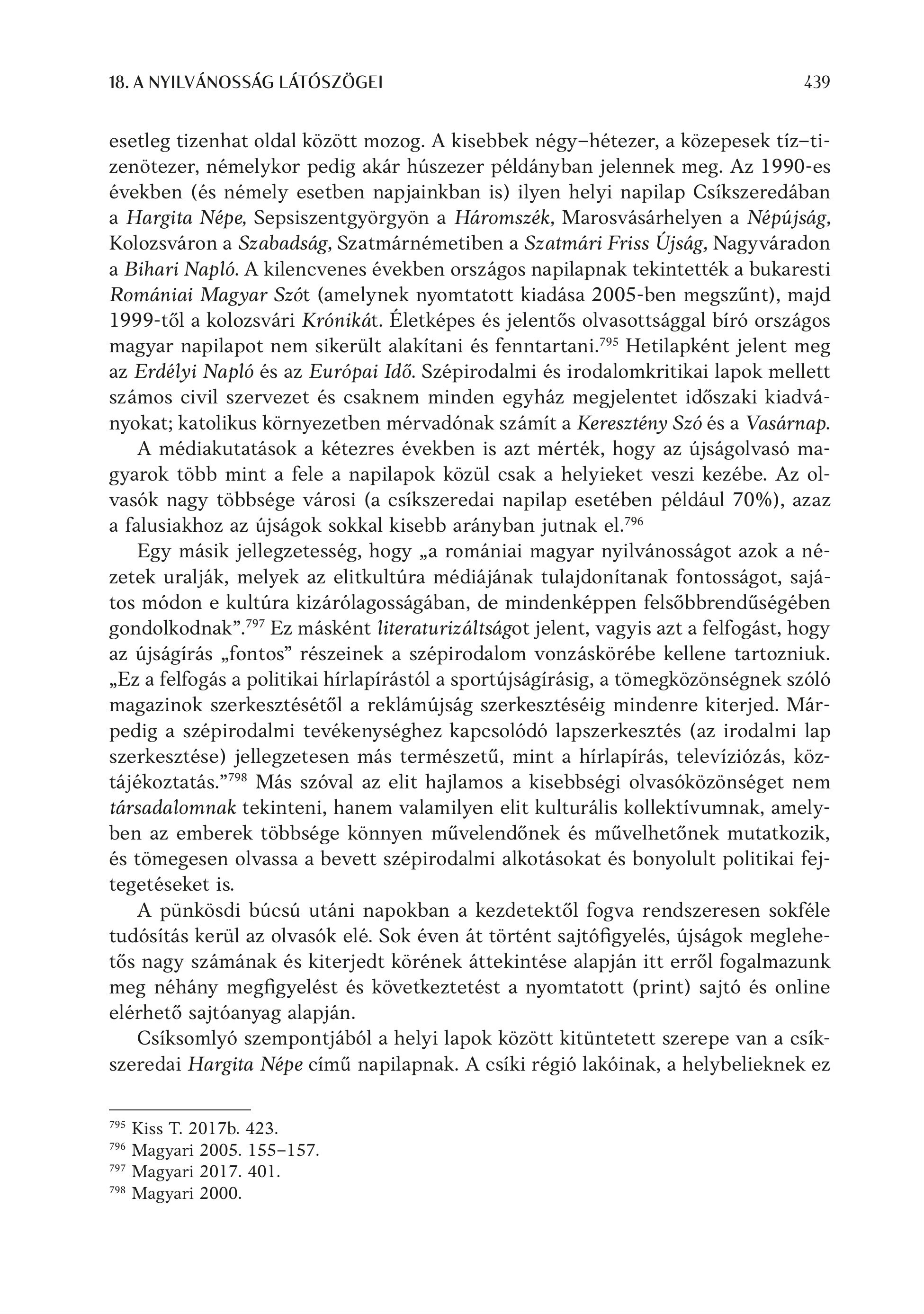 18. A NYILVÁNOSSÁG LÁTÓSZÖGEI 439 esetleg tizenhat oldal között mozog. A kisebbek négy-hétezer, a közepesek tíz-tizenötezer, némelykor pedig akár húszezer példányban jelennek meg. Az 1990-es években (és némely esetben napjainkban is) ilyen helyi napilap Csíkszeredában a Hargita Népe, Sepsiszentgyörgyön a Háromszék, Marosvásárhelyen a Népújság, Kolozsváron a Szabadság, Szatmárnémetiben a Szatmári Friss Újság, Nagyváradon a Bihari Napló. A kilencvenes években országos napilapnak tekintették a bukaresti Romániai Magyar Szót (amelynek nyomtatott kiadása 2005-ben megszűnt), majd 1999-től a kolozsvári Krónikát. Életképes és jelentős olvasottsággal bíró országos magyar napilapot nem sikerült alakítani és fenntartani." Hetilapként jelent meg az Erdélyi Napló és az Európai Idő. Szépirodalmi és irodalomkritikai lapok mellett számos civil szervezet és csaknem minden egyház megjelentet időszaki kiadványokat; katolikus környezetben mérvadónak számít a Keresztény Szó és a Vasárnap. A médiakutatások a kétezres években is azt mérték, hogy az újságolvasó magyarok több mint a fele a napilapok közül csak a helyieket veszi kezébe. Az olvasók nagy többsége városi (a csíkszeredai napilap esetében például 7090), azaz a falusiakhoz az újságok sokkal kisebb arányban jutnak el." Egy másik jellegzetesség, hogy ,a romániai magyar nyilvánosságot azok a nézetek uralják, melyek az elitkultúra médiájának tulajdonítanak fontosságot, sajátos módon e kultúra kizárólagosságában, de mindenképpen felsőbbrendűségében gondolkodnak"."" Ez másként literaturizáltságot jelent, vagyis azt a felfogást, hogy az újságírás , fontos" részeinek a szépirodalom vonzáskörébe kellene tartozniuk. magazinok szerkesztésétől a reklámújság szerkesztéséig mindenre kiterjed. Márpedig a szépirodalmi tevékenységhez kapcsolódó lapszerkesztés (az irodalmi lap szerkesztése) jellegzetesen más természetű, mint a hírlapírás, televíziózás, köztájékoztatás.""" Más szóval az elit hajlamos a kisebbségi olvasóközönséget nem társadalomnak tekinteni, hanem valamilyen elit kulturális kollektívumnak, amelyben az emberek többsége könnyen művelendőnek és művelhetőnek mutatkozik, és tömegesen olvassa a bevett szépirodalmi alkotásokat és bonyolult politikai fejtegetéseket is. A pünkösdi búcsú utáni napokban a kezdetektől fogva rendszeresen sokféle tudósítás kerül az olvasók elé. Sok éven át történt sajtófigyelés, újságok meglehetős nagy számának és kiterjedt körének áttekintése alapján itt erről fogalmazunk meg néhány megfigyelést és következtetést a nyomtatott (print) sajtó és online elérhető sajtóanyag alapján. Csíksomlyó szempontjából a helyi lapok között kitüntetett szerepe van a csikszeredai Hargita Népe című napilapnak. A csíki régió lakóinak, a helybelieknek ez 795 Kiss T. 2017b. 423. 796 Magyari 2005. 155-157. 797 Magyari 2017. 401. 798 Magyari 2000.
