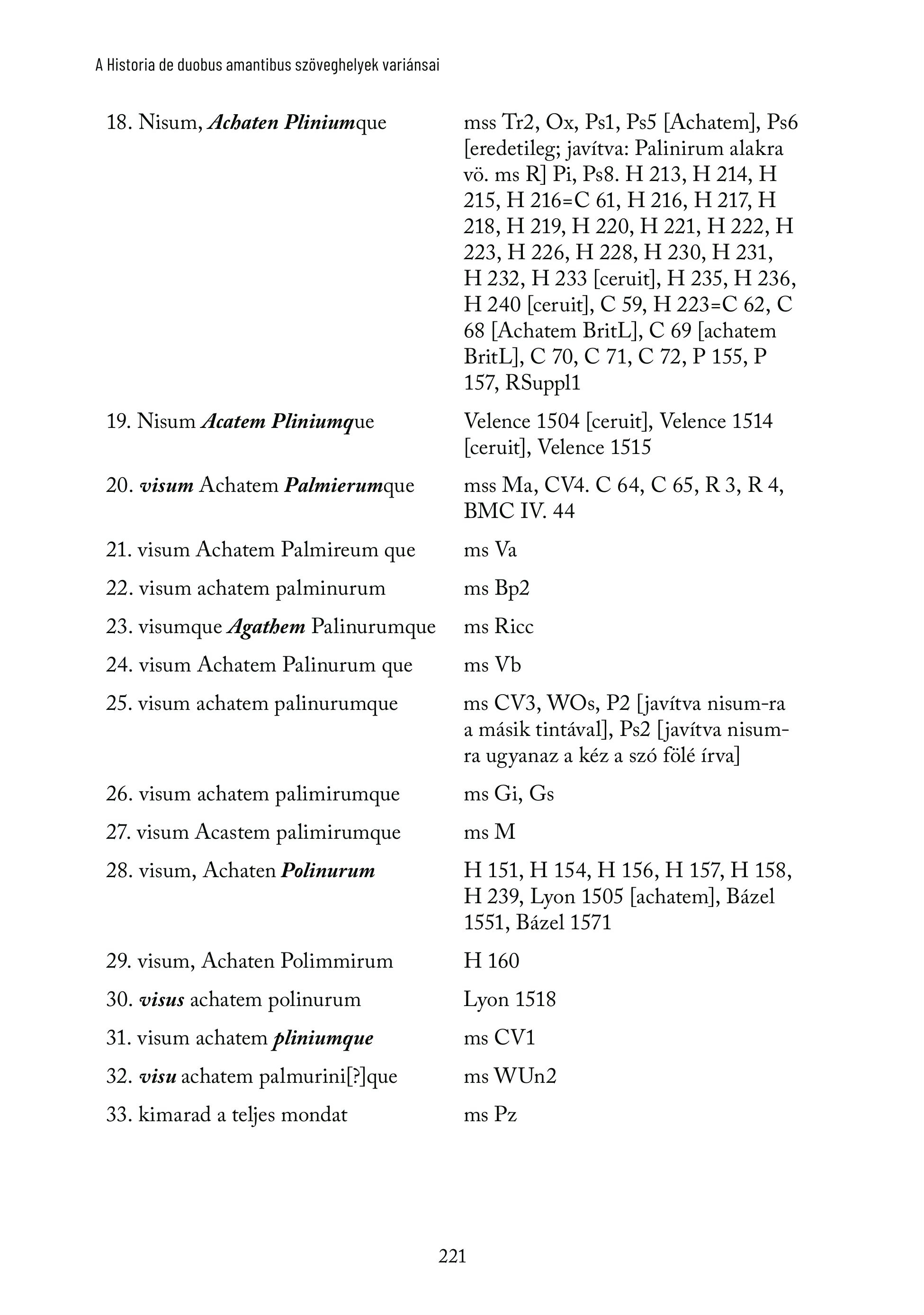 A Historia de duobus amantibus szöveghelyek variánsai 18. Nisum, Achaten Pliniumque 19. Nisum Acatem Pliniumque 20. visum Achatem Palmierumque 21. visum Achatem Palmireum que 22. visum achatem palminurum 23. visumque Agathem Palinurumque 24. visum Achatem Palinurum que 25. visum achatem palinurumque 26. visum achatem palimirumque 27. visum Acastem palimirumque 28. visum, Achaten Polinurum 29. visum, Achaten Polimmirum 30. visus achatem polinurum 31. visum achatem pliniumque 32. visu achatem palmurini[?]que 33. kimarad a teljes mondat mss Tr2, Ox, Ps1, Ps5 [Achatem], Ps6 leredetileg; javítva: Palinirum alakra vö. ms R] Pi, Ps8. H 213, H 214, H 215, H 216=C 61, H 216, H 217, H 218, H 219, H 220, H 221, H 222,H 223, H 226, H 228, H 230, H 231, H 232, H 233 [ceruit], H 235, H 236, H 240 [ceruit], C 59, H 223=C 62, C 68 [Achatem BritL], C 69 [achatem BritL], C 70, C 71, C 72, P 155, P 157, RSuppl1 Velence 1504 [ceruit], Velence 1514 [ceruit], Velence 1515 mss Ma, CV4. C 64, C 65, R3, R4, BMC IV. 44 ms Va ms Bp2 ms Ricc ms Vb ms CV3, WOs, P2 [javitva nisum-ra a masik tintaval], Ps2 [javitva nisumra ugyanaz a kéz a szó fölé írva] ms Gi, Gs ms M H 151, H 154, H 156, H 157, H 158, H 239, Lyon 1505 [achatem], Bázel 1551, Bazel 1571 H 160 Lyon 1518 ms CV1 ms WUn2 ms Pz