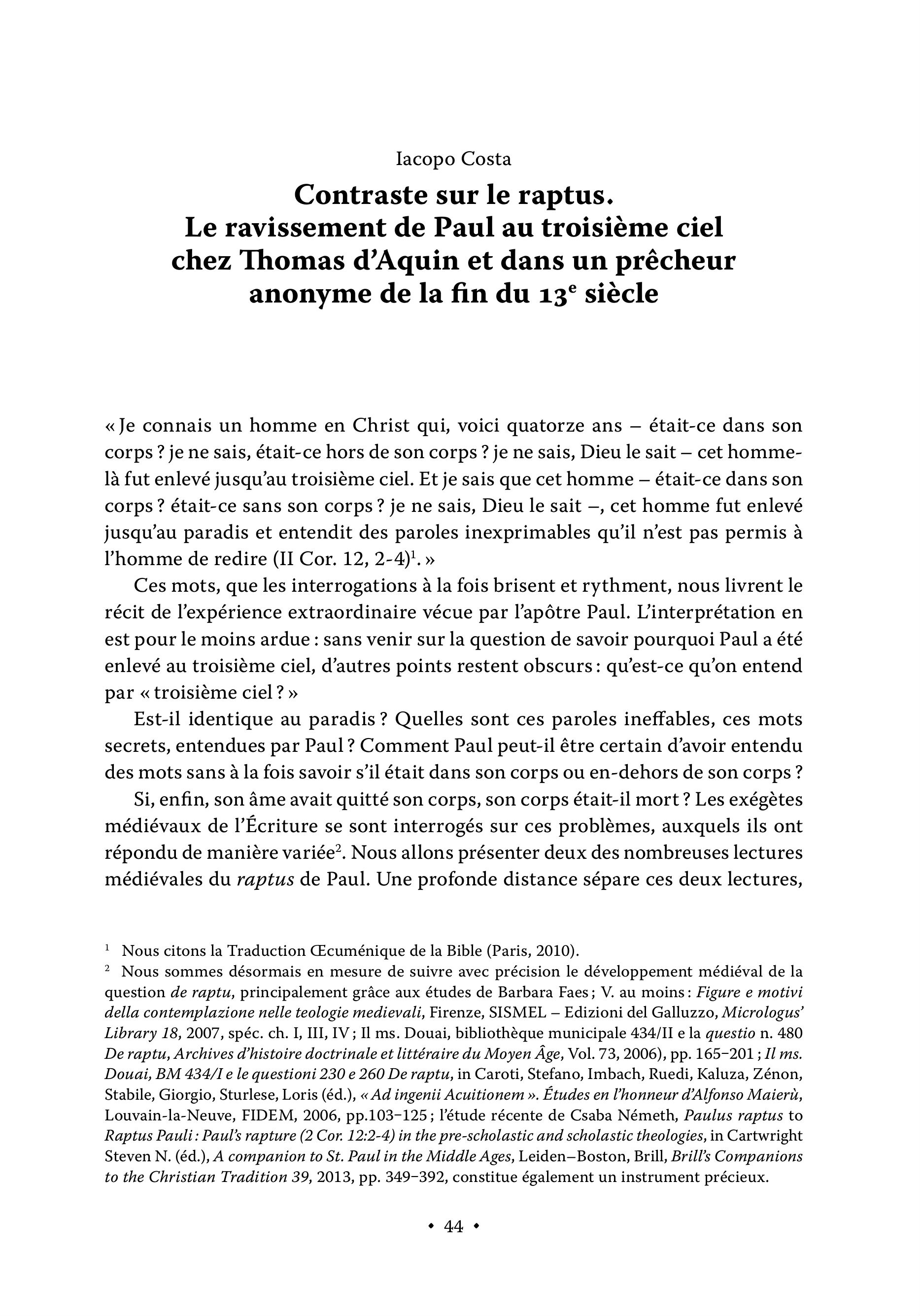 Iacopo Costa Contraste sur le raptus. Le ravissement de Paul au troisiéme ciel chez Thomas d’Aquin et dans un précheur anonyme de la fin du 13° siécle «Je connais un homme en Christ qui, voici quatorze ans — était-ce dans son corps ? je ne sais, était-ce hors de son corps ? je ne sais, Dieu le sait — cet hommelà fut enlevé jusqu’au troisième ciel. Et je sais que cet homme — était-ce dans son corps ? était-ce sans son corps ? je ne sais, Dieu le sait —, cet homme fut enlevé jusqu’au paradis et entendit des paroles inexprimables qu’il n’est pas permis à l’homme de redire (II Cor. 12, 2-4)". » Ces mots, que les interrogations à la fois brisent et rythment, nous livrent le récit de l'expérience extraordinaire vécue par l’apôtre Paul. L'interprétation en est pour le moins ardue: sans venir sur la question de savoir pourquoi Paul a été enlevé au troisiéme ciel, d’autres points restent obscurs: qu’est-ce qu’on entend par «troisième ciel ? » Est-il identique au paradis ? Quelles sont ces paroles ineffables, ces mots secrets, entendues par Paul ? Comment Paul peut-il être certain d’avoir entendu des mots sans à la fois savoir s’il était dans son corps ou en-dehors de son corps ? Si, enfin, son âme avait quitté son corps, son corps était-il mort ? Les exégètes médiévaux de l’Écriture se sont interrogés sur ces problèmes, auxquels ils ont répondu de manière variée?. Nous allons présenter deux des nombreuses lectures médiévales du raptus de Paul. Une profonde distance sépare ces deux lectures, 1 Nous citons la Traduction Œcuménique de la Bible (Paris, 2010). 2 Nous sommes désormais en mesure de suivre avec précision le développement médiéval de la question de raptu, principalement grâce aux études de Barbara Faes; V. au moins: Figure e motivi della contemplazione nelle teologie medievali, Firenze, SISMEL - Edizioni del Galluzzo, Micrologus’ Library 18, 2007, spéc. ch. I, III, IV; Il ms. Douai, bibliothéque municipale 434/II e la questio n. 480 De raptu, Archives @histoire doctrinale et littéraire du Moyen Age, Vol. 73, 2006), pp. 165-201 ; Il ms. Douai, BM 434/1 e le questioni 230 e 260 De raptu, in Caroti, Stefano, Imbach, Ruedi, Kaluza, Zénon, Stabile, Giorgio, Sturlese, Loris (éd.), « Ad ingenii Acuitionem ». Études en l'honneur d’Alfonso Maierü, Louvain-la-Neuve, FIDEM, 2006, pp.103-125; l’étude récente de Csaba Németh, Paulus raptus to Raptus Pauli: Paul’s rapture (2 Cor. 12:2-4) in the pre-scholastic and scholastic theologies, in Cartwright Steven N. (éd.), A companion to St. Paul in the Middle Ages, Leiden—Boston, Brill, Brill’s Companions to the Christian Tradition 39, 2013, pp. 349-392, constitue également un instrument précieux. + 44 ¢