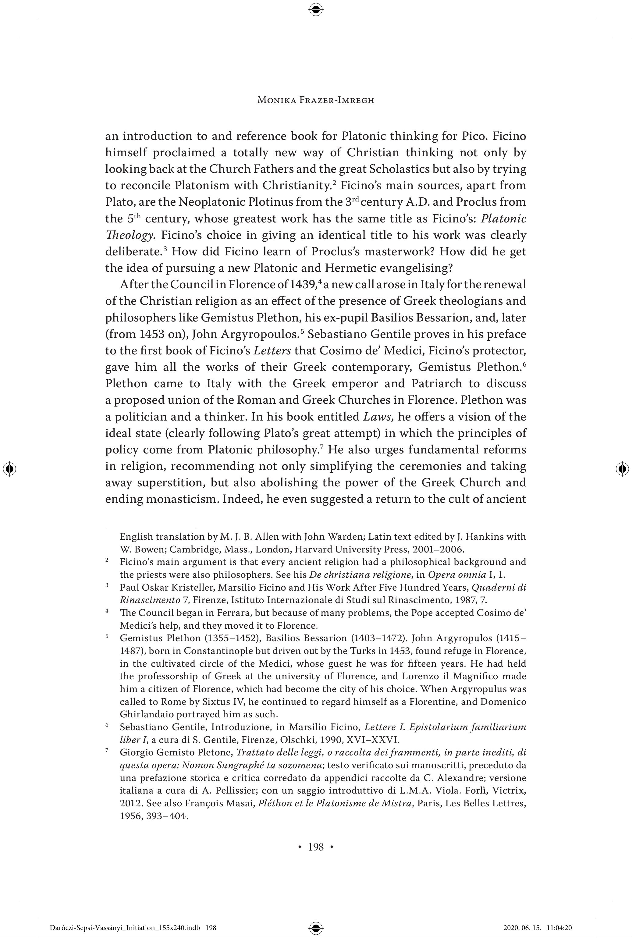 MONIKA FRAZER-IMREGH an introduction to and reference book for Platonic thinking for Pico. Ficino himself proclaimed a totally new way of Christian thinking not only by looking back at the Church Fathers and the great Scholastics but also by trying to reconcile Platonism with Christianity.? Ficino’s main sources, apart from Plato, are the Neoplatonic Plotinus from the 3" century A.D. and Proclus from the 5'* century, whose greatest work has the same title as Ficino’s: Platonic Theology. Ficino’s choice in giving an identical title to his work was clearly deliberate.” How did Ficino learn of Proclus’s masterwork? How did he get the idea of pursuing a new Platonic and Hermetic evangelising? After the Council in Florence of 1439,*a new call arose in Italy for the renewal of the Christian religion as an effect of the presence of Greek theologians and philosophers like Gemistus Plethon, his ex-pupil Basilios Bessarion, and, later (from 1453 on), John Argyropoulos.® Sebastiano Gentile proves in his preface to the first book of Ficino’s Letters that Cosimo de’ Medici, Ficino’s protector, gave him all the works of their Greek contemporary, Gemistus Plethon.° Plethon came to Italy with the Greek emperor and Patriarch to discuss a proposed union of the Roman and Greek Churches in Florence. Plethon was a politician and a thinker. In his book entitled Laws, he offers a vision of the ideal state (clearly following Plato’s great attempt) in which the principles of policy come from Platonic philosophy.’ He also urges fundamental reforms in religion, recommending not only simplifying the ceremonies and taking away superstition, but also abolishing the power of the Greek Church and ending monasticism. Indeed, he even suggested a return to the cult of ancient English translation by M. J. B. Allen with John Warden; Latin text edited by J. Hankins with W. Bowen; Cambridge, Mass., London, Harvard University Press, 2001-2006. Ficino’s main argument is that every ancient religion had a philosophical background and the priests were also philosophers. See his De christiana religione, in Opera omnia I, 1. 3 Paul Oskar Kristeller, Marsilio Ficino and His Work After Five Hundred Years, Quaderni di Rinascimento 7, Firenze, Istituto Internazionale di Studi sul Rinascimento, 1987, 7. The Council began in Ferrara, but because of many problems, the Pope accepted Cosimo de’ Medici’s help, and they moved it to Florence. 5 Gemistus Plethon (1355-1452), Basilios Bessarion (1403-1472). John Argyropulos (14151487), born in Constantinople but driven out by the Turks in 1453, found refuge in Florence, in the cultivated circle of the Medici, whose guest he was for fifteen years. He had held the professorship of Greek at the university of Florence, and Lorenzo il Magnifico made him a citizen of Florence, which had become the city of his choice. When Argyropulus was called to Rome by Sixtus IV, he continued to regard himself as a Florentine, and Domenico Ghirlandaio portrayed him as such. Sebastiano Gentile, Introduzione, in Marsilio Ficino, Lettere I. Epistolarium familiarium liber I, acura di S. Gentile, Firenze, Olschki, 1990, XVI-XXVI. Giorgio Gemisto Pletone, Trattato delle leggi, o raccolta dei frammenti, in parte inediti, di questa opera: Nomon Sungraphé ta sozomena; testo verificato sui manoscritti, preceduto da una prefazione storica e critica corredato da appendici raccolte da C. Alexandre; versione italiana a cura di A. Pellissier; con un saggio introduttivo di L.M.A. Viola. Forli, Victrix, 2012. See also François Masai, Pléthon et le Platonisme de Mistra, Paris, Les Belles Lettres, 1956, 393-404. + 198 + Daréczi-Sepsi-Vassänyi_Initiation_155x240.indb 198 6 2020.06.15. 11:04:20
