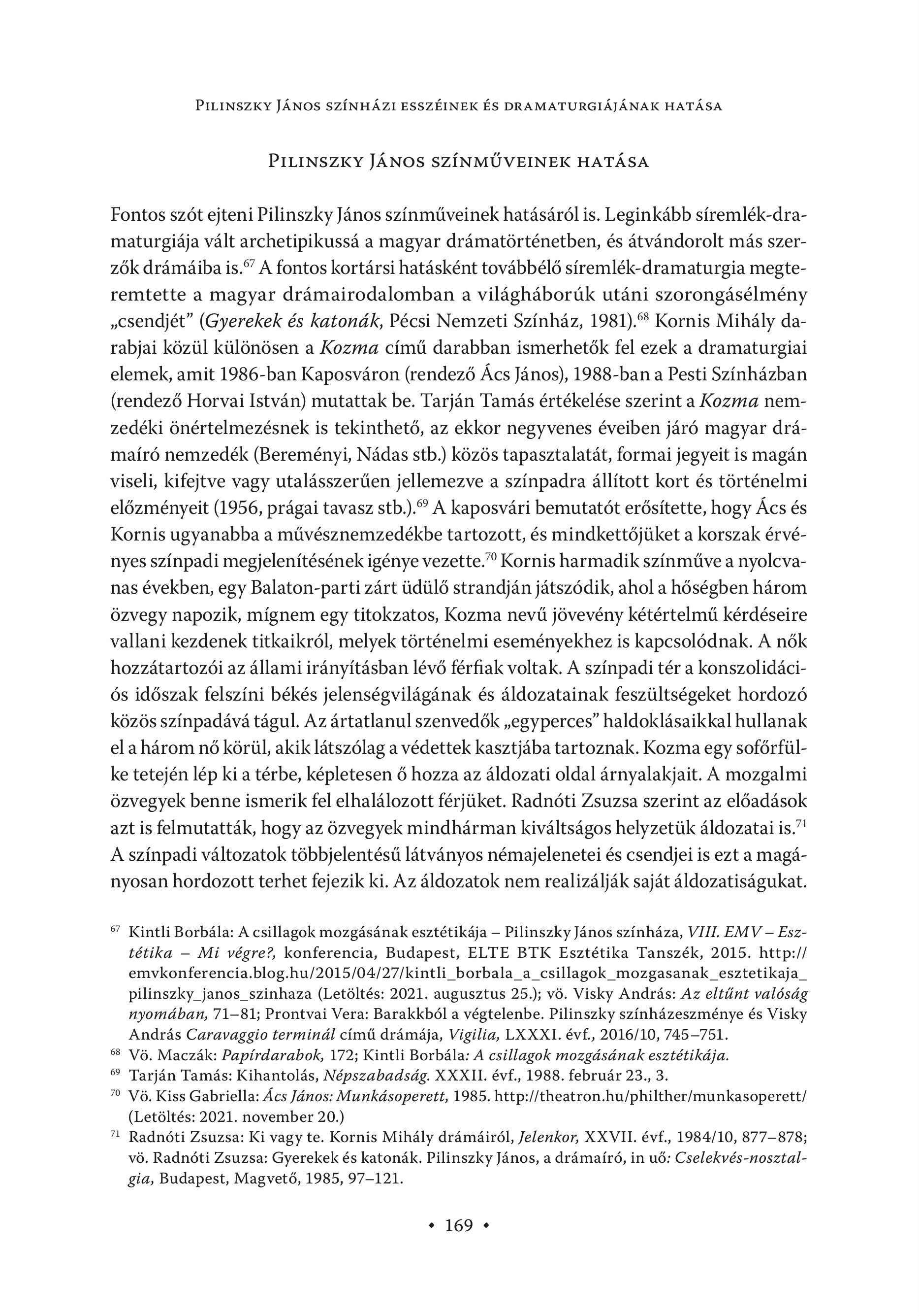 PILINSZKY JÁNOS SZÍNHÁZI ESSZÉINEK ÉS DRAMATURGIÁJÁNAK HATÁSA PILINSZKY JÁNOS SZÍNMŰVEINEK HATÁSA Fontos szót ejteni Pilinszky János színműveinek hatásáról is. Leginkább síremlék-dramaturgiája vált archetipikussá a magyar drámatörténetben, és átvándorolt más szerzők drámáiba is." A fontos kortársi hatásként továbbélő síremlék-dramaturgia megteremtette a magyar drámairodalomban a világháborúk utáni szorongásélmény , csendjét" (Gyerekek és katonák, Pécsi Nemzeti Színház, 1981)." Kornis Mihály darabjai közül különösen a Kozma című darabban ismerhetők fel ezek a dramaturgiai elemek, amit 1986-ban Kaposváron (rendező Ács János), 1988-ban a Pesti Színházban (rendező Horvai István) mutattak be. Tarján Tamás értékelése szerint a Kozma nemzedéki önértelmezésnek is tekinthető, az ekkor negyvenes éveiben járó magyar drámaíró nemzedék (Bereményi, Nádas stb.) közös tapasztalatát, formai jegyeit is magán viseli, kifejtve vagy utalásszerűen jellemezve a színpadra állított kort és történelmi előzményeit (1956, prágai tavasz stb.)."? A kaposvári bemutatót erősítette, hogy Ács és Kornis ugyanabba a művésznemzedékbe tartozott, és mindkettőjüket a korszak érvényes színpadi megjelenítésének igénye vezette." Kornis harmadik színműve a nyolcvanas években, egy Balaton-parti zárt üdülő strandján játszódik, ahol a hőségben három özvegy napozik, mígnem egy titokzatos, Kozma nevű jövevény kétértelmű kérdéseire vallani kezdenek titkaikról, melyek történelmi eseményekhez is kapcsolódnak. A nők hozzátartozói az állami irányításban lévő férfiak voltak. A színpadi tér a konszolidációs időszak felszíni békés jelenségvilágának és áldozatainak feszültségeket hordozó közös színpadává tágul. Az ártatlanul szenvedők , egyperces" haldoklásaikkal hullanak el ahárom nő körül, akik látszólag a védettek kasztjába tartoznak. Kozma egy sofőrfülke tetején lép ki a térbe, képletesen ő hozza az áldozati oldal árnyalakjait. A mozgalmi özvegyek benne ismerik fel elhalálozott férjüket. Radnóti Zsuzsa szerint az előadások azt is felmutatták, hogy az özvegyek mindhárman kiváltságos helyzetük áldozatai is." A szinpadi valtozatok tobbjelentést latvanyos némajelenetei és csendjei is ezt a maganyosan hordozott terhet fejezik ki. Az áldozatok nem realizálják saját áldozatiságukat. §7 Kintli Borbála: A csillagok mozgásának esztétikája — Pilinszky János színháza, VIII. EMV - Esztétika — Mi végre?, konferencia, Budapest, ELTE BTK Esztétika Tanszék, 2015. http:// emvkonferencia.blog.hu/2015/04/27/kintli_borbala_a_csillagok_mozgasanak_esztetikaja_ pilinszky_janos_szinhaza (Letöltés: 2021. augusztus 25.); vö. Visky András: Az eltűnt valóság nyomában, 71-81; Prontvai Vera: Barakkból a végtelenbe. Pilinszky színházeszménye és Visky András Caravaggio terminál című drámája, Vigilia, LXXXI. évf., 2016/10, 745—751. 68 Vö. Maczák: Papírdarabok, 172; Kintli Borbála: A csillagok mozgásának esztétikája. ® Tarjan Tamas: Kihantolas, Népszabadsdg. XXXII. évf., 1988. februar 23., 3. 70 V6. Kiss Gabriella: Acs Janos: Munkdsoperett, 1985. http://theatron.hu/philther/munkasoperett/ (Letöltés: 2021. november 20.) 7. Radnóti Zsuzsa: Ki vagy te. Kornis Mihály drámáiról, Jelenkor, XXVII. evf., 1984/10, 877-878; vö. Radnóti Zsuzsa: Gyerekek és katonák. Pilinszky János, a drámaíró, in uő: Cselekvés-nosztalgia, Budapest, Magvetö, 1985, 97-121. + 169 »