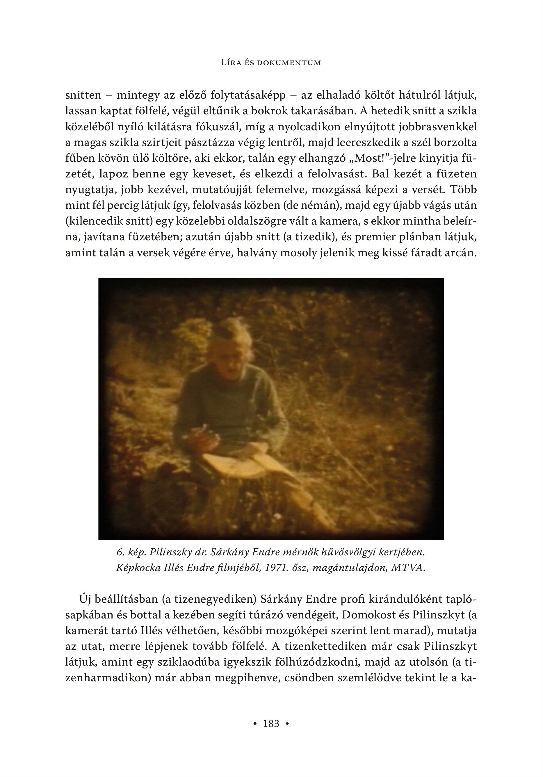 LÍRA ÉS DOKUMENTUM snitten — mintegy az előző folytatásaképp — az elhaladó költőt hátulról látjuk, lassan kaptat fölfelé, végül eltűnik a bokrok takarásában. A hetedik snitt a szikla közeléből nyíló kilátásra fókuszál, míg a nyolcadikon elnyújtott jobbrasvenkkel a magas szikla szíirtjeit pásztázza végig lentről, majd leereszkedik a szél borzolta fűben kövön ülő költőre, aki ekkor, talán egy elhangzó ,Most!”-jelre kinyitja füzetét, lapoz benne egy keveset, és elkezdi a felolvasást. Bal kezét a füzeten nyugtatja, jobb kezével, mutatóujját felemelve, mozgássá képezi a versét. Több mint fél percig látjuk így, felolvasás közben (de némán), majd egy újabb vágás után (kilencedik snitt) egy közelebbi oldalszögre vált a kamera, s ekkor mintha beleírna, javítana füzetében; azután újabb snitt (a tizedik), és premier plánban látjuk, amint talán a versek végére érve, halvány mosoly jelenik meg kissé fáradt arcán. Új beállításban (a tizenegyediken) Sárkány Endre profi kirándulóként taplósapkában és bottal a kezében segíti túrázó vendégeit, Domokost és Pilinszkyt (a kamerát tartó Illés vélhetően, későbbi mozgóképei szerint lent marad), mutatja az utat, merre lépjenek tovább fölfelé. A tizenkettediken mar csak Pilinszkyt látjuk, amint egy sziklaodúba igyekszik fölhúzódzkodni, majd az utolsón (a tizenharmadikon) már abban megpihenve, csöndben szemlélődve tekint le a kae 183.