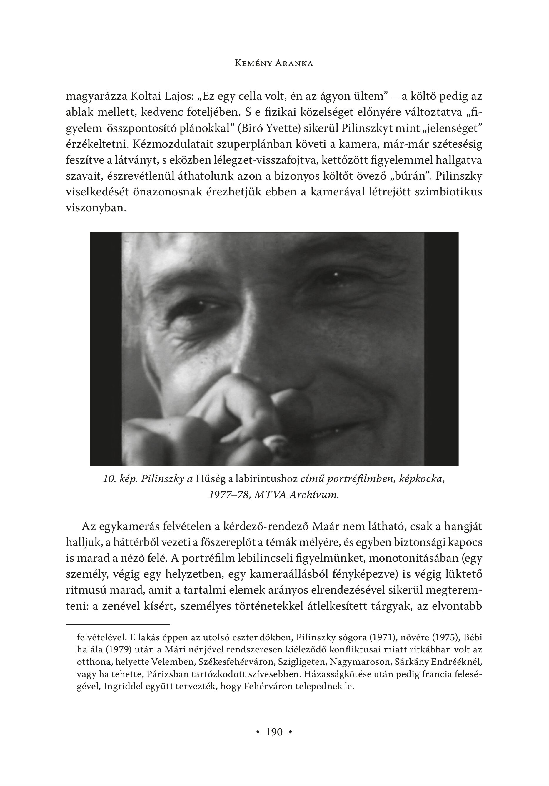 KEMÉNY ARANKA magyarázza Koltai Lajos: , Ez egy cella volt, én az ágyon ültem" — a költő pedig az ablak mellett, kedvenc foteljében. S e fizikai közelséget előnyére változtatva , figyelem-összpontosító plánokkal" (Biró Yvette) sikerül Pilinszkyt mint , jelenséget" érzékeltetni. Kézmozdulatait szuperplánban követi a kamera, már-már szétesésig feszítve a látványt, s eközben lélegzet-visszafojtva, kettőzött figyelemmel hallgatva szavait, észrevétlenül áthatolunk azon a bizonyos költőt övező ,búrán" Pilinszky viselkedését önazonosnak érezhetjük ebben a kamerával létrejött szimbiotikus viszonyban. Az egykamerás felvételen a kérdező-rendező Maár nem látható, csak a hangját halljuk, a háttérből vezeti a főszereplőt a témák mélyére, és egyben biztonsági kapocs is marad a néző felé. A portréfilm lebilincseli figyelmünket, monotonitásában (egy személy, végig egy helyzetben, egy kameraállásból fényképezve) is végig lüktető ritmusú marad, amit a tartalmi elemek arányos elrendezésével sikerül megteremteni: a zenével kísért, személyes történetekkel átlelkesített tárgyak, az elvontabb felvételével. E lakás éppen az utolsó esztendőkben, Pilinszky sógora (1971), nővére (1975), Bébi halála (1979) után a Mári nénjével rendszeresen kiéleződő konfliktusai miatt ritkábban volt az otthona, helyette Velemben, Székesfehérváron, Szigligeten, Nagymaroson, Sárkány Endrééknél, vagy ha tehette, Párizsban tartózkodott szívesebben. Házasságkötése után pedig francia feleségével, Ingriddel együtt tervezték, hogy Fehérváron telepednek le. ¢ 190 +