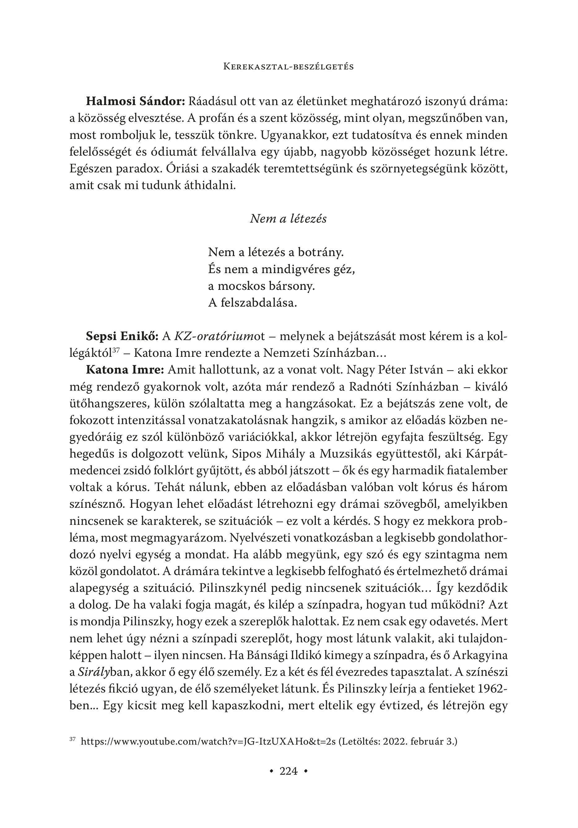 KEREKASZTAL-BESZÉLGETÉS Halmosi Sándor: Ráadásul ott van az életünket meghatározó iszonyú dráma: a közösség elvesztése. A profán és a szent közösség, mint olyan, megszűnőben van, most romboljuk le, tesszük tönkre. Ugyanakkor, ezt tudatosítva és ennek minden felelősségét és ódiumát felvállalva egy újabb, nagyobb közösséget hozunk létre. Egészen paradox. Óriási a szakadék teremtettségünk és szörnyetegségünk között, amit csak mi tudunk áthidalni. Nem a létezés Nem a létezés a botrány. Es nem a mindigvéres géz, a mocskos barsony. A felszabdaläsa. Sepsi Enikő: A KZ-oratóriumot — melynek a bejátszását most kérem is a kollégáktól" — Katona Imre rendezte a Nemzeti Színházban... Katona Imre: Amit hallottunk, az a vonat volt. Nagy Péter István — aki ekkor még rendező gyakornok volt, azóta már rendező a Radnóti Színházban -— kiváló ütőhangszeres, külön szólaltatta meg a hangzásokat. Ez a bejátszás zene volt, de fokozott intenzitással vonatzakatolásnak hangzik, s amikor az előadás közben negyedóráig ez szól különböző variációkkal, akkor létrejön egyfajta feszültség. Egy hegedűs is dolgozott velünk, Sipos Mihály a Muzsikás együttestől, aki Kárpátmedencei zsidó folklórt gyűjtött, és abból játszott — ők és egy harmadik fiatalember voltak a kórus. Tehát nálunk, ebben az előadásban valóban volt kórus és három színésznő. Hogyan lehet előadást létrehozni egy drámai szövegből, amelyikben nincsenek se karakterek, se szituációk — ez volt a kérdés. S hogy ez mekkora probléma, most megmagyarázom. Nyelvészeti vonatkozásban a legkisebb gondolathordozó nyelvi egység a mondat. Ha alább megyünk, egy szó és egy szintagma nem közöl gondolatot. A drámára tekintve a legkisebb felfogható és értelmezhető drámai alapegység a szituáció. Pilinszkynél pedig nincsenek szituációk... Így kezdődik a dolog. De ha valaki fogja magát, és kilép a színpadra, hogyan tud működni? Azt is mondja Pilinszky, hogy ezek a szereplők halottak. Ez nem csak egy odavetés. Mert nem lehet úgy nézni a színpadi szereplőt, hogy most látunk valakit, aki tulajdonképpen halott - ilyen nincsen. Ha Bánsági Ildikó kimegy a színpadra, és ő Arkagyina a Sirályban, akkor ő egy élő személy. Ez a két és fél évezredes tapasztalat. A színészi létezés fikció ugyan, de élő személyeket látunk. És Pilinszky leírja a fentieket 1962ben... Egy kicsit meg kell kapaszkodni, mert eltelik egy évtized, és létrejön egy 57 https://www.youtube.com/watch?v=JG-ItzUX A Ho&t=2s (Letöltés: 2022. február 3.) + 224 +