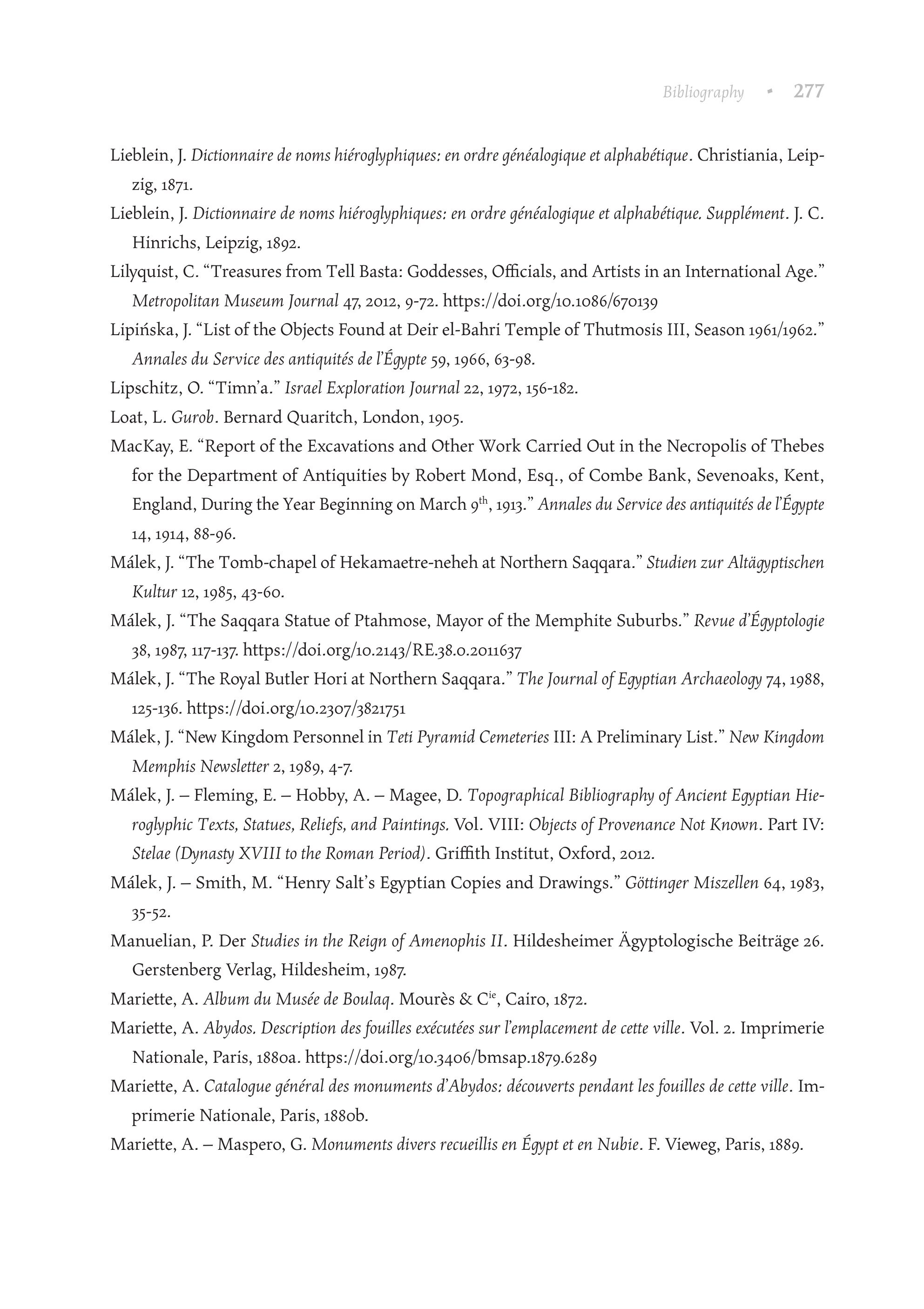 Lieblein, J. Dictionnaire de noms hiéroglyphiques: en ordre généalogique et alphabétique. Christiania, Leipzig, 1871. Lieblein, J. Dictionnaire de noms hiéroglyphiques: en ordre généalogique et alphabétique. Supplément. J. C. Hinrichs, Leipzig, 1892. Lilyquist, C. “Treasures from Tell Basta: Goddesses, Officials, and Artists in an International Age.” Metropolitan Museum Journal 47, 2012, 9-72. https://doi.org/10.1086/670139 Lipiriska, J. “List of the Objects Found at Deir el-Bahri Temple of Thutmosis III, Season 1961/1962.” Annales du Service des antiquités de l'Égypte 59, 1966, 63-98. Lipschitz, ©. "Timna." Israel Exploration Journal 22, 1972, 156-182. Loat, L. Gurob. Bernard Ouaritch, London, 1905. MacKay, E. “Report of the Excavations and Other Work Carried Out in the Necropolis of Thebes for the Department of Antiquities by Robert Mond, Esq., of Combe Bank, Sevenoaks, Kent, England, During the Year Beginning on March 9", 1913.” Annales du Service des antiquités de l'Eqypte 14, 1914, 88-96. Malek, J. “The Tomb-chapel of Hekamaetre-neheh at Northern Saqqara.” Studien zur Altagyptischen Kultur 12, 1985, 43-60. Malek, J. “The Saqqara Statue of Ptahmose, Mayor of the Memphite Suburbs.” Revue d'Egyptologie 38, 1987, 117-137. https://doi.org/10.2143/RE.38.0.2011637 Malek, J. “The Royal Butler Hori at Northern Saqqara.” The Journal of Egyptian Archaeology 74, 1988, 125-136. https://doi.org/10.2307/3821751 Malek, J. “New Kingdom Personnel in Teti Pyramid Cemeteries III: A Preliminary List.” New Kingdom Memphis Newsletter 2, 1989, 4-7. Malek, J. — Fleming, E. — Hobby, A. — Magee, D. Topographical Bibliography of Ancient Egyptian Hieroglyphic Texts, Statues, Reliefs, and Paintings. Vol. VIII: Objects of Provenance Not Known. Part IV: Stelae (Dynasty XVIII to the Roman Period). Griffith Institut, Oxford, 2012. Malek, J. — Smith, M. “Henry Salt’s Egyptian Copies and Drawings.” Géttinger Miszellen 64, 1983, 35-52. Manuelian, P. Der Studies in the Reign of Amenophis II. Hildesheimer Ägyptologische Beiträge 26. Gerstenberg Verlag, Hildesheim, 1987. Mariette, A. Album du Musée de Boulaq. Mourès & C*, Cairo, 1872. Mariette, À. Abydos. Description des fouilles exécutées sur l'emplacement de cette ville. Vol. 2. Imprimerie Nationale, Paris, 1880a. https://doi.org/10.3406/bmsap.1879.6289 Mariette, A. Catalogue général des monuments d’Abydos: découverts pendant les fouilles de cette ville. Imprimerie Nationale, Paris, 1880b. Mariette, A. — Maspero, G. Monuments divers recueillis en Égypt et en Nubie. F. Vieweg, Paris, 1889.