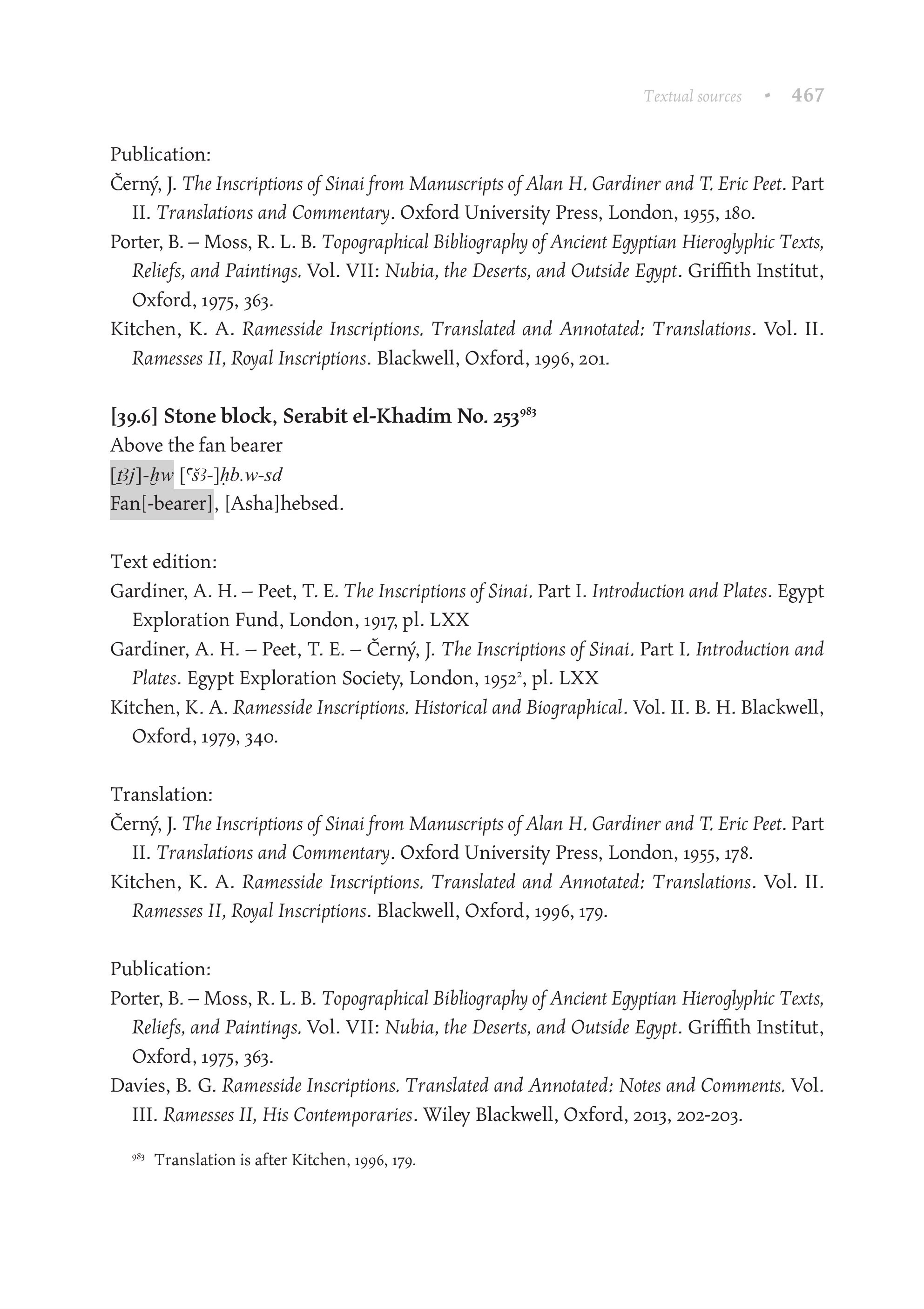 Publication: Cerny, J. The Inscriptions of Sinai from Manuscripts of Alan H. Gardiner and T. Eric Peet. Part Il. Translations and Commentary. Oxford University Press, London, 1955, 180. Porter, B. — Moss, R. L. B. Topographical Bibliography of Ancient Egyptian Hieroglyphic Texts, Reliefs, and Paintings. Vol. VII: Nubia, the Deserts, and Outside Egypt. Griffith Institut, Oxford, 1975, 363. Kitchen, K. A. Ramesside Inscriptions. Translated and Annotated: Translations. Vol. II. Ramesses II, Royal Inscriptions. Blackwell, Oxford, 1996, 201. [39.6] Stone block, Serabit el-Khadim No. 253°% Above the fan bearer [67 |-hw [°53-]hb.w-sd Fan|-bearer], [Asha] hebsed. Text edition: Gardiner, A. H. — Peet, T. E. The Inscriptions of Sinai, Part I. Introduction and Plates. Egypt Exploration Fund, London, 1917, pl. LXX Gardiner, A. H. — Peet, T. E. — Cerny, J. The Inscriptions of Sinai. Part I. Introduction and Plates. Egypt Exploration Society, London, 1952”, pl. LXX Kitchen, K. A. Ramesside Inscriptions. Historical and Biographical. Vol. II. B. H. Blackwell, Oxford, 1979, 340. Translation: Cerny, J. The Inscriptions of Sinai from Manuscripts of Alan H. Gardiner and T. Eric Peet. Part II. Translations and Commentary. Oxford University Press, London, 1955, 178. Kitchen, K. A. Ramesside Inscriptions. Translated and Annotated: Translations. Vol. II. Ramesses II, Royal Inscriptions. Blackwell, Oxford, 1996, 179. Publication: Porter, B. — Moss, R. L. B. Topographical Bibliography of Ancient Egyptian Hieroglyphic Texts, Reliefs, and Paintings. Vol. VII: Nubia, the Deserts, and Outside Egypt. Griffith Institut, Oxford, 1975, 363. Davies, B. G. Ramesside Inscriptions. Translated and Annotated: Notes and Comments, Vol. III. Ramesses II, His Contemporaries. Wiley Blackwell, Oxford, 2013, 202-203. »3 Translation is after Kitchen, 1996, 179.