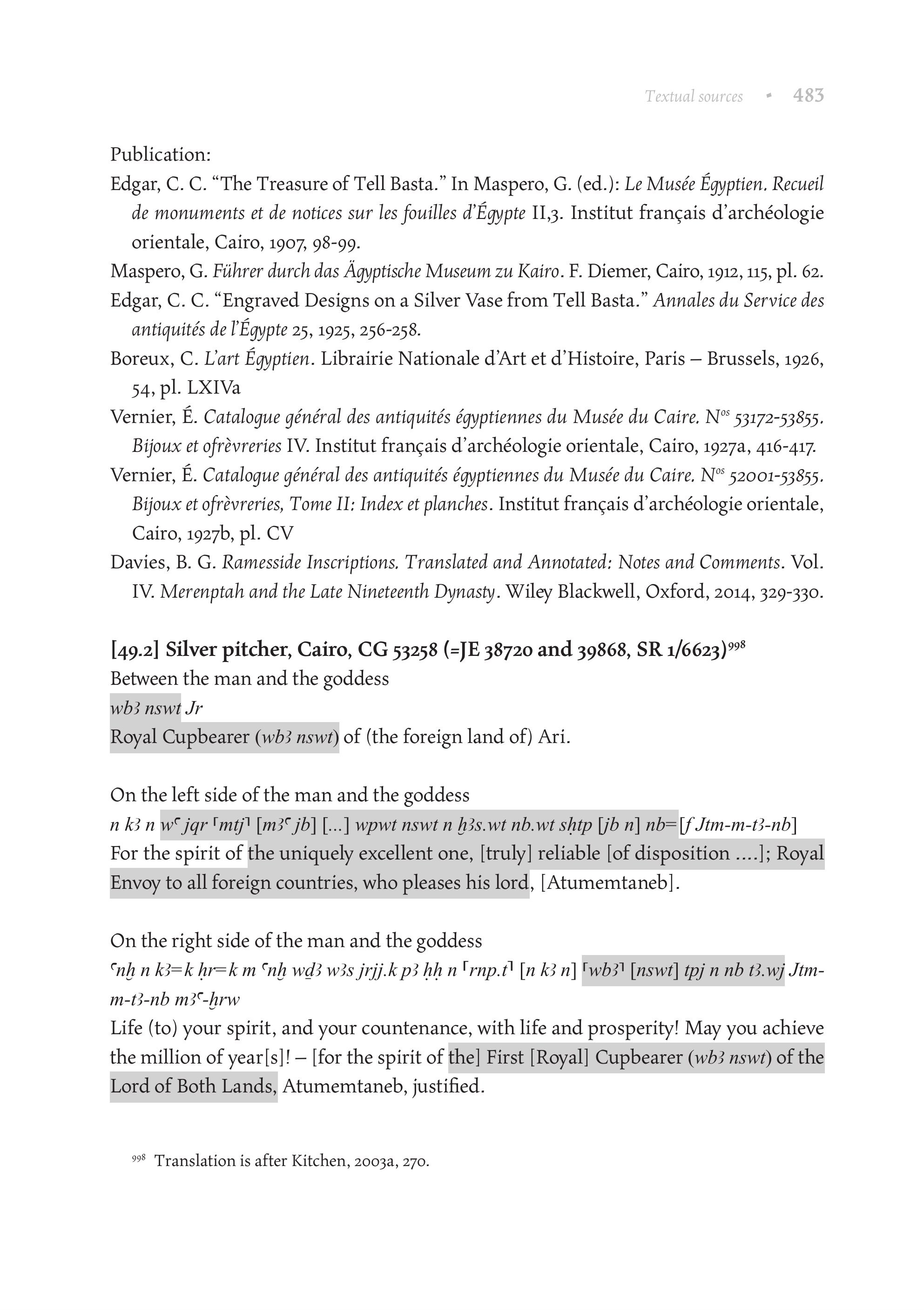 Publication: Edgar, C. C. “The Treasure of Tell Basta.” In Maspero, G. (ed.): Le Musée Egyptien. Recueil de monuments et de notices sur les fouilles d'Égypte 11,3. Institut francais d’archéologie orientale, Cairo, 1907, 98-99. Maspero, G. Führer durch das Ägyptische Museum zu Kairo. F. Diemer, Cairo, 1912, 115, pl. 62. Edgar, C. C. “Engraved Designs on a Silver Vase from Tell Basta.” Annales du Service des antiquités de l'Égypte 25, 1925, 256-258. Boreux, C. L'art Égyptien. Librairie Nationale d’Art et d'Histoire, Paris — Brussels, 1926, 54, pl. LXIVa Vernier, E. Catalogue général des antiquités égyptiennes du Musée du Caire, N° 53172-53855. Bijoux et ofrèvreries IV. Institut français d’archéologie orientale, Cairo, 1927a, 416-417. Vernier, É. Catalogue général des antiquités égyptiennes du Musée du Caire, N° 52001-53855. Bijoux et ofrévreries, Tome II: Index et planches. Institut français d'archéologie orientale, Cairo, 1927b, pl. CV Davies, B. G. Ramesside Inscriptions. Translated and Annotated: Notes and Comments. Vol. IV. Merenptah and the Late Nineteenth Dynasty. Wiley Blackwell, Oxford, 2014, 329-330. [49.2] Silver pitcher, Cairo, CG 53258 (=JE 38720 and 39868, SR 1/6623)” Between the man and the goddess wb3 nswt Jr Royal Cupbearer (wb3 nswt) of (the foreign land of) Ari. On the left side of the man and the goddess n k3 n w“ jgr \mtj! [m3° jb] |...] wpwt nswt n h3s.wt nb.wt shtp [jb n| nb=[f Jtm-m-t3-nb] For the spirit of the uniquely excellent one, [truly] reliable [of disposition ....]; Royal Envoy to all foreign countries, who pleases his lord, [Atumemtaneb]. On the right side of the man and the goddess nh n =k hr=k m ‘nh wa w3s jrij.k p3 hh n 'rnp.t! [n 13 n] wb) [nswt] tpj n nb B.wj Jtmm-B-nb m3°-hrw Life (to) your spirit, and your countenance, with life and prosperity! May you achieve the million of year[s]! — [for the spirit of the] First [Royal] Cupbearer (wb3 nswt) of the Lord of Both Lands, Atumemtaneb, justified. % Translation is after Kitchen, 2003a, 270.