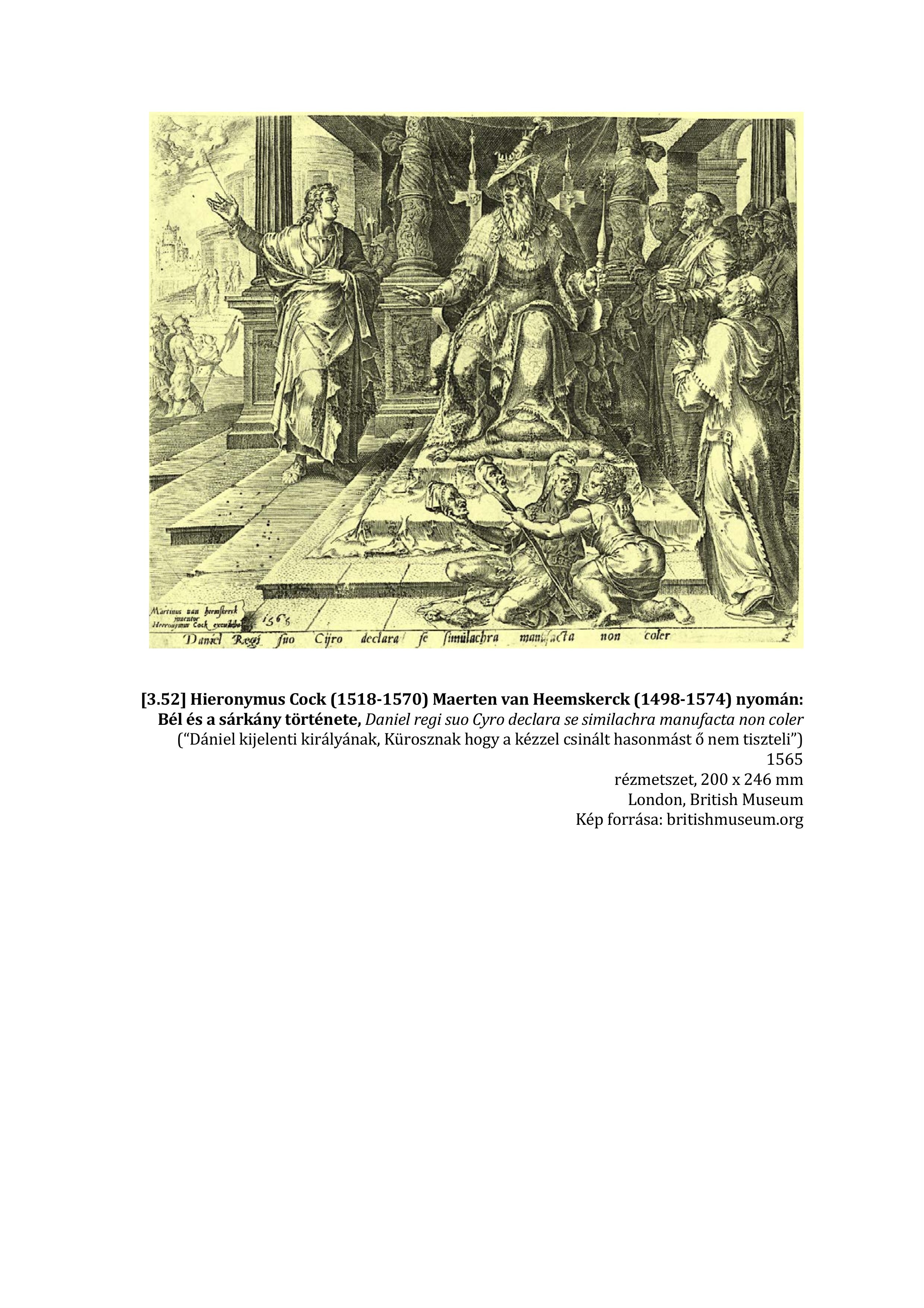 > Dame Regi Jüo Cÿro declara" je Timila [3.52] Hieronymus Cock (1518-1570) Maerten van Heemskerck (1498-1574) nyomán: Bél és a sárkány története, Daniel regi suo Cyro declara se similachra manufacta non coler ( Dániel kijelenti királyának, Kürosznak hogy a kézzel csinált hasonmást ő nem tiszteli") 1565 rézmetszet, 200 x 246 mm London, British Museum Kep forräsa: britishmuseum.org