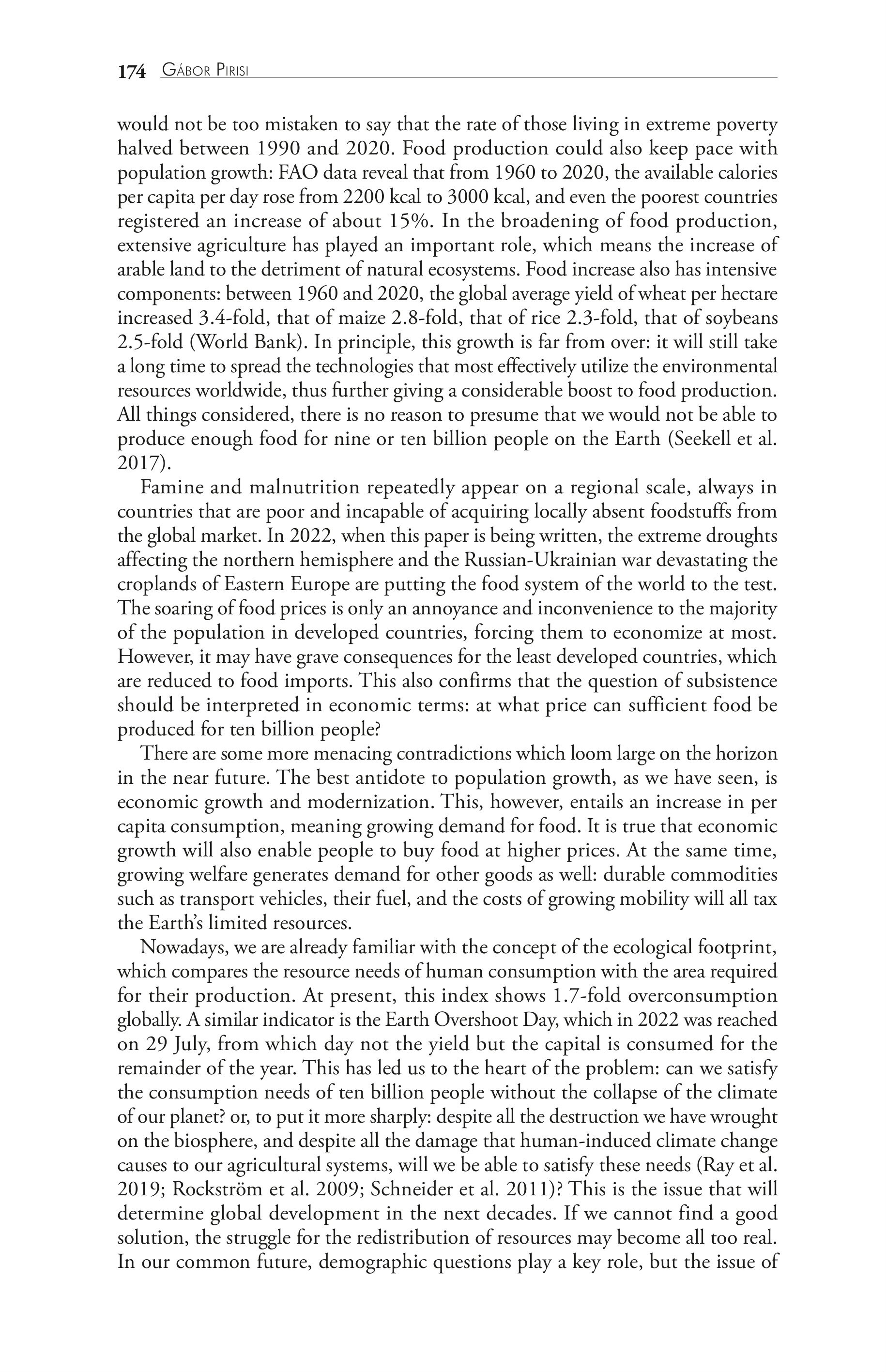 174 GÁBOR PIRISI would not be too mistaken to say that the rate of those living in extreme poverty halved between 1990 and 2020. Food production could also keep pace with population growth: FAO data reveal that from 1960 to 2020, the available calories per capita per day rose from 2200 kcal to 3000 kcal, and even the poorest countries registered an increase of about 1590. In the broadening of food production, extensive agriculture has played an important role, which means the increase of arable land to the detriment of natural ecosystems. Food increase also has intensive components: between 1960 and 2020, the global average yield of wheat per hectare increased 3.4-fold, that of maize 2.8-fold, that of rice 2.3-fold, that of soybeans 2.5-fold (World Bank). In principle, this growth is far from over: it will still take a long time to spread the technologies that most effectively utilize the environmental resources worldwide, thus further giving a considerable boost to food production. All things considered, there is no reason to presume that we would not be able to produce enough food for nine or ten billion people on the Earth (Seekell et al. 2017). Famine and malnutrition repeatedly appear on a regional scale, always in countries that are poor and incapable of acquiring locally absent foodstuffs from the global market. In 2022, when this paper is being written, the extreme droughts affecting the northern hemisphere and the Russian-Ukrainian war devastating the croplands of Eastern Europe are putting the food system of the world to the test. The soaring of food prices is only an annoyance and inconvenience to the majority of the population in developed countries, forcing them to economize at most. However, it may have grave consequences for the least developed countries, which are reduced to food imports. This also confirms that the question of subsistence should be interpreted in economic terms: at what price can sufficient food be produced for ten billion people? There are some more menacing contradictions which loom large on the horizon in the near future. The best antidote to population growth, as we have seen, is economic growth and modernization. This, however, entails an increase in per capita consumption, meaning growing demand for food. It is true that economic growth will also enable people to buy food at higher prices. At the same time, growing welfare generates demand for other goods as well: durable commodities such as transport vehicles, their fuel, and the costs of growing mobility will all tax the Earth's limited resources. Nowadays, we are already familiar with the concept of the ecological footprint, which compares the resource needs of human consumption with the area required for their production. At present, this index shows 1.7-fold overconsumption globally. A similar indicator is the Earth Overshoot Day, which in 2022 was reached on 29 July, from which day not the yield but the capital is consumed for the remainder of the year. This has led us to the heart of the problem: can we satisfy the consumption needs of ten billion people without the collapse of the climate of our planet? or, to put it more sharply: despite all the destruction we have wrought on the biosphere, and despite all the damage that human-induced climate change causes to our agricultural systems, will we be able to satisfy these needs (Ray et al. 2019; Rockström et al. 2009; Schneider et al. 2011)? This is the issue that will determine global development in the next decades. If we cannot find a good solution, the struggle for the redistribution of resources may become all too real. In our common future, demographic questions play a key role, but the issue of