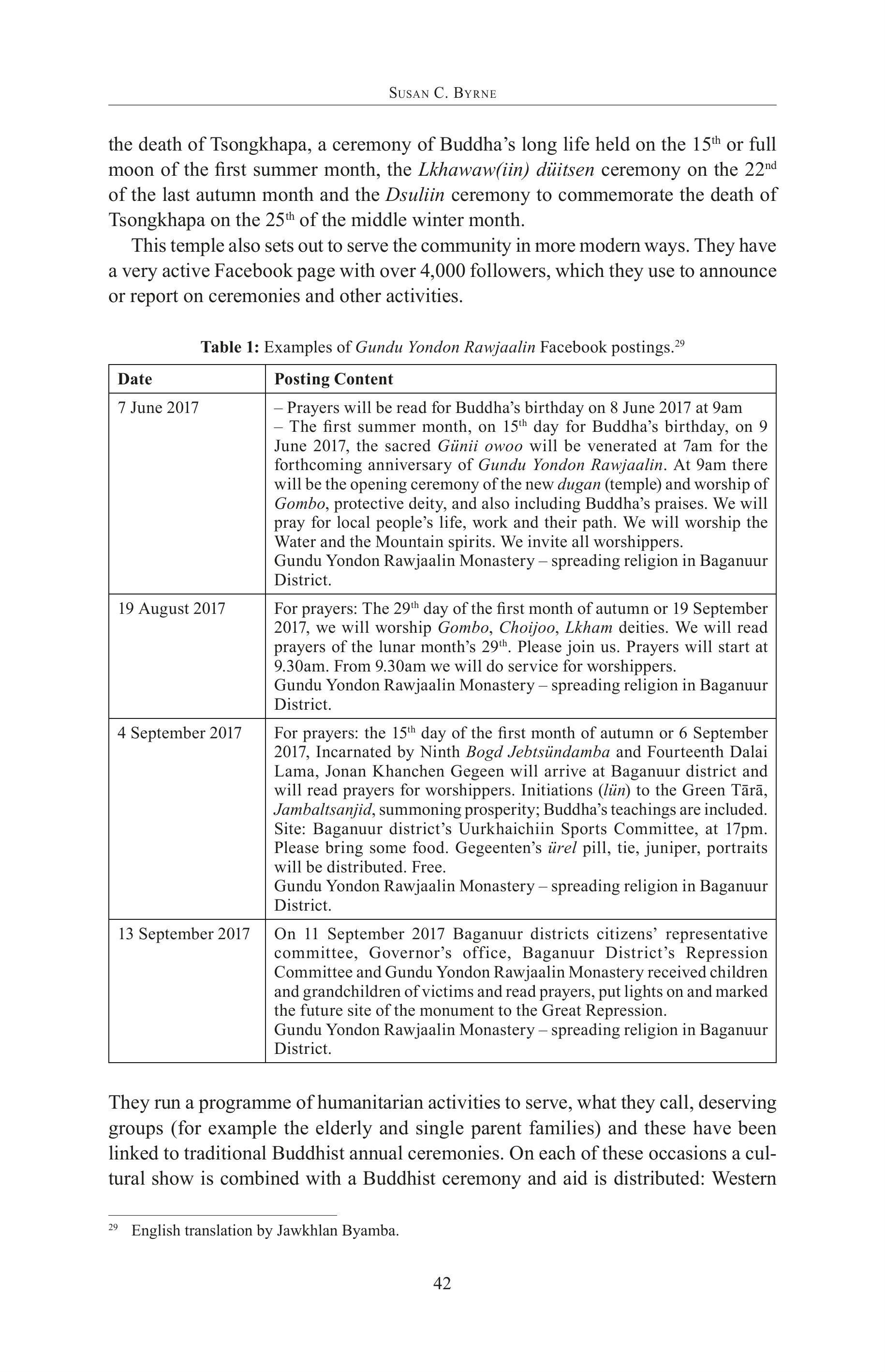 SUSAN C. BYRNE Date Posting Content 7 June 2017 — Prayers will be read for Buddha’s birthday on 8 June 2017 at 9am — The first summer month, on 15" day for Buddha’s birthday, on 9 June 2017, the sacred Giinii owoo will be venerated at 7am for the forthcoming anniversary of Gundu Yondon Rawjaalin. At 9am there will be the opening ceremony of the new dugan (temple) and worship of Gombo, protective deity, and also including Buddha’s praises. We will pray for local people’s life, work and their path. We will worship the Water and the Mountain spirits. We invite all worshippers. Gundu Yondon Rawjaalin Monastery — spreading religion in Baganuur District. 19 August 2017 For prayers: The 29" day of the first month of autumn or 19 September 2017, we will worship Gombo, Choijoo, Lkham deities. We will read prayers of the lunar month’s 29". Please join us. Prayers will start at 9.30am. From 9.30am we will do service for worshippers. Gundu Yondon Rawjaalin Monastery — spreading religion in Baganuur District. 4 September 2017 For prayers: the 15" day of the first month of autumn or 6 September 2017, Incarnated by Ninth Bogd Jebtsiindamba and Fourteenth Dalai Lama, Jonan Khanchen Gegeen will arrive at Baganuur district and will read prayers for worshippers. Initiations (/iin) to the Green Tara, Jambaltsanjid, summoning prosperity; Buddha’s teachings are included. Site: Baganuur district’s Uurkhaichiin Sports Committee, at 17pm. Please bring some food. Gegeenten’s ürel pill, tie, juniper, portraits will be distributed. Free. Gundu Yondon Rawjaalin Monastery — spreading religion in Baganuur District. 13 September 2017 On 11 September 2017 Baganuur districts citizens’ representative committee, Governor’s office, Baganuur District’s Repression Committee and Gundu Yondon Rawjaalin Monastery received children and grandchildren of victims and read prayers, put lights on and marked the future site of the monument to the Great Repression. Gundu Yondon Rawjaalin Monastery — spreading religion in Baganuur District. 29 42