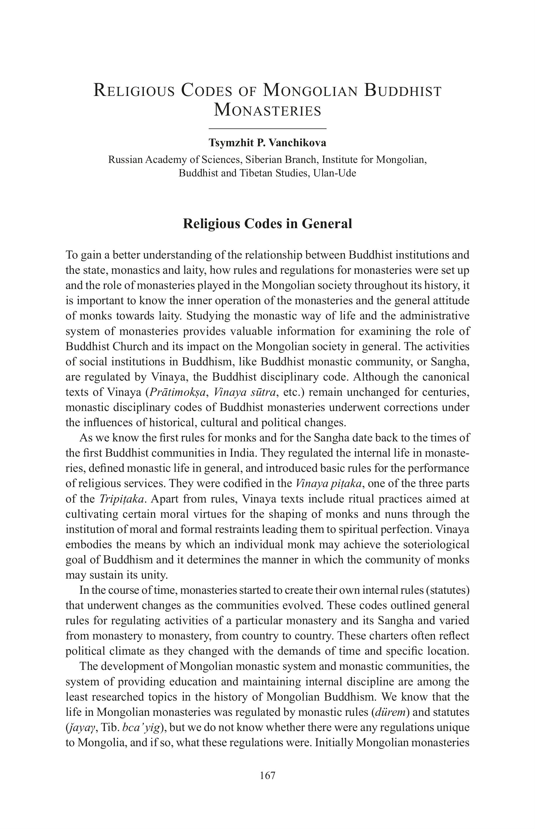 RELIGIOUS CODES OF MONGOLIAN BUDDHIST MONASTERIES Tsymzhit P. Vanchikova Russian Academy of Sciences, Siberian Branch, Institute for Mongolian, Buddhist and Tibetan Studies, Ulan-Ude Religious Codes in General To gain a better understanding of the relationship between Buddhist institutions and the state, monastics and laity, how rules and regulations for monasteries were set up and the role of monasteries played in the Mongolian society throughout its history, it is important to know the inner operation of the monasteries and the general attitude of monks towards laity. Studying the monastic way of life and the administrative system of monasteries provides valuable information for examining the role of Buddhist Church and its impact on the Mongolian society in general. The activities of social institutions in Buddhism, like Buddhist monastic community, or Sangha, are regulated by Vinaya, the Buddhist disciplinary code. Although the canonical texts of Vinaya (Pratimoksa, Vinaya sitra, etc.) remain unchanged for centuries, monastic disciplinary codes of Buddhist monasteries underwent corrections under the influences of historical, cultural and political changes. As we know the first rules for monks and for the Sangha date back to the times of the first Buddhist communities in India. They regulated the internal life in monasteries, defined monastic life in general, and introduced basic rules for the performance of religious services. They were codified in the Vinaya pitaka, one of the three parts of the Tripitaka. Apart from rules, Vinaya texts include ritual practices aimed at cultivating certain moral virtues for the shaping of monks and nuns through the institution of moral and formal restraints leading them to spiritual perfection. Vinaya embodies the means by which an individual monk may achieve the soteriological goal of Buddhism and it determines the manner in which the community of monks may sustain its unity. In the course oftime, monasteries started to create their own internal rules (statutes) that underwent changes as the communities evolved. These codes outlined general rules for regulating activities of a particular monastery and its Sangha and varied from monastery to monastery, from country to country. These charters often reflect political climate as they changed with the demands of time and specific location. The development of Mongolian monastic system and monastic communities, the system of providing education and maintaining internal discipline are among the least researched topics in the history of Mongolian Buddhism. We know that the life in Mongolian monasteries was regulated by monastic rules (dürem) and statutes (jayay, Tib. bca’yig), but we do not know whether there were any regulations unique to Mongolia, and if so, what these regulations were. Initially Mongolian monasteries 167