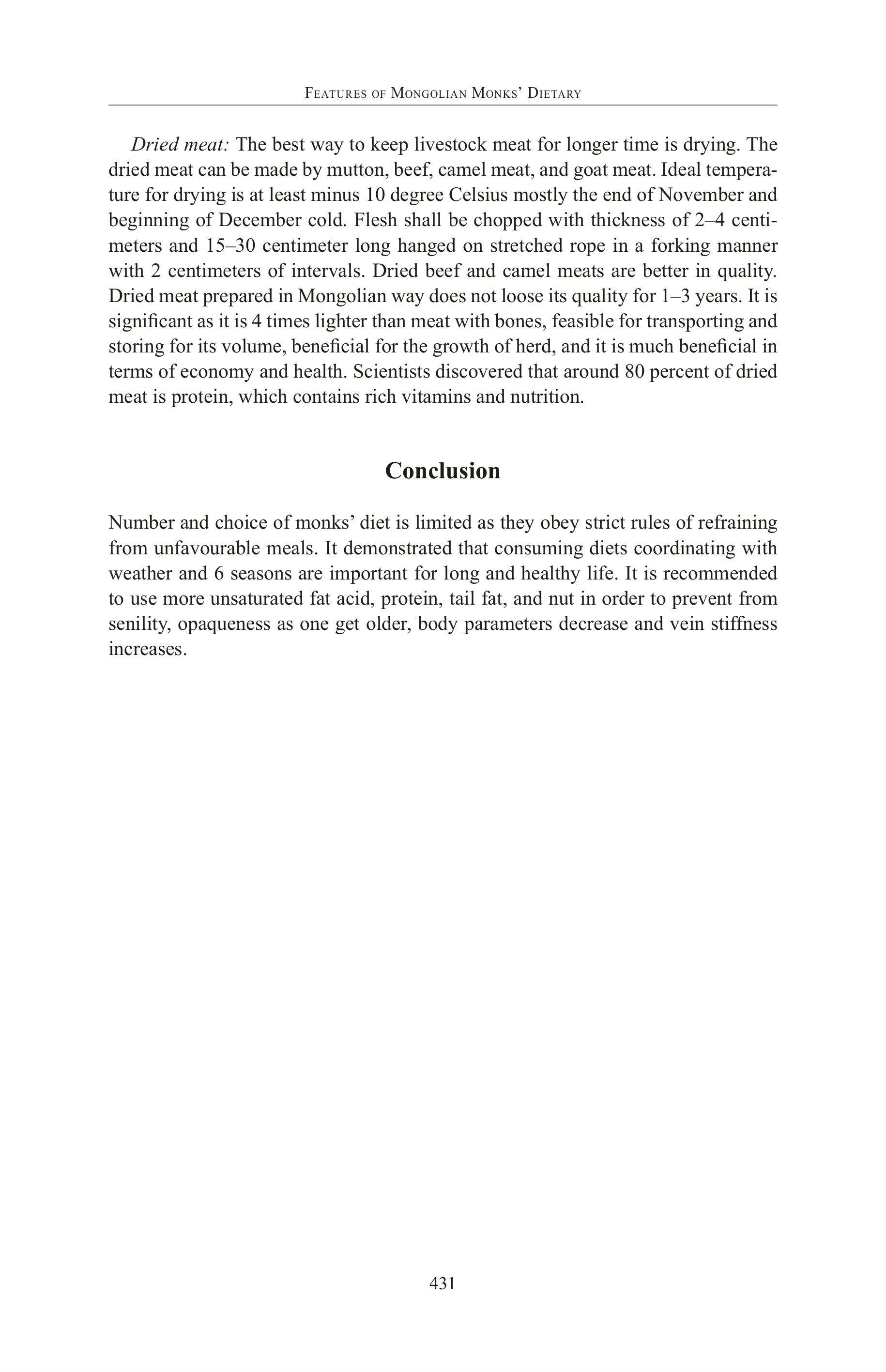 FEATURES OF MONGOLIAN Monks’ DIETARY Dried meat: The best way to keep livestock meat for longer time is drying. The dried meat can be made by mutton, beef, camel meat, and goat meat. Ideal temperature for drying is at least minus 10 degree Celsius mostly the end of November and beginning of December cold. Flesh shall be chopped with thickness of 2-4 centimeters and 15-30 centimeter long hanged on stretched rope in a forking manner with 2 centimeters of intervals. Dried beef and camel meats are better in quality. Dried meat prepared in Mongolian way does not loose its quality for 1-3 years. It is significant as it is 4 times lighter than meat with bones, feasible for transporting and storing for its volume, beneficial for the growth of herd, and it is much beneficial in terms of economy and health. Scientists discovered that around 80 percent of dried meat is protein, which contains rich vitamins and nutrition. Conclusion Number and choice of monks’ diet is limited as they obey strict rules of refraining from unfavourable meals. It demonstrated that consuming diets coordinating with weather and 6 seasons are important for long and healthy life. It is recommended to use more unsaturated fat acid, protein, tail fat, and nut in order to prevent from senility, opaqueness as one get older, body parameters decrease and vein stiffness increases. 431